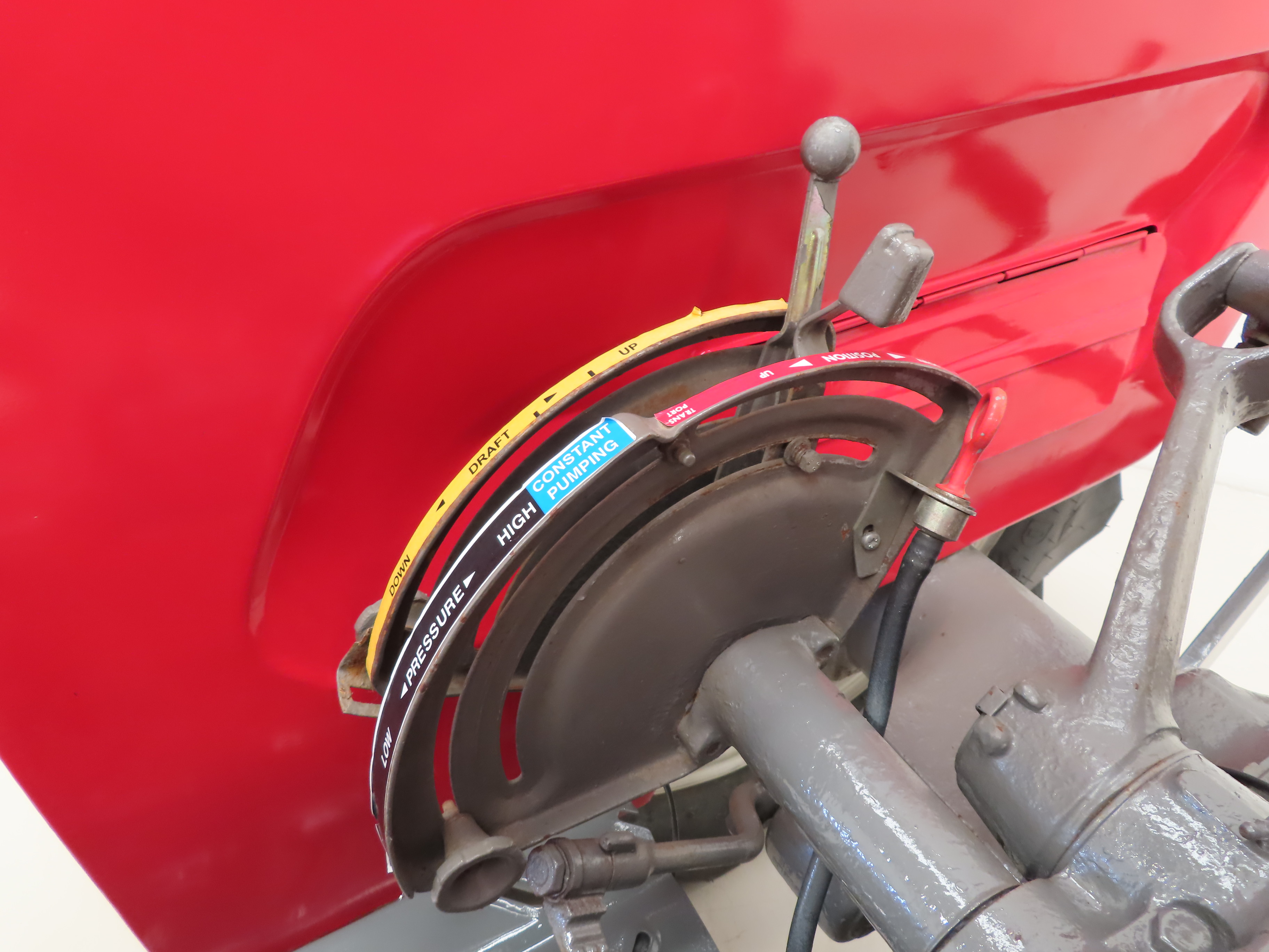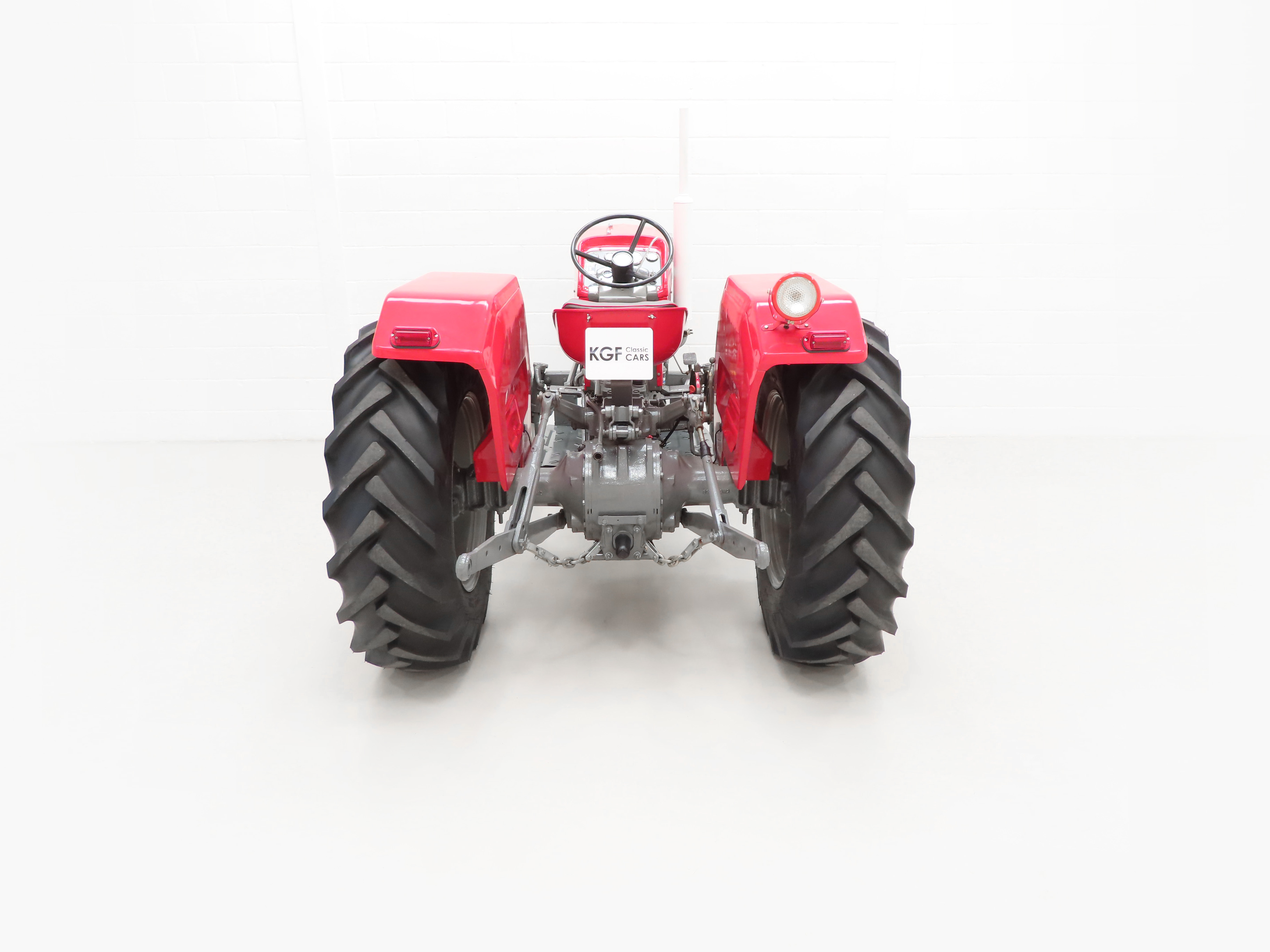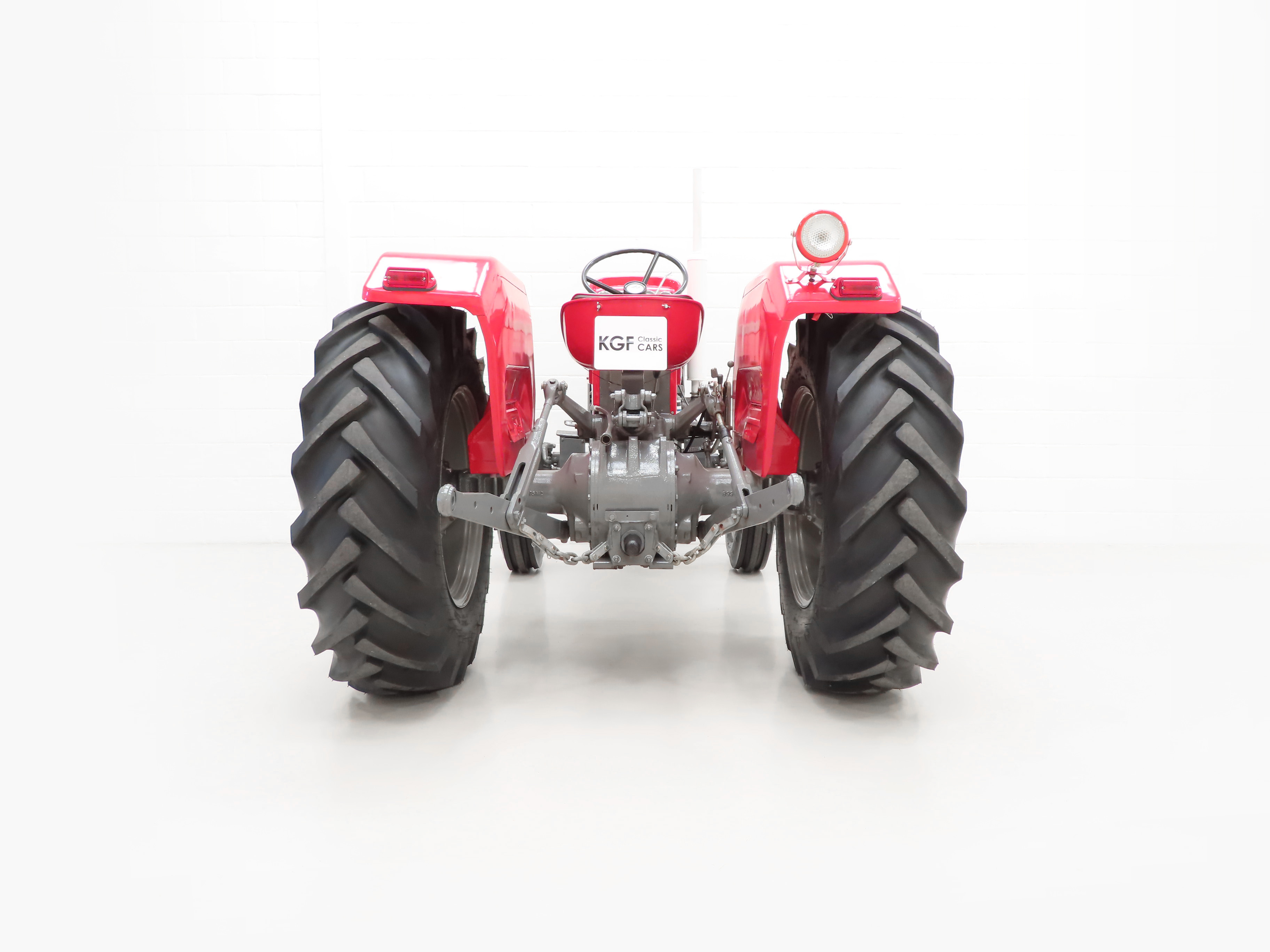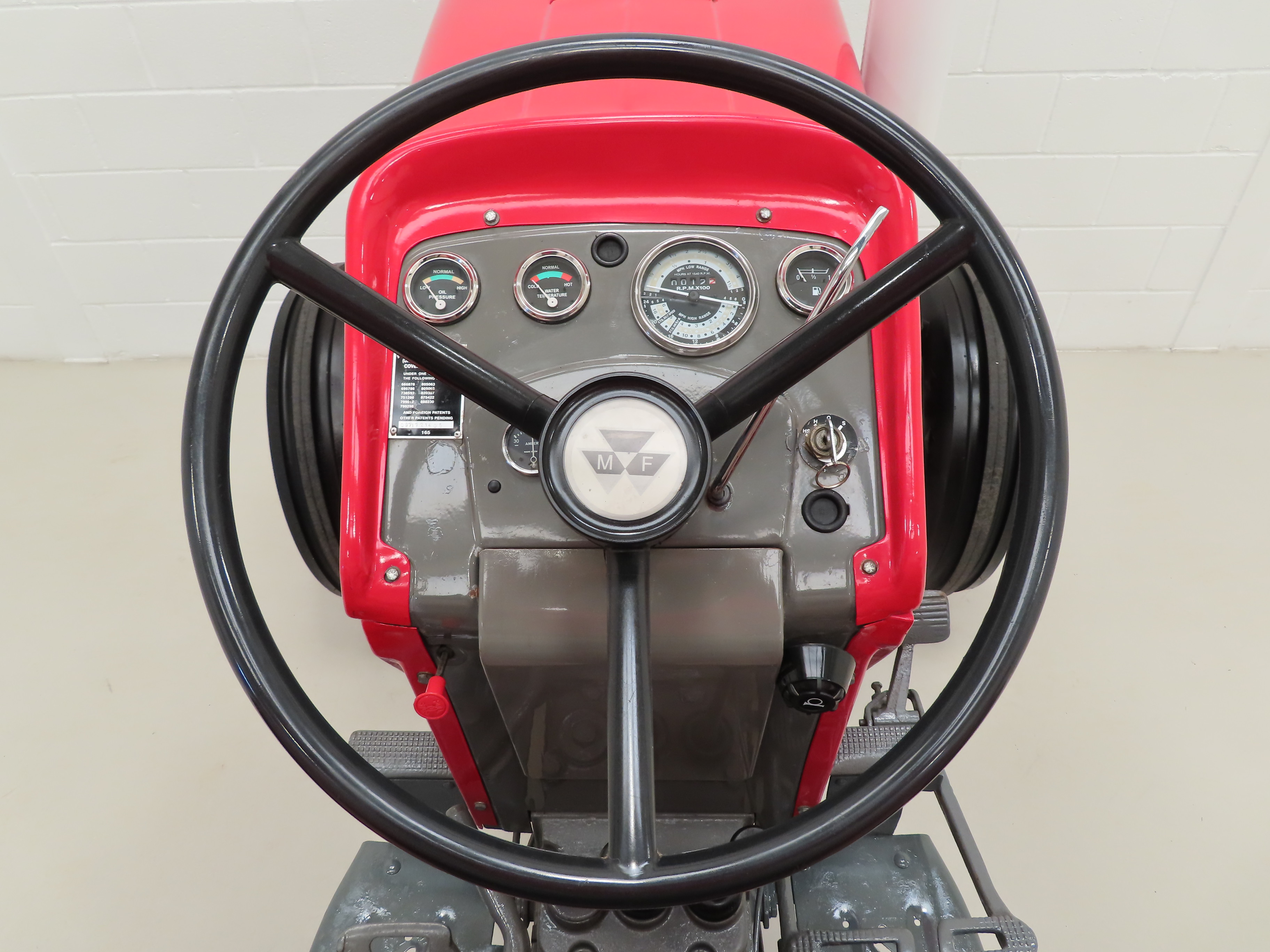 Simplistic and functional, the open operator station is super clean and features a padded tip seat and three spoke steering wheel. Exposed mechanical components and floor sections are bright and clean. All gauges and controls operate perfectly including the high and low range MPH readings and hand throttle. The hydraulic system and MF quadrant are all fully operational and the tractor jumps into life at the first twist of the key! The factory Massey-Ferguson of Coventry, England patent plate is still mounted on the control panel. A clean, unspoilt operator station with daily farm duties a distant memory and now replaced with parade and show duties!