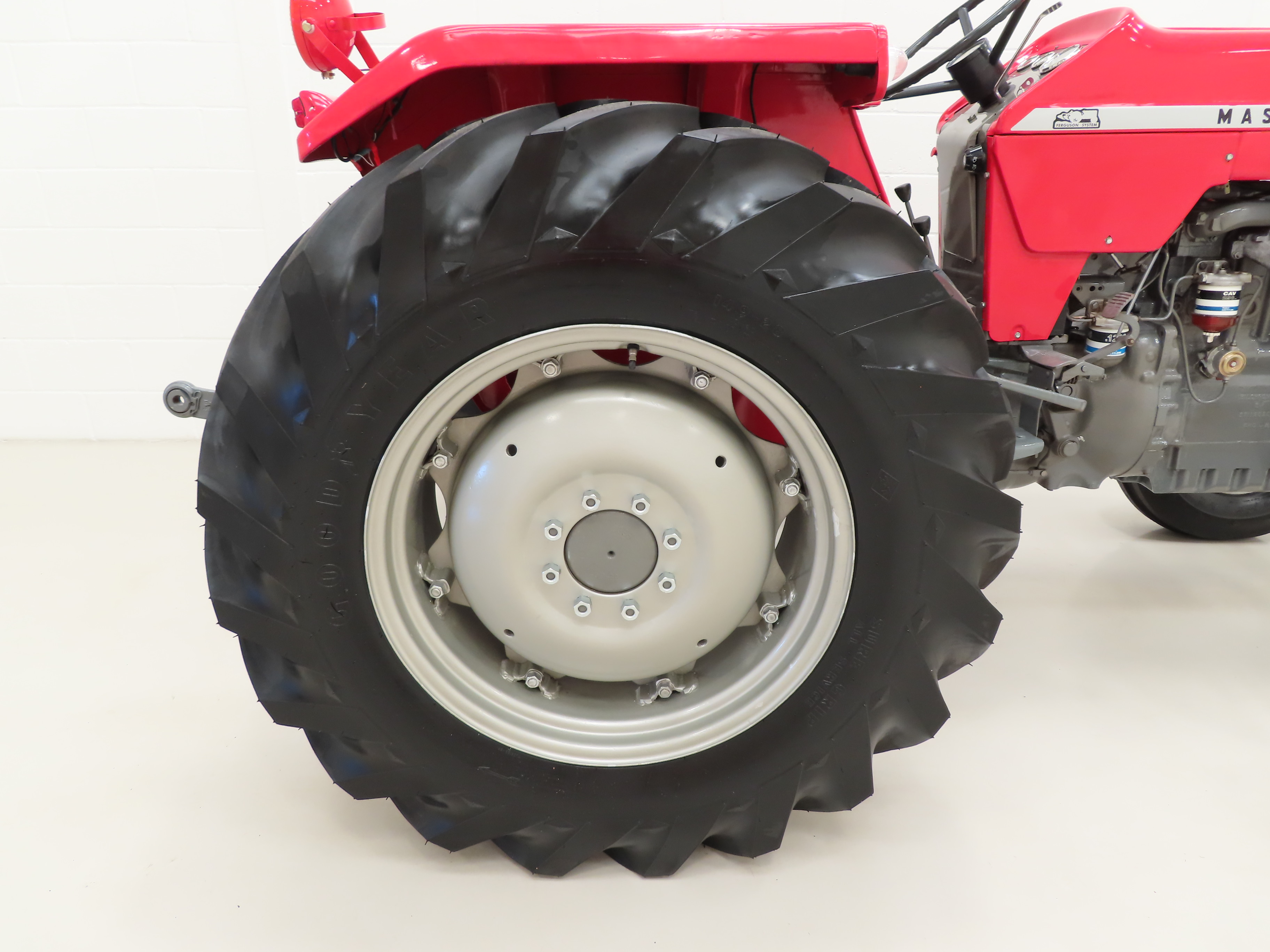 The cast steel wheels are painted to match the Massey Ferguson Grey and feature brand new wheel studs. The 7.50-16 front and 14.9-28 rear tyres have plenty of life left and are premium brand Goodyear all round. The outboard drum brakes operate to the large rear wheels only and via a dual brake pedal which can operate independently or locked together.
