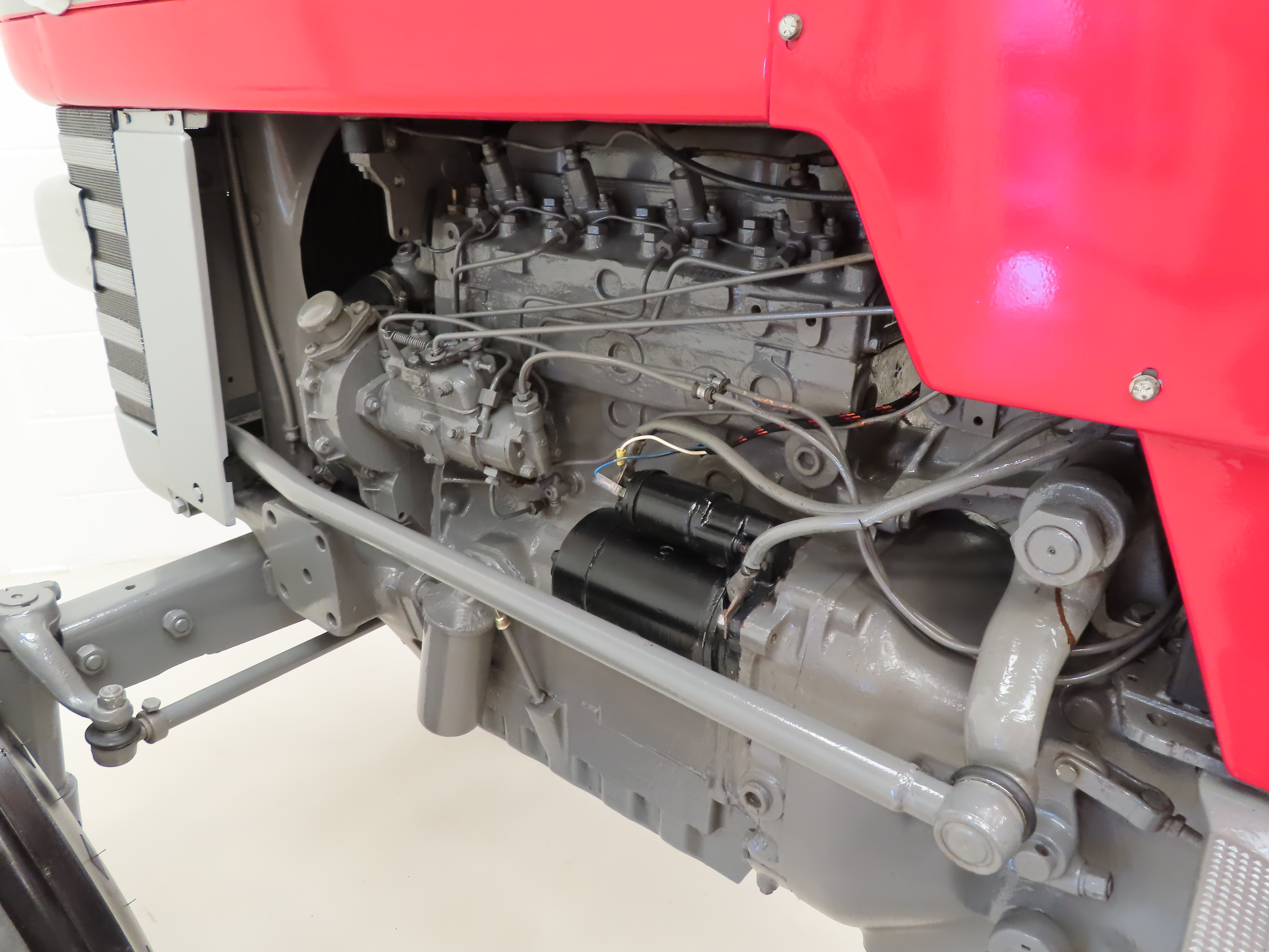 This wonderful 1971 Model MF165 is finished in the factory colour of Massey Ferguson Red to the body panels and Massey Ferguson Grey to the engine, chassis and ancillaries. A full restoration was undertaken ten years ago with the Tractor dry stored since helping to keep the superb aesthetics! The red paintwork is bright and uniform as is the grey and all body panels are fully intact with no notable damage. All lights are fully functional and the Massey Ferguson decals and front grille emblem look superb. The round 165 front fender badges are slightly pitted to the chromed edges. A delightful example of this much revered and iconic vintage Tractor.