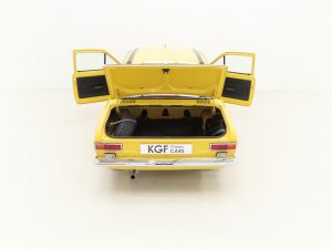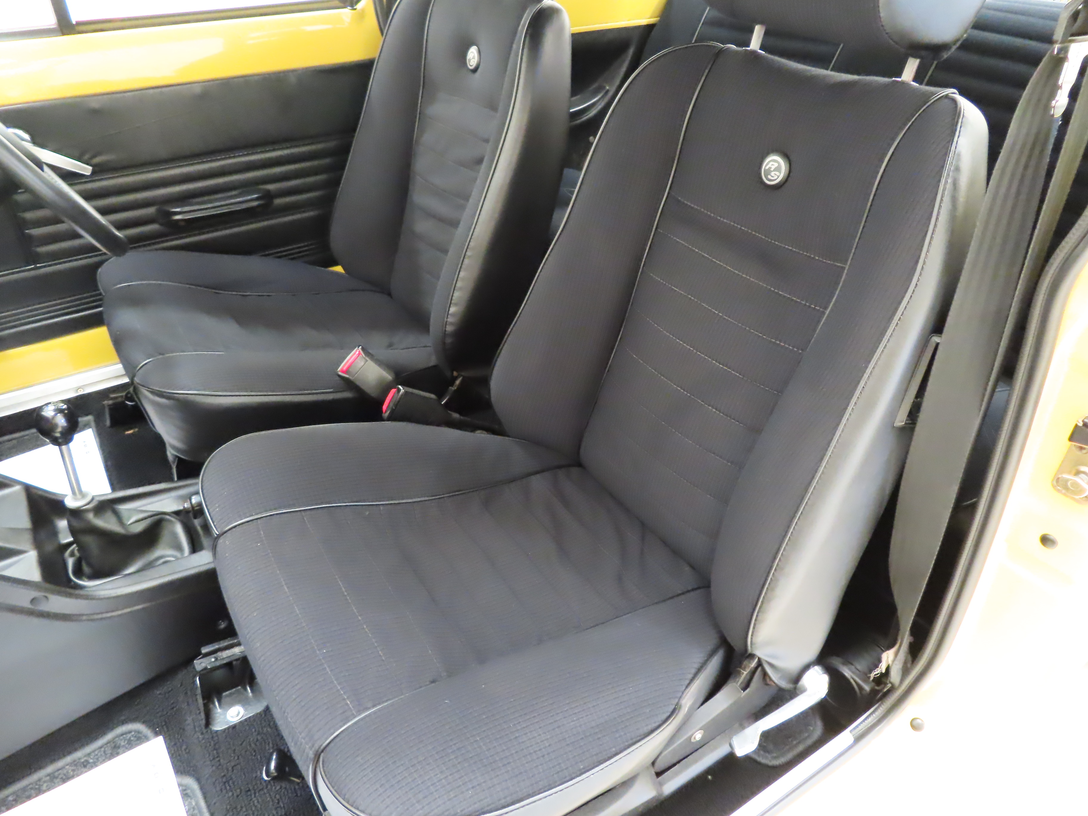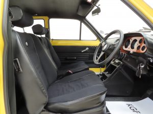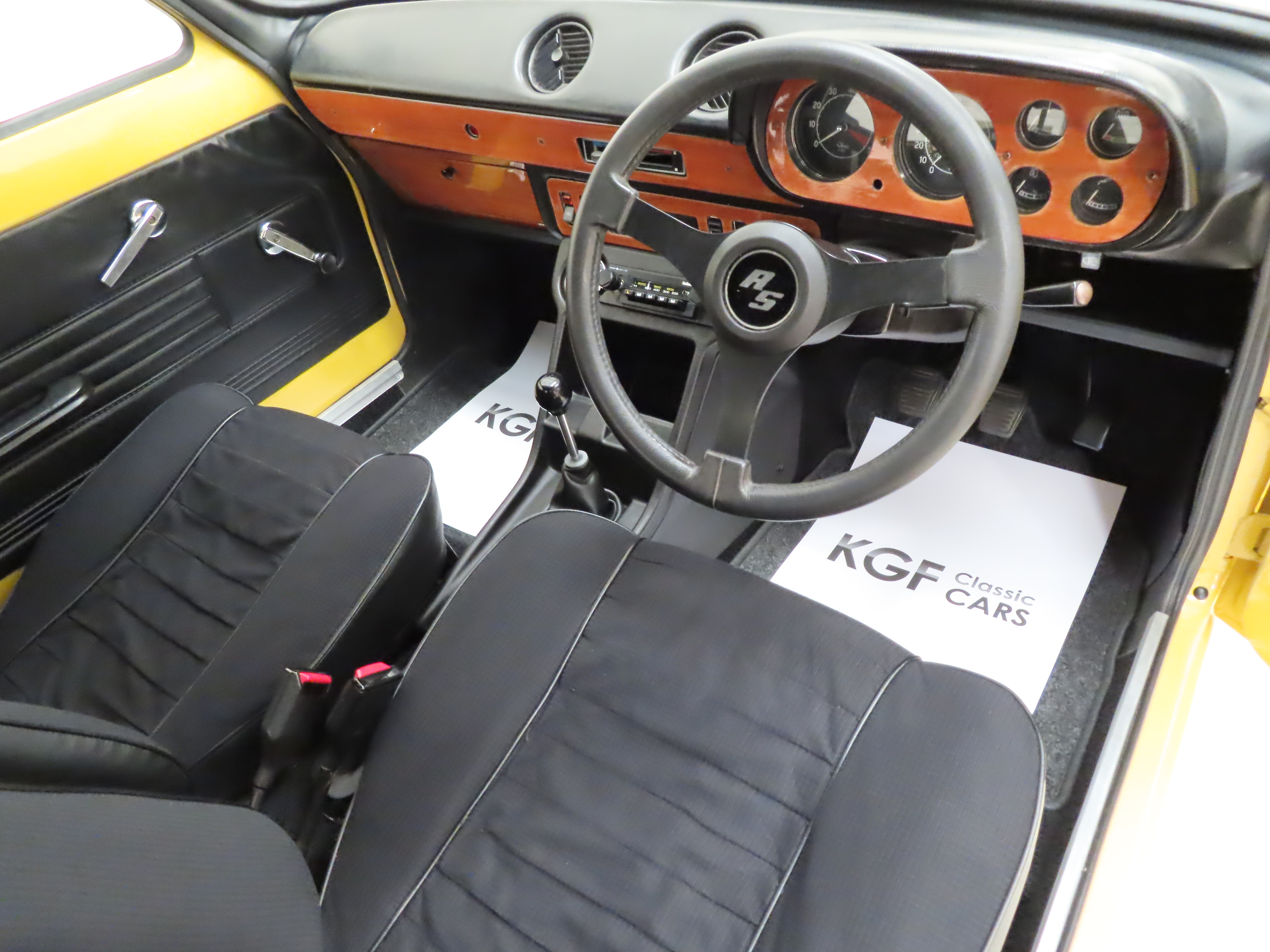 Advanced Vehicle Operations (AVO) Type 49 body, front quarter bumpers, flared wheel arches, strengthened chassis rails, strengthened flitch plates, reinforced front suspension strut top mounting plates, rear radius rods, safety glass, anti-burst locks, black painted aluminium grille, six pod sports binnacle, heater fan, two speed wiper, courtesy light, spare wheel housed in boot. Options; Rally Lighting Pack – 4X Cibie Oscar fog and spot lights with stone guards. Reversing lights, hazard warning flashers, brake warning light, wiper arm spoiler. Custom Pack – Reclining RS front seats, sound deadening material, RS centre console with clock, varnished wood trim panels, heated rear window.