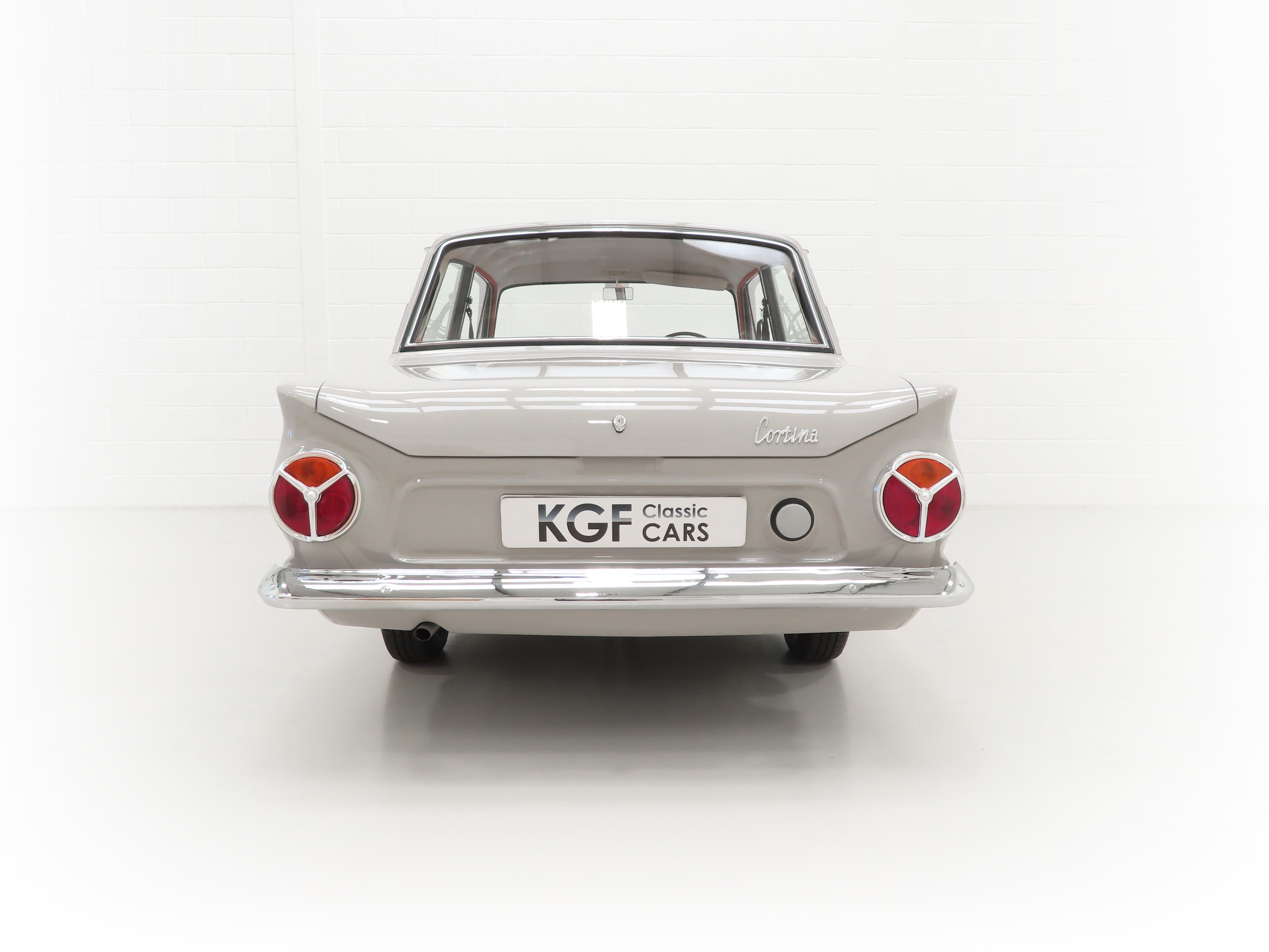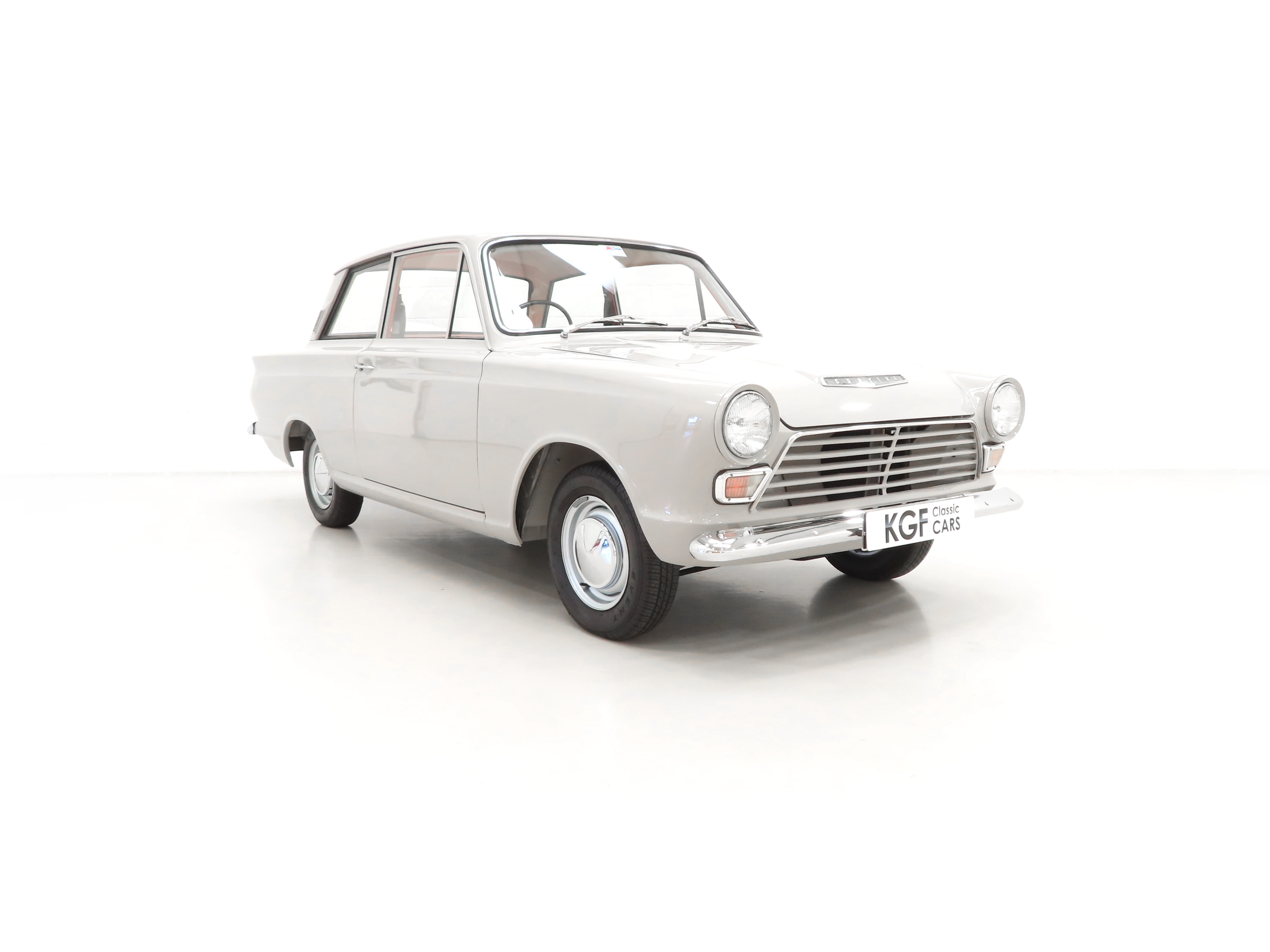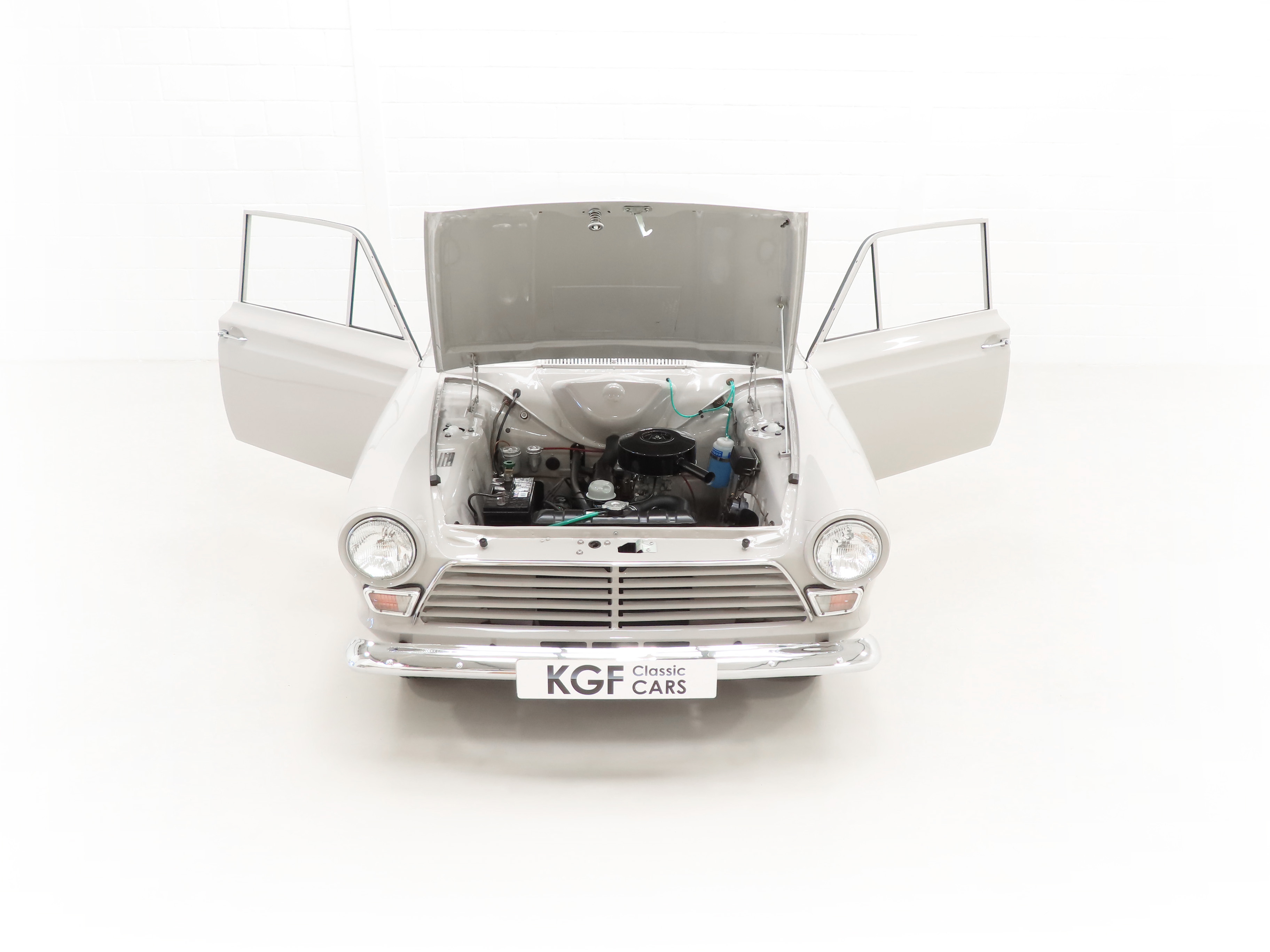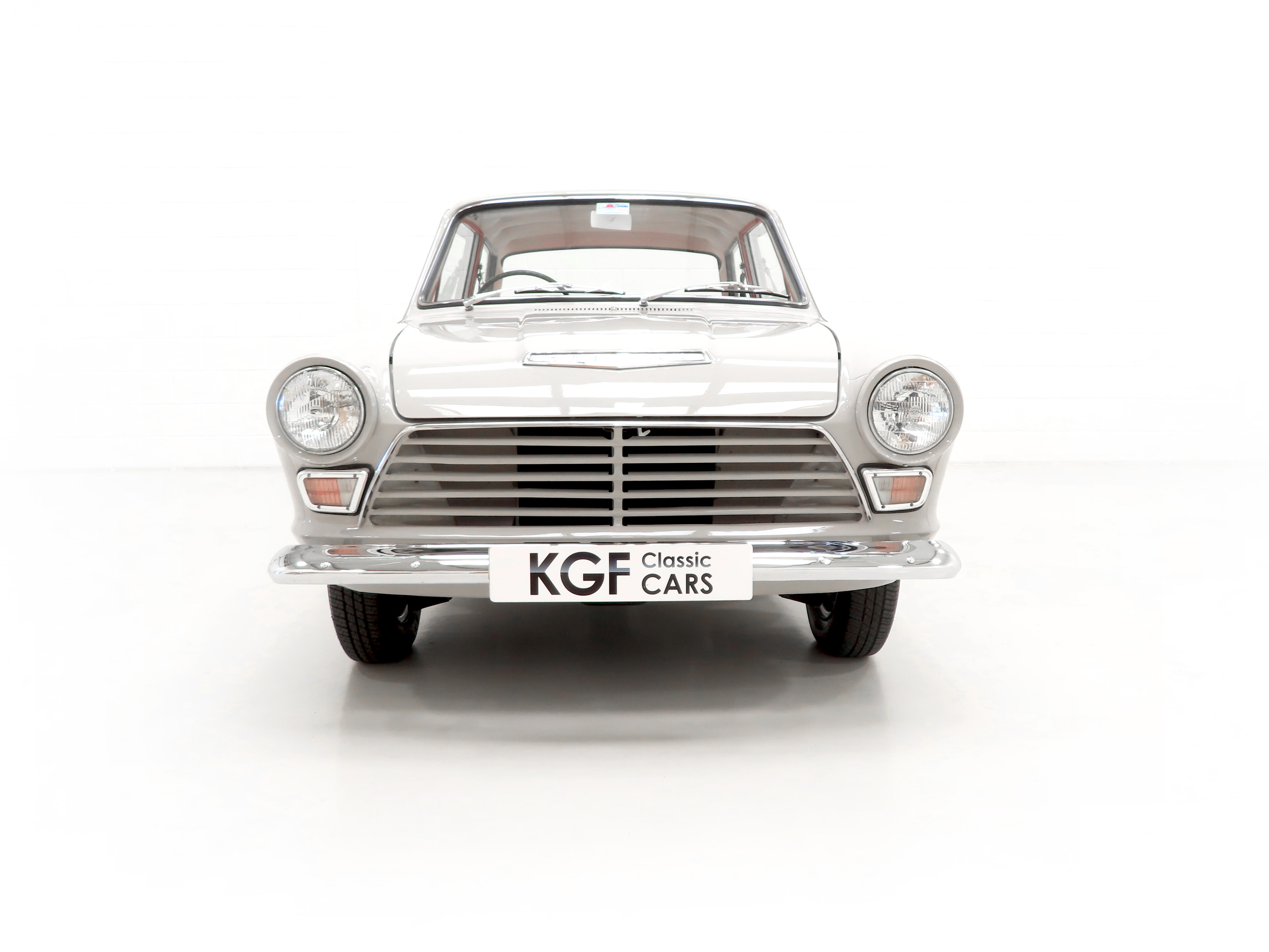 The eye-catching styling of the Mk1 Ford Cortina still holds universal appeal today and was Ford of Britain’s global success story. When Jeremy Clarkson reviews the Ford Cortina Genesis in The Grand Tour Funeral for a Ford, this actual car is the first chapter in what is easily the most important book in British motoring history! (Click Here). Finished in period Purbeck Grey, (Code CH), this example is used to the limelight having been the recipient of numerous MK1 Cortina Owners Club awards including National Supreme Champion. The name Cortina is proudly on display on the bonnet and on the boot lid too in an elegant script style and the underside is beautifully detailed for the show circuit. Distinguishing features of the Fleet Model are all clearly visible, (or not, due to their omission!), and include the body colour grille and extractor louvres on the rear roof for the Aeroflow ventilation system, normally chrome on De Luxe and Super models. A proven celebrity, a proven national winner and one of the rarest Mk1 Cortina’s to survive, can it get much better?