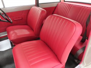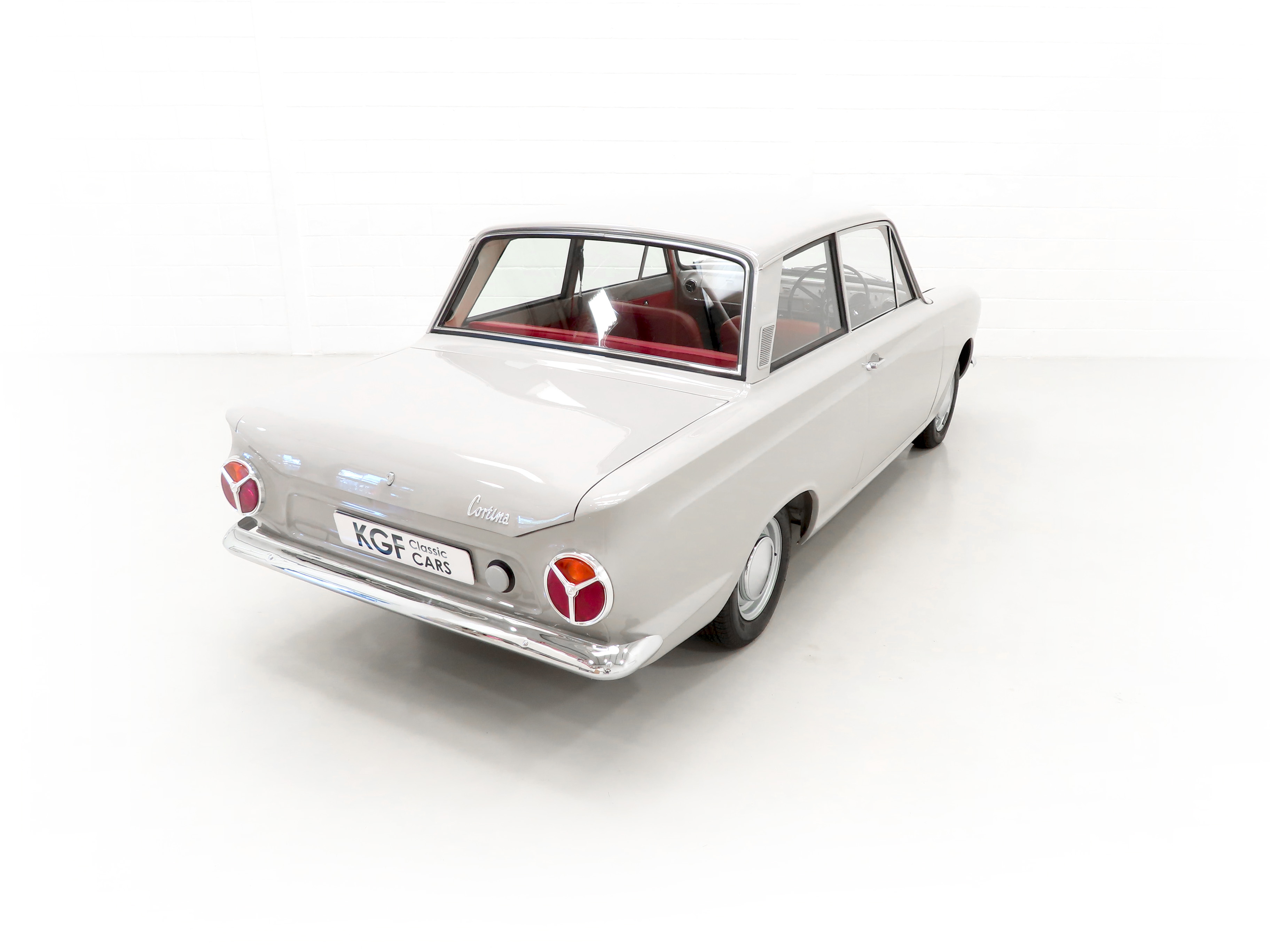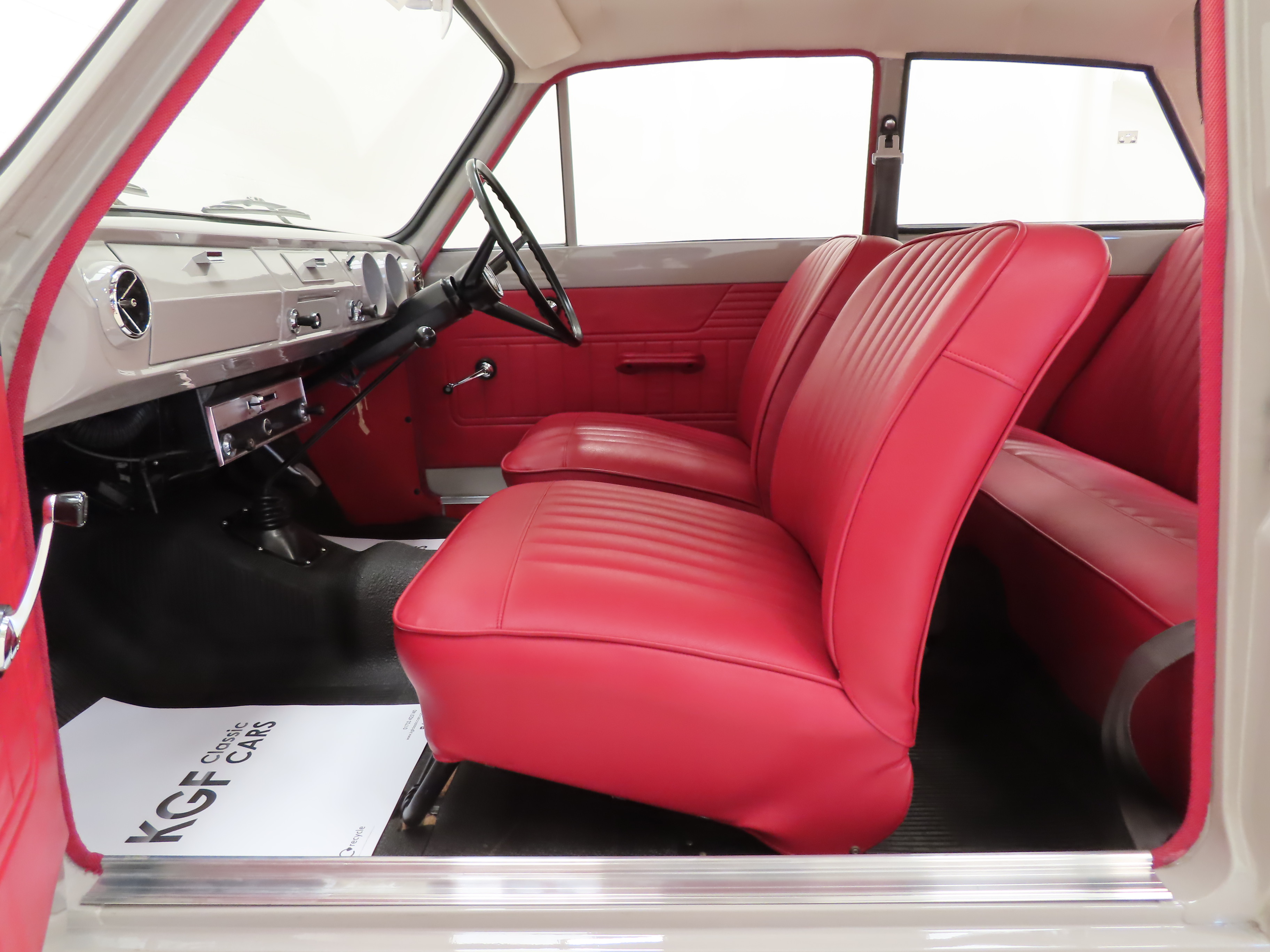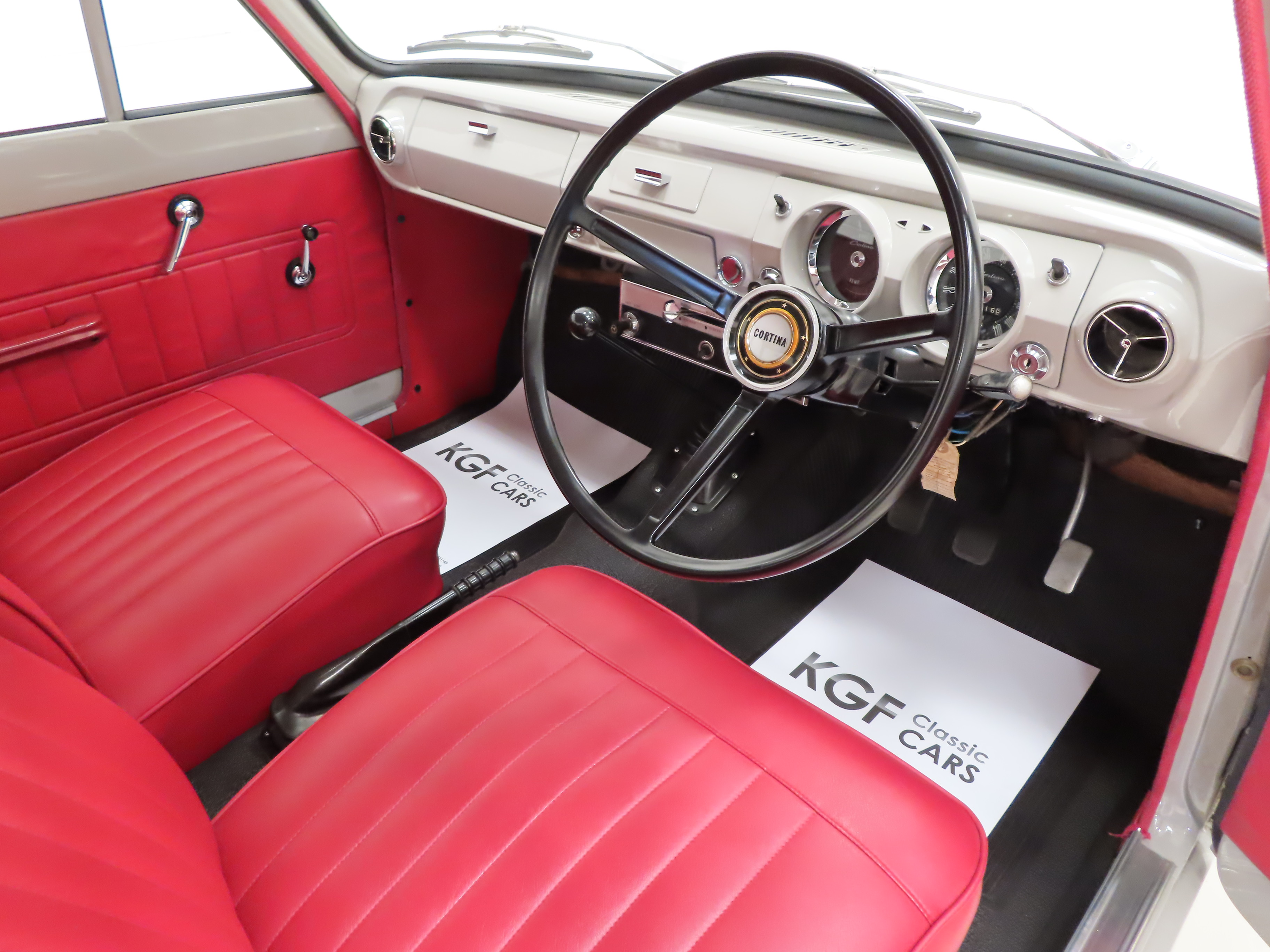 Simple, elegant and immaculately presented in all respects. The PVC upholstery to the deep foamed filled seats finished in Ravenna Red, (Code B413), are unmarked along with the door cards and plastic washable headlining. Being a Standard Cortina Saloon Fleet Model, the flooring has a basic rubber covering, no door operated courtesy lights, only one sun visor and no opening front quarter windows. To further emphasise the simplicity of this rare model, the water temperature gauge has a pictorial gear location diagram! The ornate deep dished safety steering wheel is unmarked and circular cowled instruments all function along with the optional heater and demister. A proven class winner and very obvious to see why.