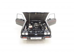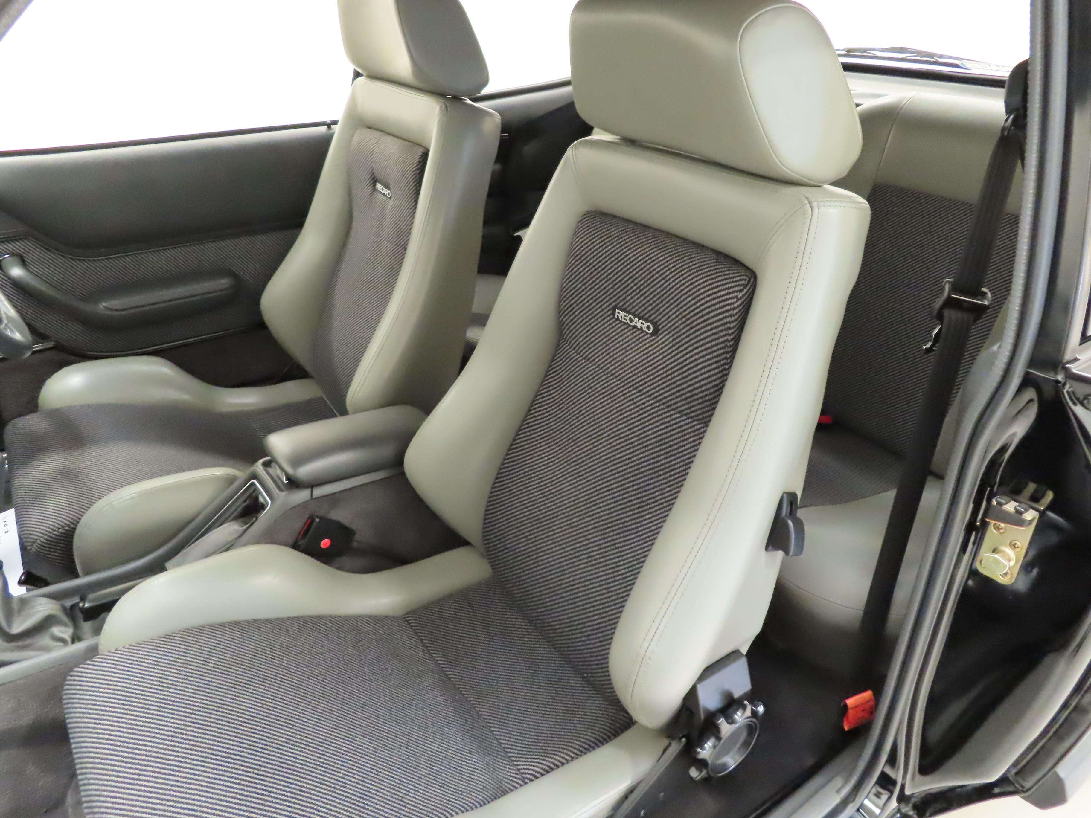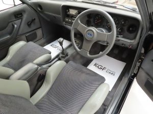 Incredible. Shielded from natural daylight in the owner’s garage and subject to just 6,430 miles usage, the interior is pristine. The supportive Recaro seats in grey high-grade leather with ‘Strobe’ pattern fabric centre panels, (Code Q5), are spotlessly clean with firm seat structure and even have the factory labels are still attached to the runners. The original ESRT 32PS stereo cassette and electric aerial are fully operational as is all other equipment and gauges. The ashtray has never been used but the cover has some tiny marks. The rear seats have never been sat in and the time warp boot area has the build label to the floor and the factory fitted Ford gas struts. The pin straight parcel shelf is suspended by the factory Ford rubber hangers and the 1985 date stamp to the underside has survived. Comparable to a 1985 showroom car, this interior is amazing.
