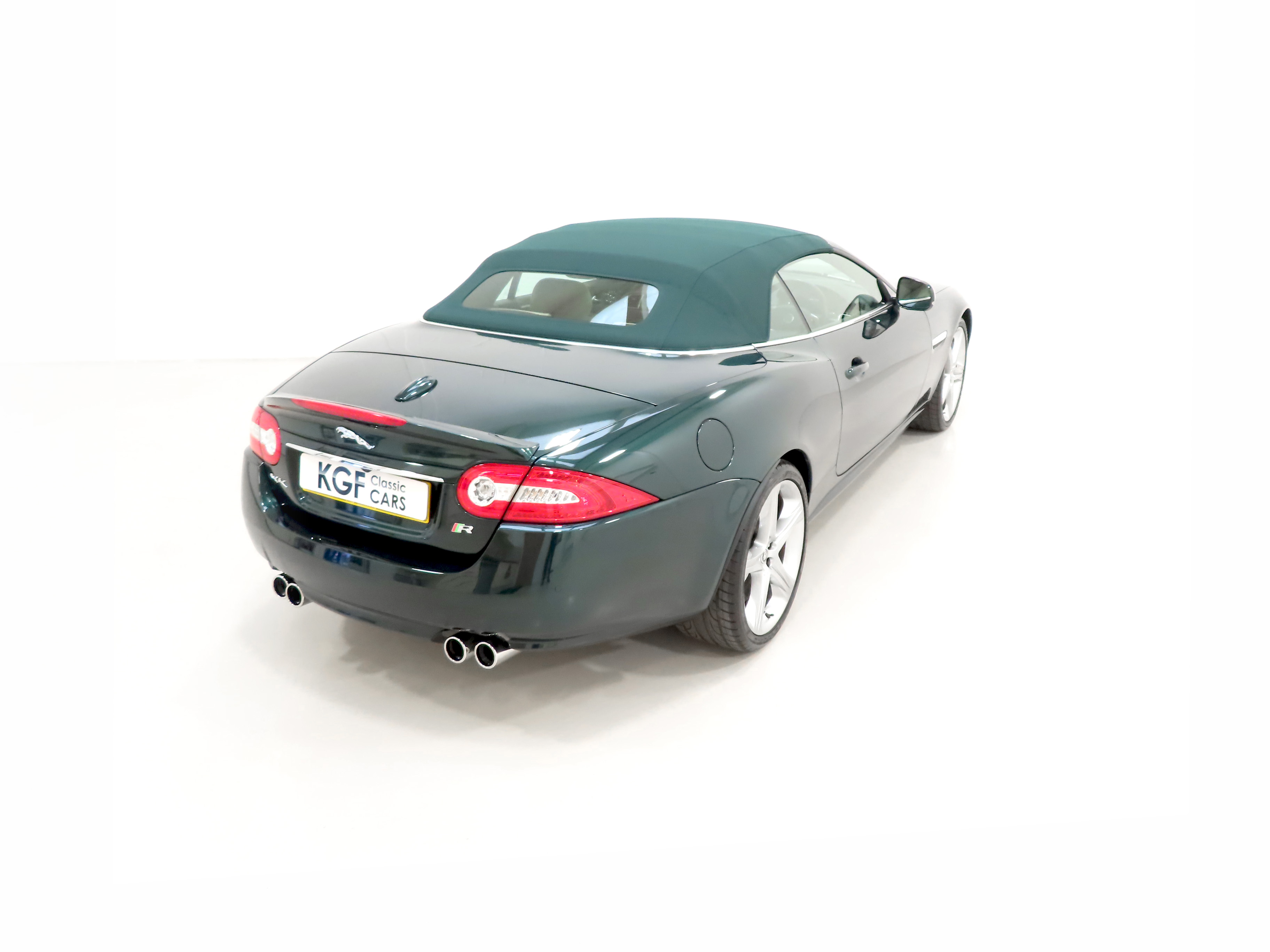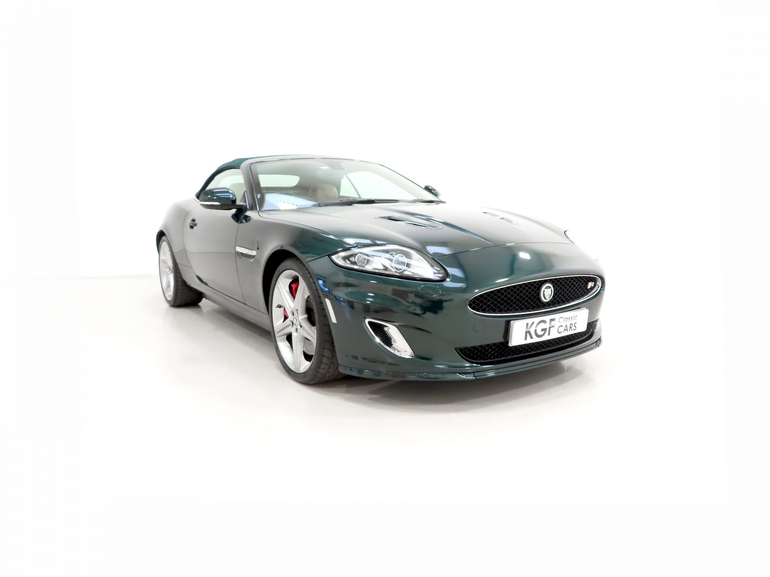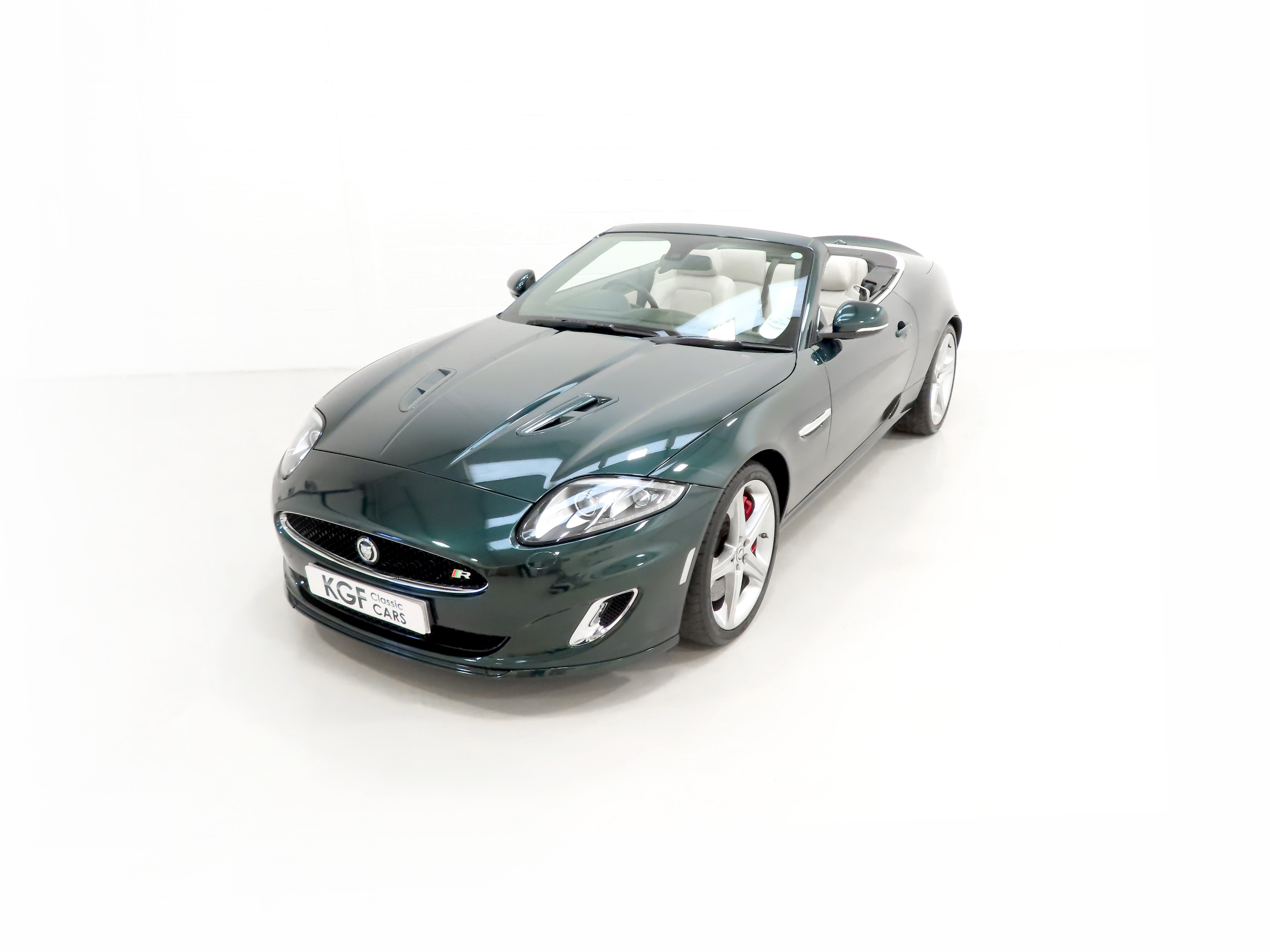 XKR Aerodynamic Pack incorporating front splitter and large rear spoiler, electrically operated convertible hood with integrated tonneau, bonnet louvres with Supercharged script, Bi-Xenon with LED daytime running lights, LED tail lamps, auto lights and wipers, front and rear parking sensors, JaguarDrive Control with Winter and Dynamic Mode, cruise control with speed limiter, electric memory seats and steering column, heated and cooled front seats, heated leather steering wheel, dual zone climate control, Phosphor blue halo illumination and mood lighting, keyless start, message centre, 7 inch colour touch screen display with navigation, Bluetooth, Bowers & Wilkins 525W surround sound system, 6 disc in-facia CD. Factory Options; Xirallic Special paintwork, Premium Dark Green convertible hood, 20” Takoba alloy wheels, Performance Active Exhaust with quad tailpipes, Reverse park Camera with Guidance, DAB radio receiver.