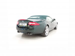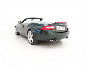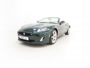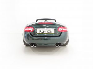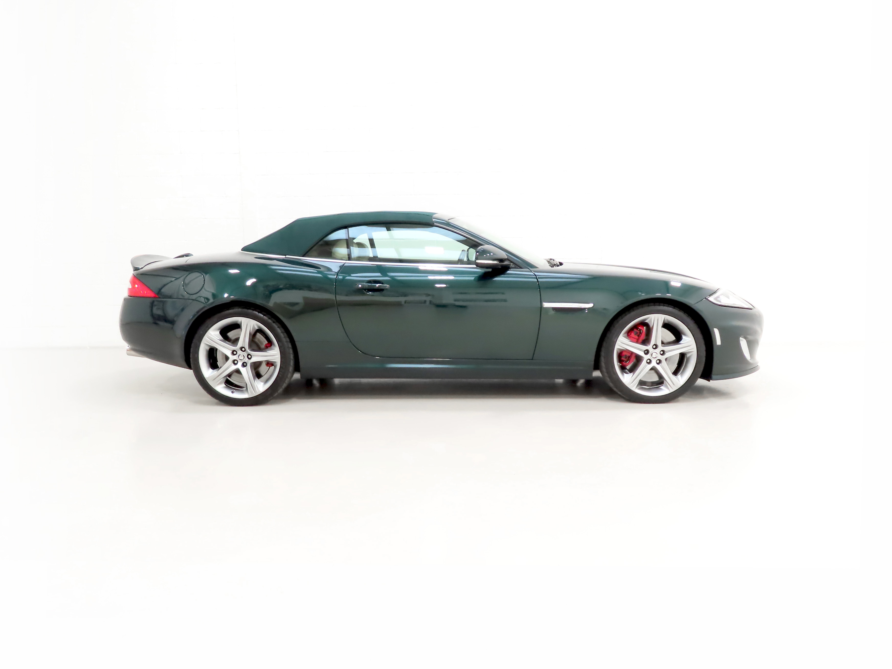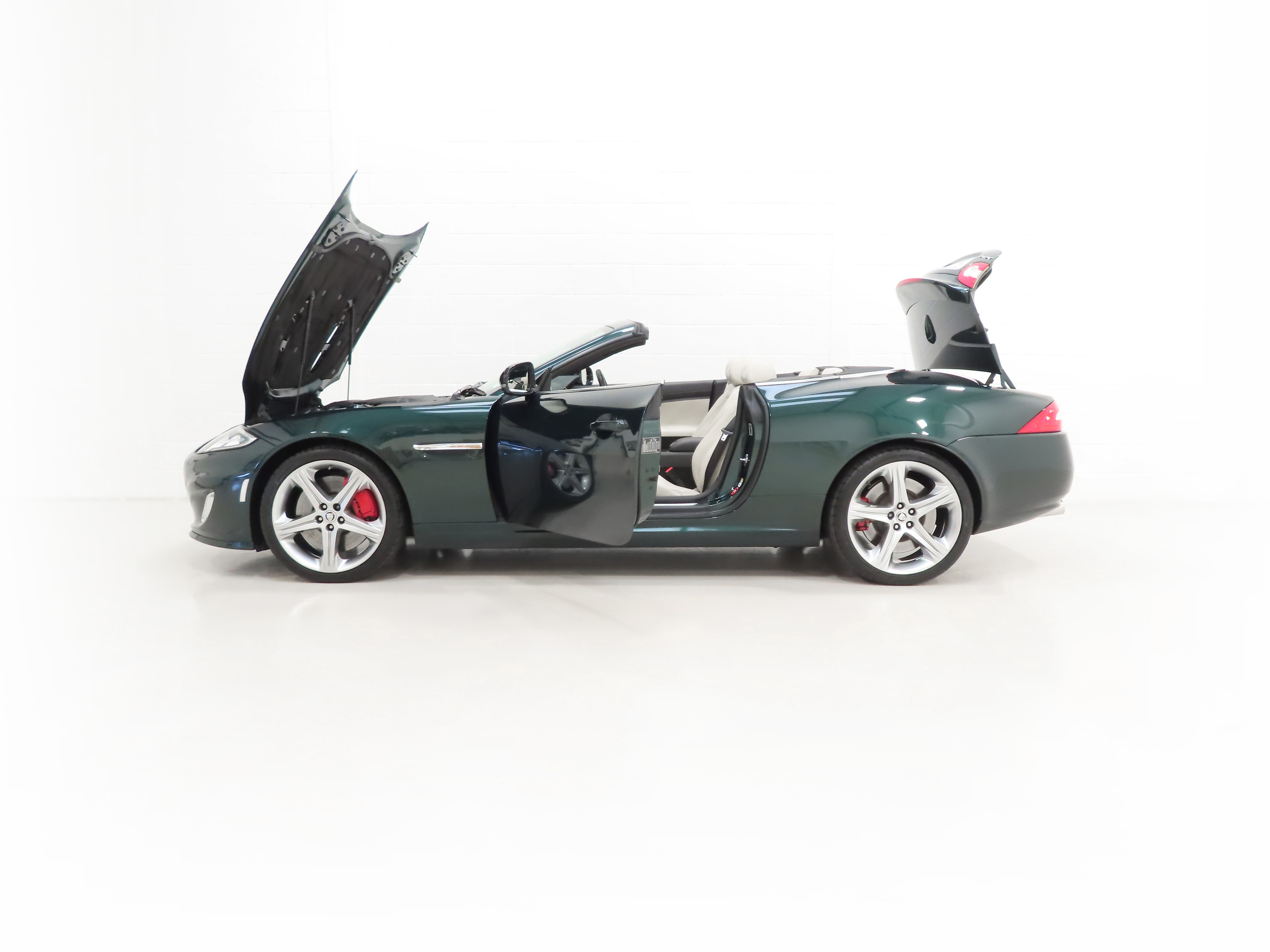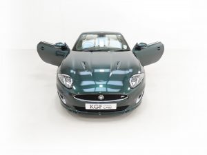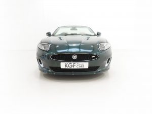 XKR Aerodynamic Pack incorporating front splitter and large rear spoiler, electrically operated convertible hood with integrated tonneau, bonnet louvres with Supercharged script, Bi-Xenon with LED daytime running lights, LED tail lamps, auto lights and wipers, front and rear parking sensors, JaguarDrive Control with Winter and Dynamic Mode, cruise control with speed limiter, electric memory seats and steering column, heated and cooled front seats, heated leather steering wheel, dual zone climate control, Phosphor blue halo illumination and mood lighting, keyless start, message centre, 7 inch colour touch screen display with navigation, Bluetooth, Bowers & Wilkins 525W surround sound system, 6 disc in-facia CD. Factory Options; Xirallic Special paintwork, Premium Dark Green convertible hood, 20” Takoba alloy wheels, Performance Active Exhaust with quad tailpipes, Reverse park Camera with Guidance, DAB radio receiver.