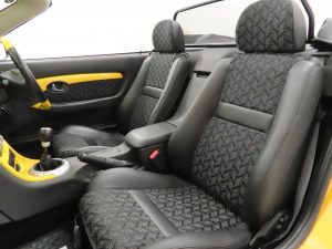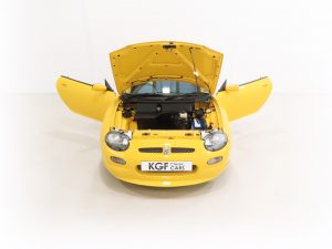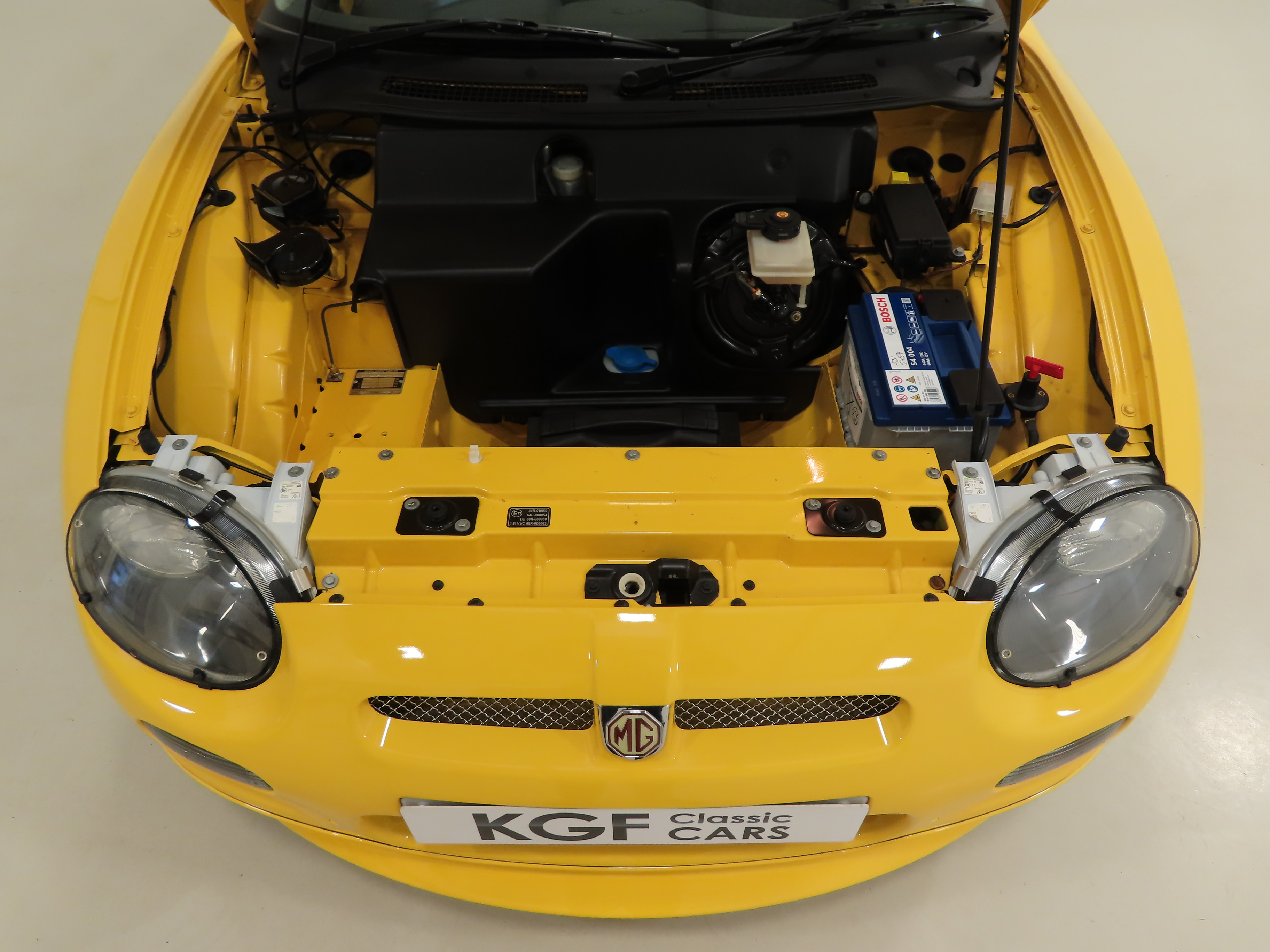 The sports seats with unique cloth centre panels, (Code WRA), are standard fitment on this limited edition MGF and in a condition that is commensurate with the incredibly low 6,797 miles covered. The vibrant exterior is mirrored inside the cabin with centre console and door casing inserts in body colour finish and the steering wheel leather inserts are incredible thanks to the only owner always wearing driving gloves. The interior is simply outstanding and displays all the indicators of such a low mileage car with beautifully unworn touch points. The cut pile carpets remain protected by both sets of genuine MG mats. Both front and rear luggage areas are spotless with the front housing the original compressor in lew of spare wheel to allow for extra luggage space. Even the black bezel head lamp units still wear the fragile Valeo part stickers as well as the genuine MG headlamp protectors! MG museum quality in all respects.