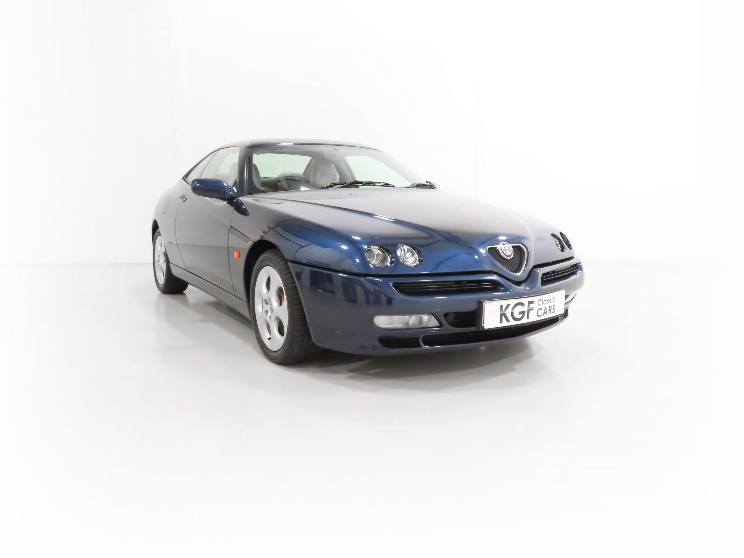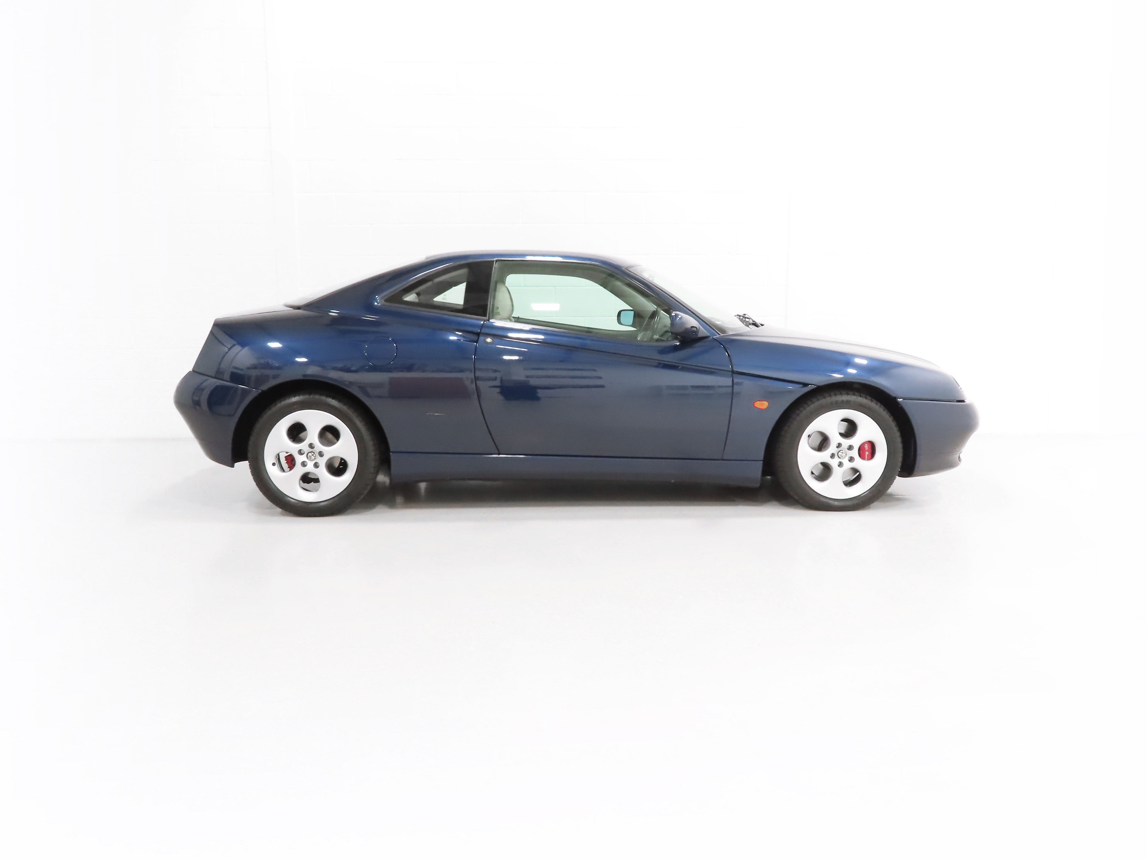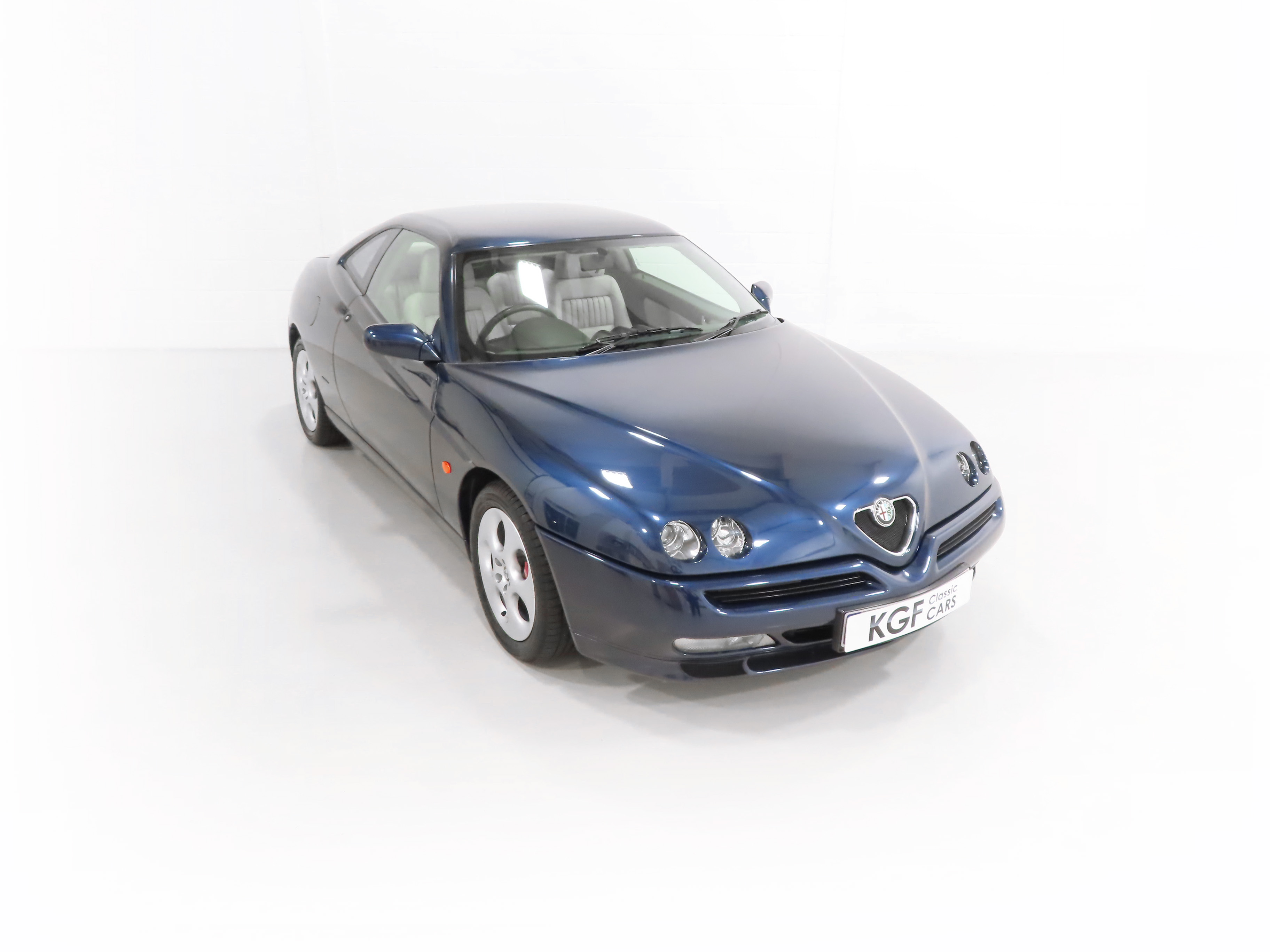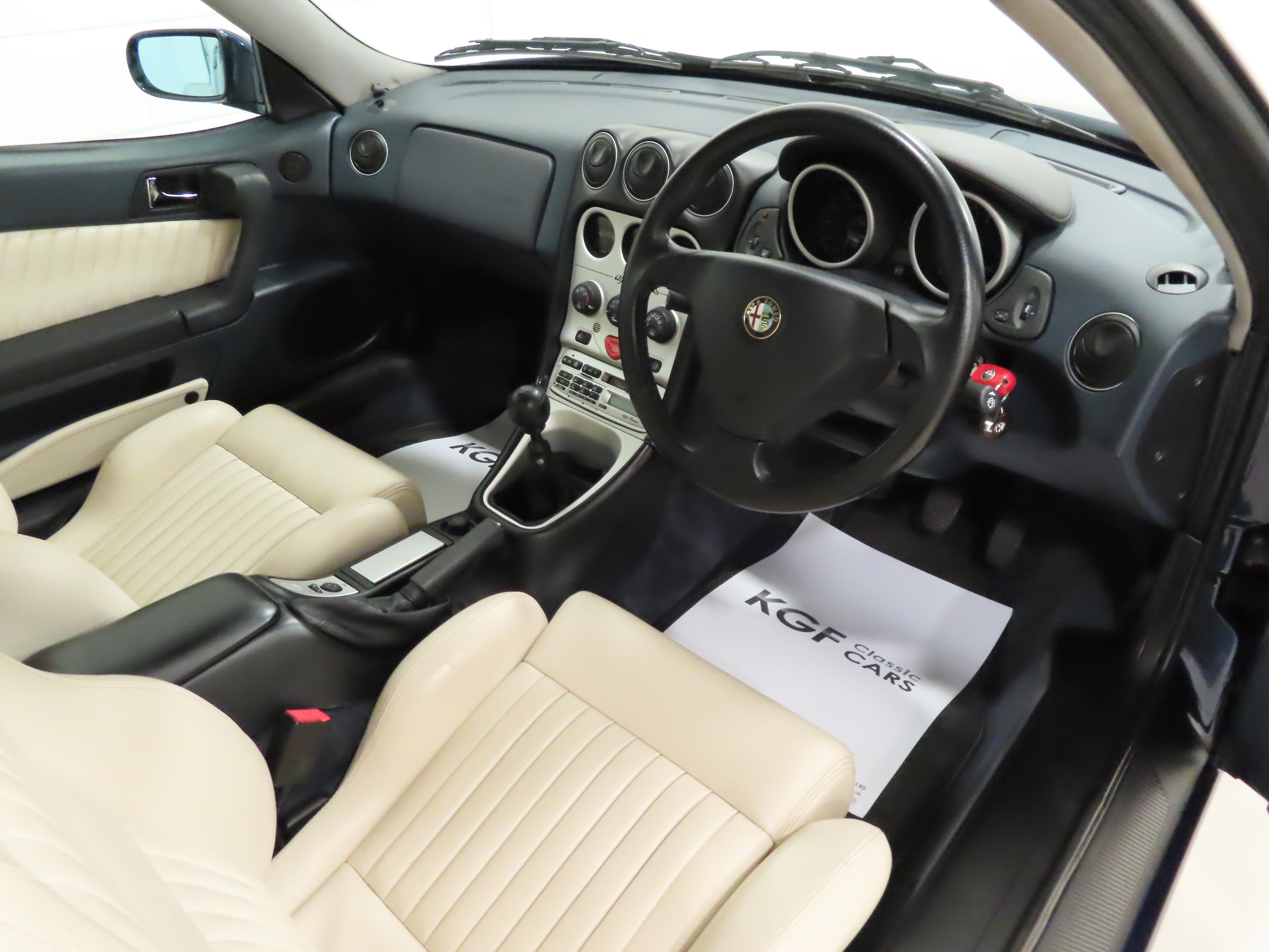 2+2 Pininfarina styled body, Pininfarina rear wing inscription, body-coloured bumpers and trim, third brake light, red brake callipers with white Alfa Romeo wording on front callipers, Alfa Code Immobiliser, FPS fire prevention system, Polyelliptical headlights, anti-skid system, Check Control (door and boot status), leather steering wheel with height and reach adjust, driver and front passenger airbags, automatic air-conditioned climate control, stereo radio cassette. Blue Style special interior Option 728; White seats and door inserts, blue fascia and door trim, blue carpets. Factory Options: Metallic paintwork. Dealer Accessories; Tailored Alfa GTV carpet mats, CD changer.