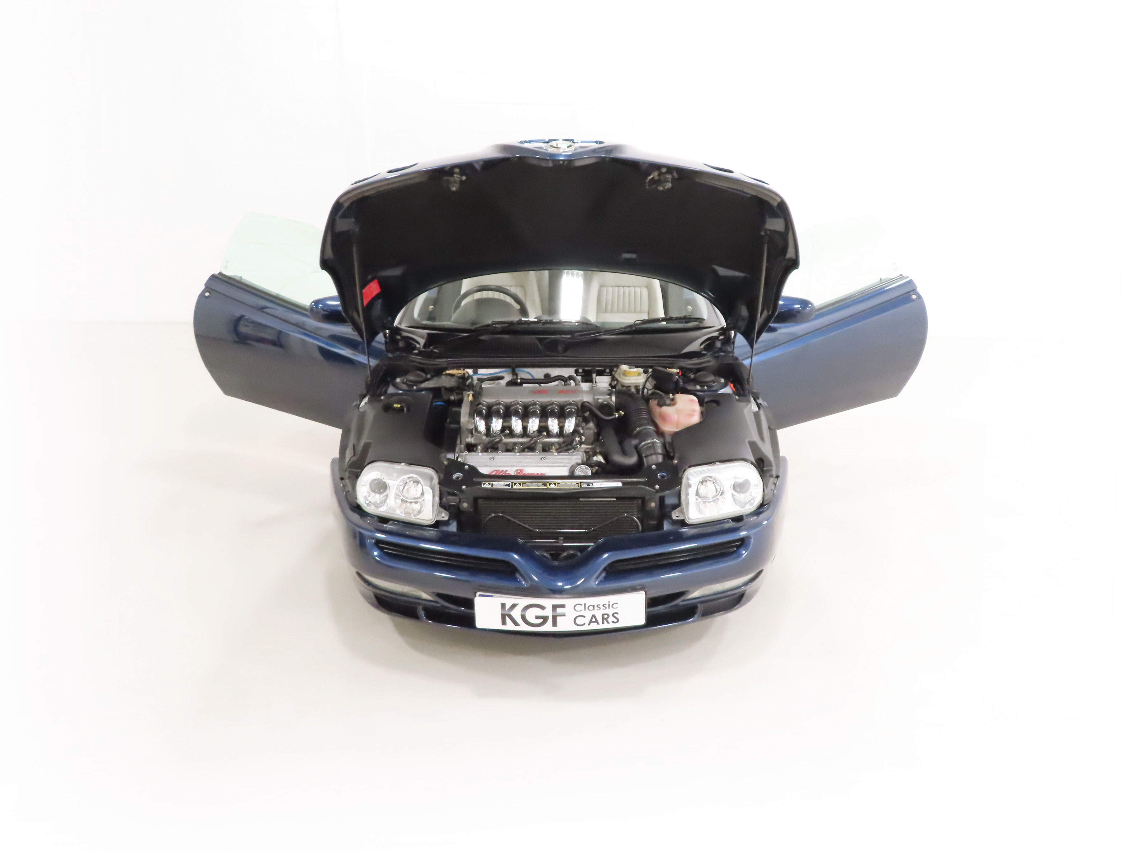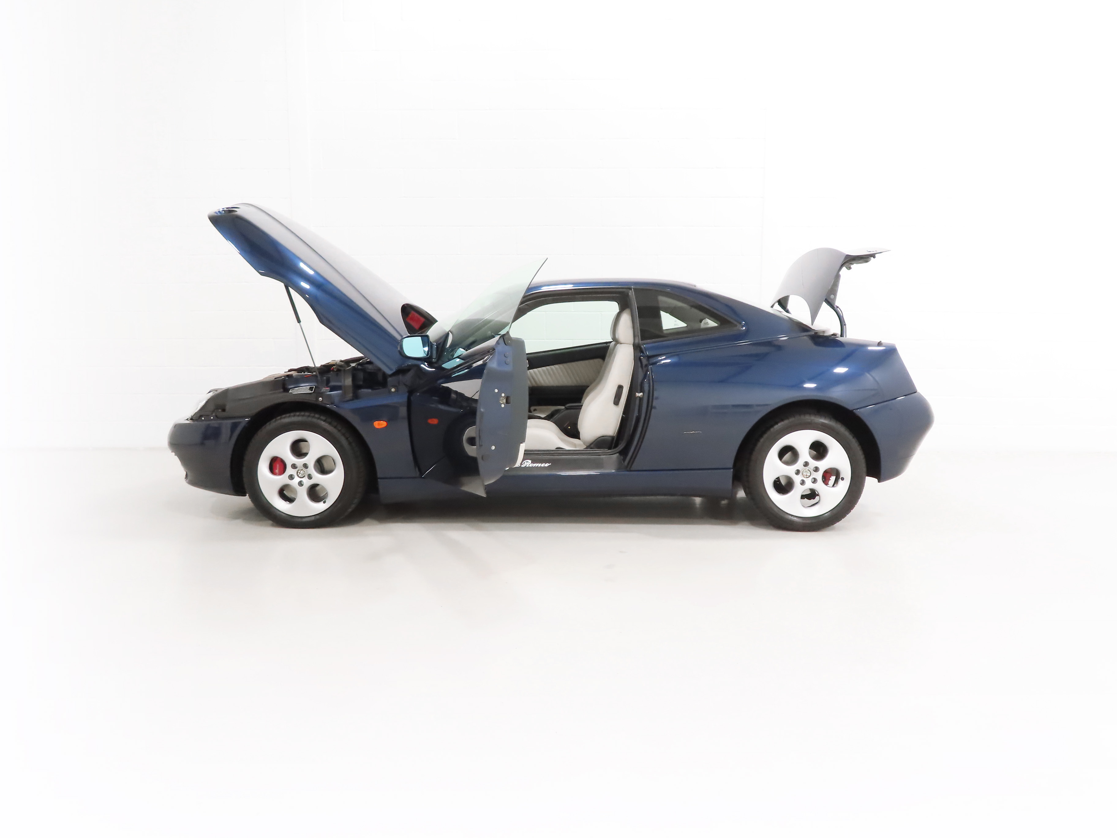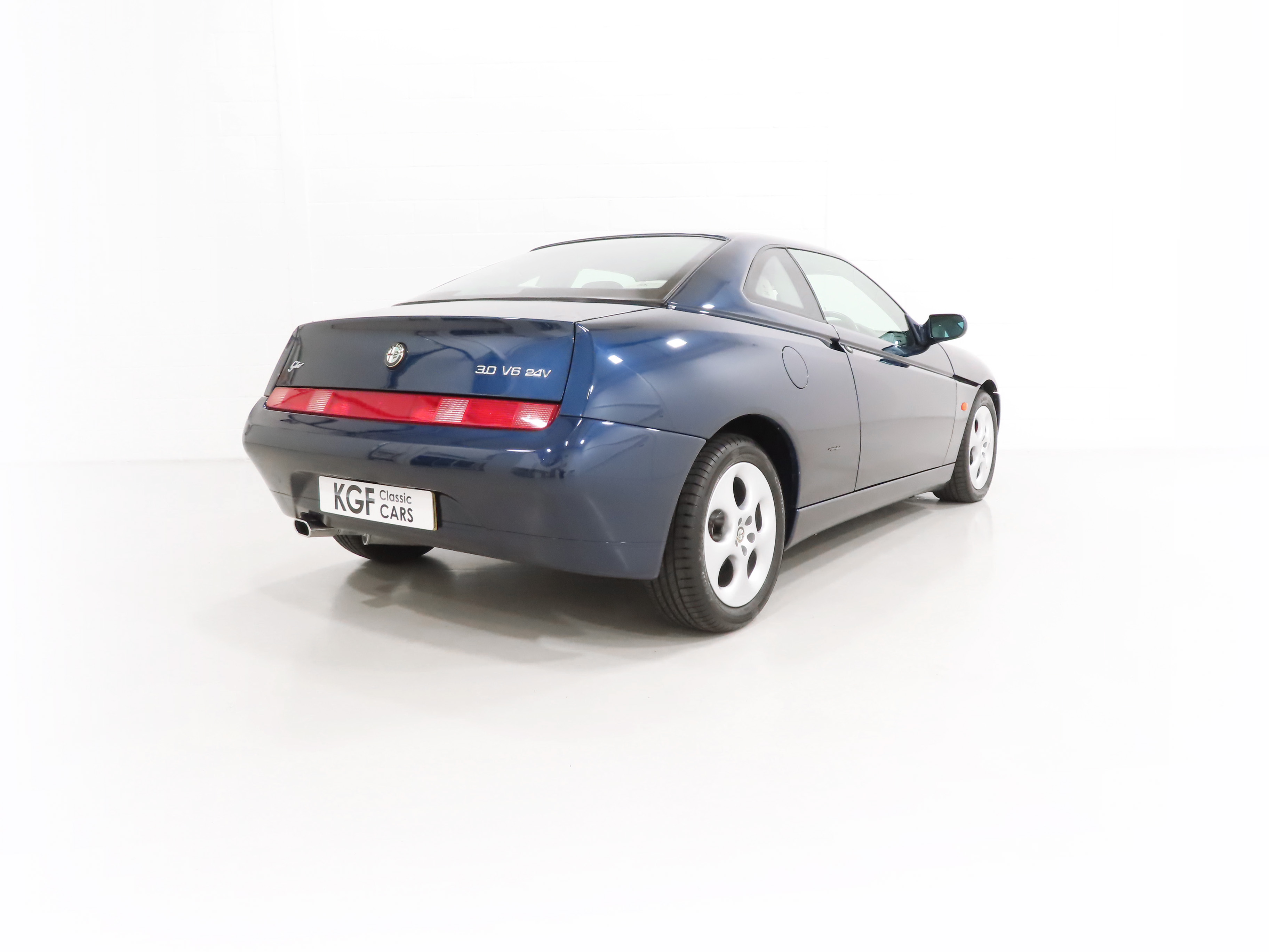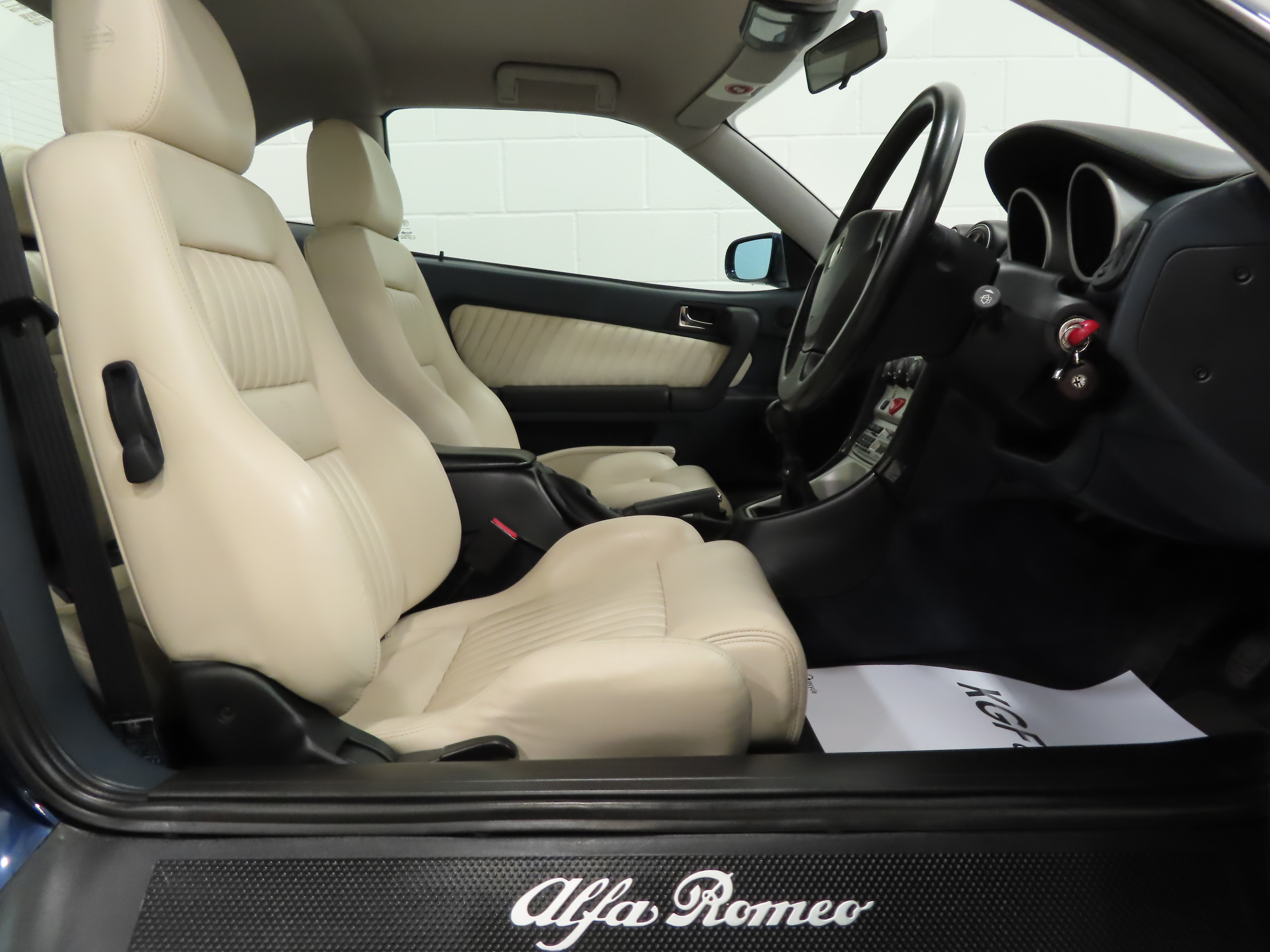 2+2 Pininfarina styled body, Pininfarina rear wing inscription, body-coloured bumpers and trim, third brake light, red brake callipers with white Alfa Romeo wording on front callipers, Alfa Code Immobiliser, FPS fire prevention system, Polyelliptical headlights, anti-skid system, Check Control (door and boot status), leather steering wheel with height and reach adjust, driver and front passenger airbags, automatic air-conditioned climate control, stereo radio cassette. Blue Style special interior Option 728; White seats and door inserts, blue fascia and door trim, blue carpets. Factory Options: Metallic paintwork. Dealer Accessories; Tailored Alfa GTV carpet mats, CD changer.