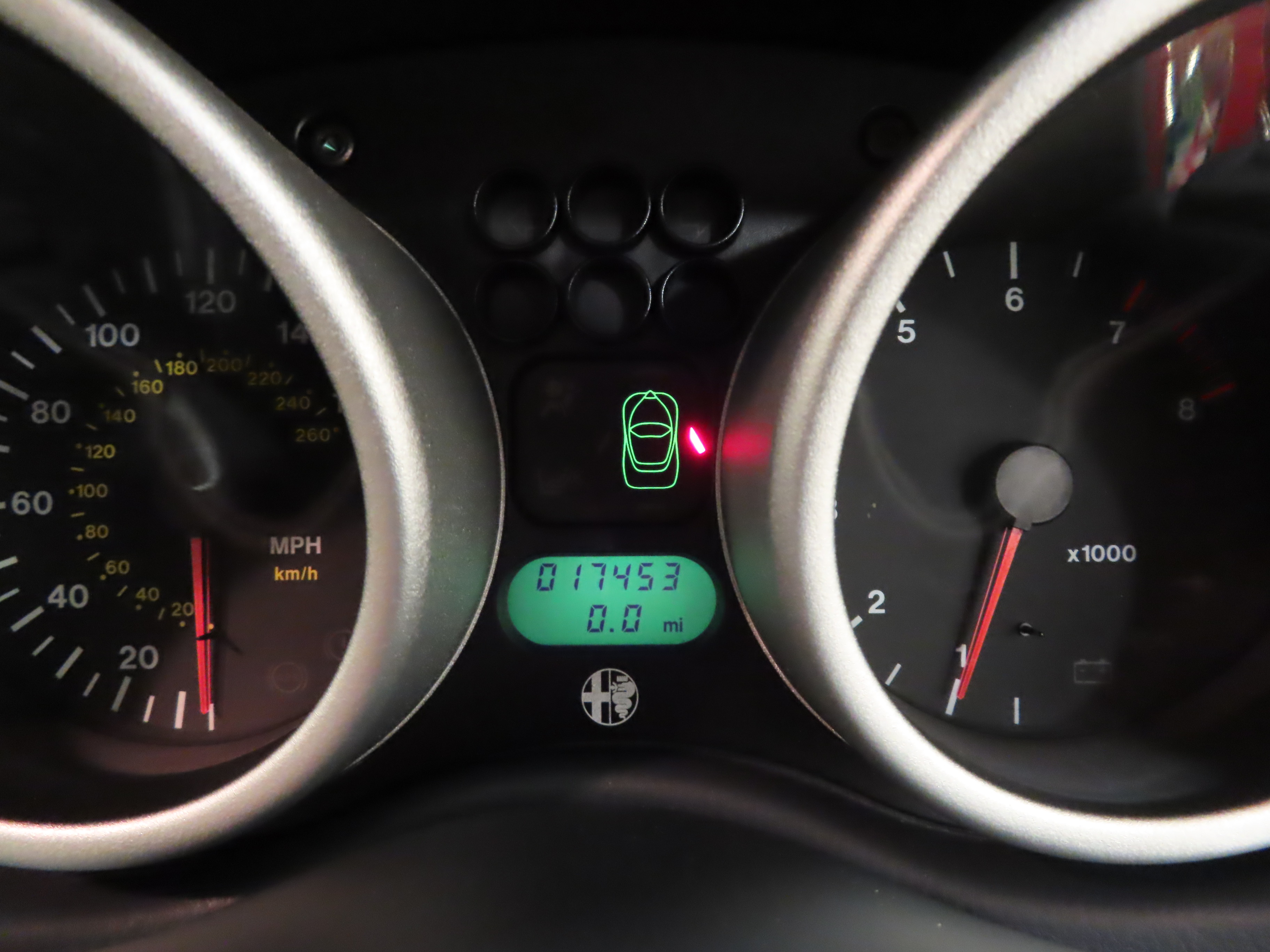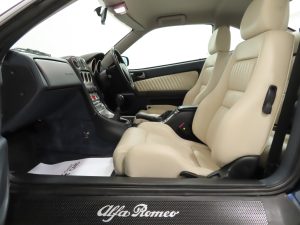 The fashion designer of interiors, this example has benefitted from the expensive Blue Style factory optional upgrade incorporating Momo trimmed white leather upholstery against blue fascia, trim and carpeting, (Code 728). The stunning sculptured Momo seats and door trim are swathed in near spotless white leather with a distinct lack of wear as you would expect from a car covering just 17,453 miles from new. Unashamed flamboyance throughout includes the bold Alfa Romeo lettering on the door sills and stylish driver inclined fascia with three pod central gauges showing time, fuel level and engine temperature. All controls and functions operate perfectly including the original stereo with CD changer and the ice-cold climate control. The carpets, floor mats and headlining are immaculate. An exceptional interior, preserved and unspoilt.