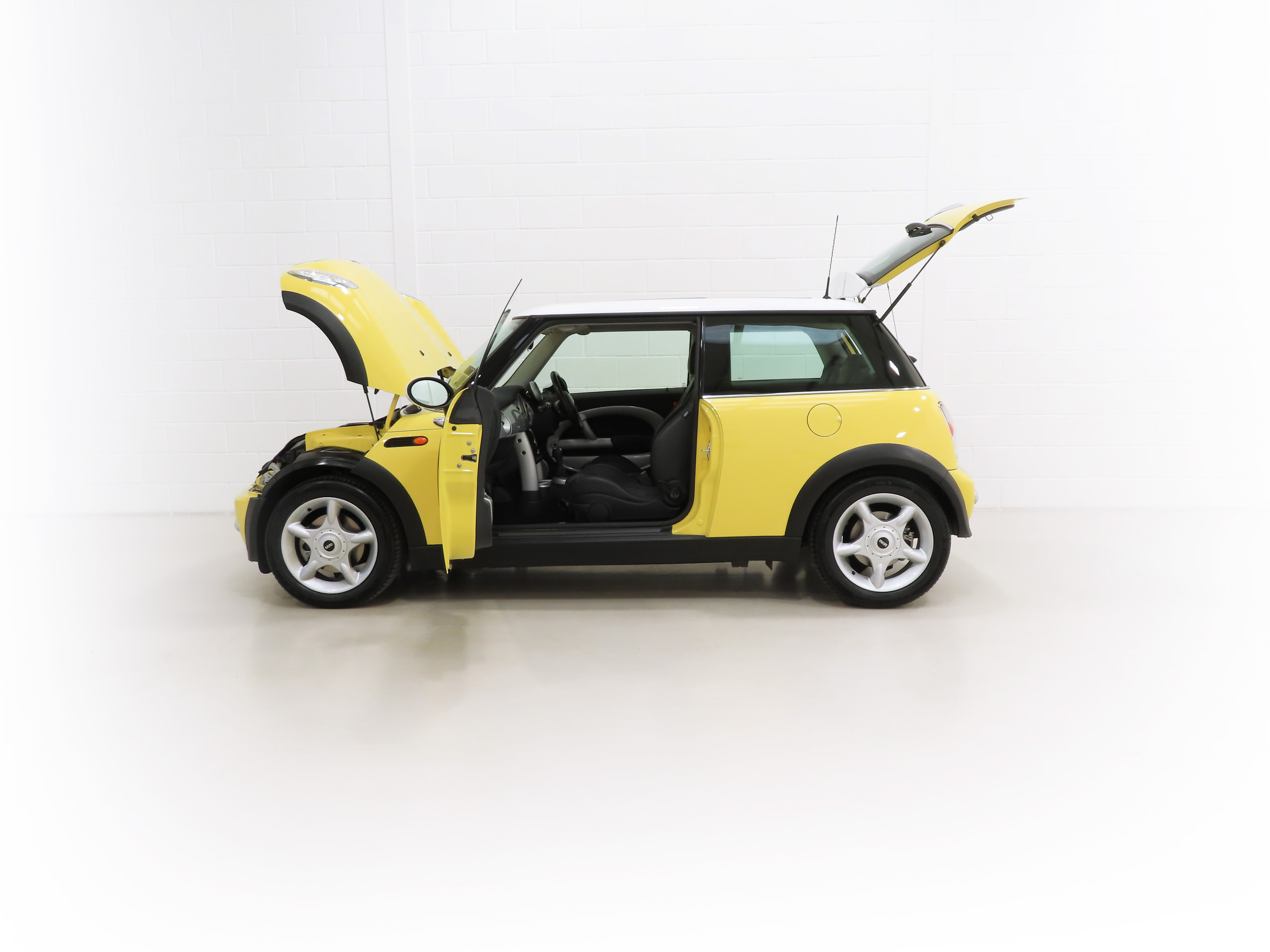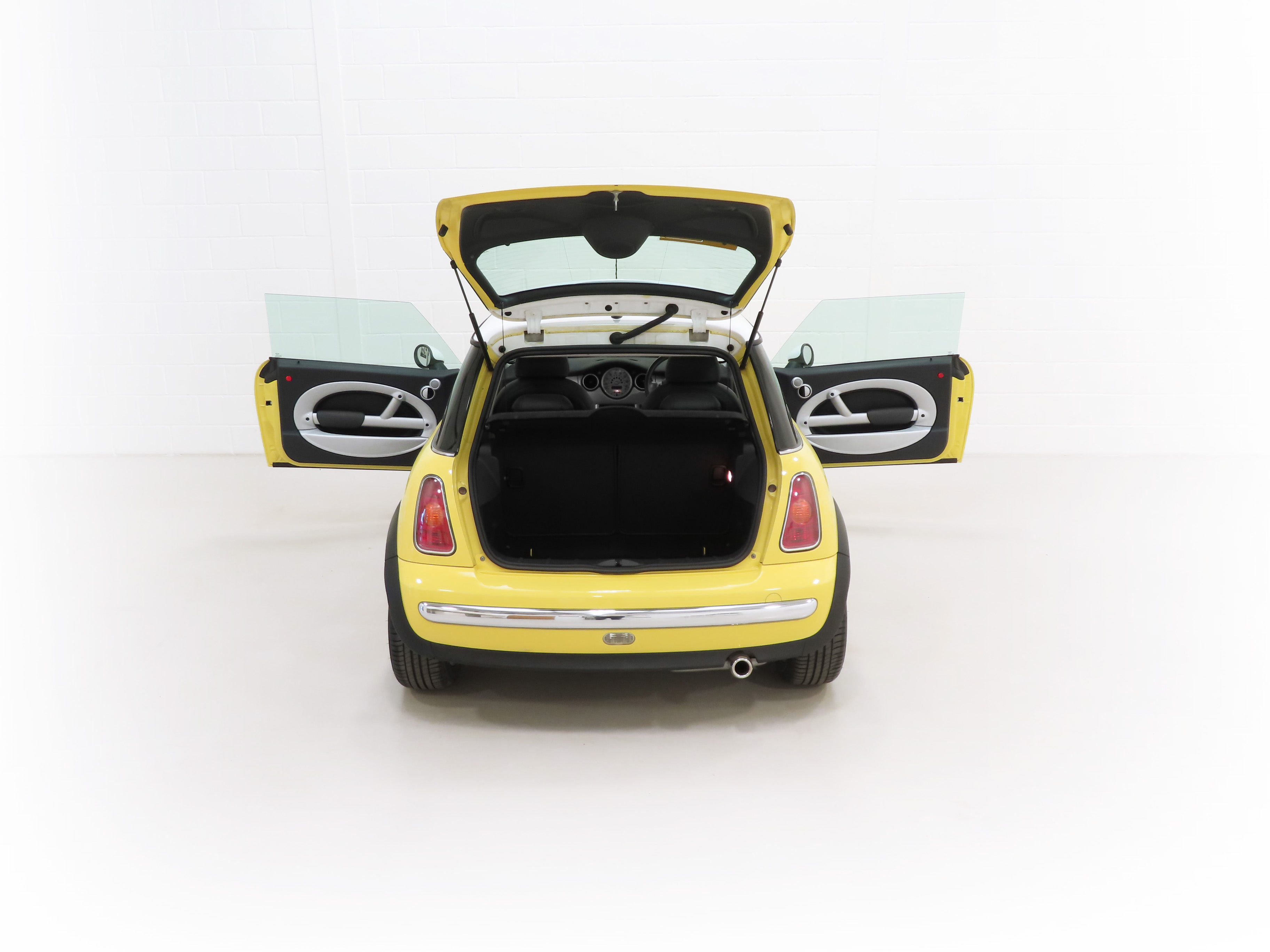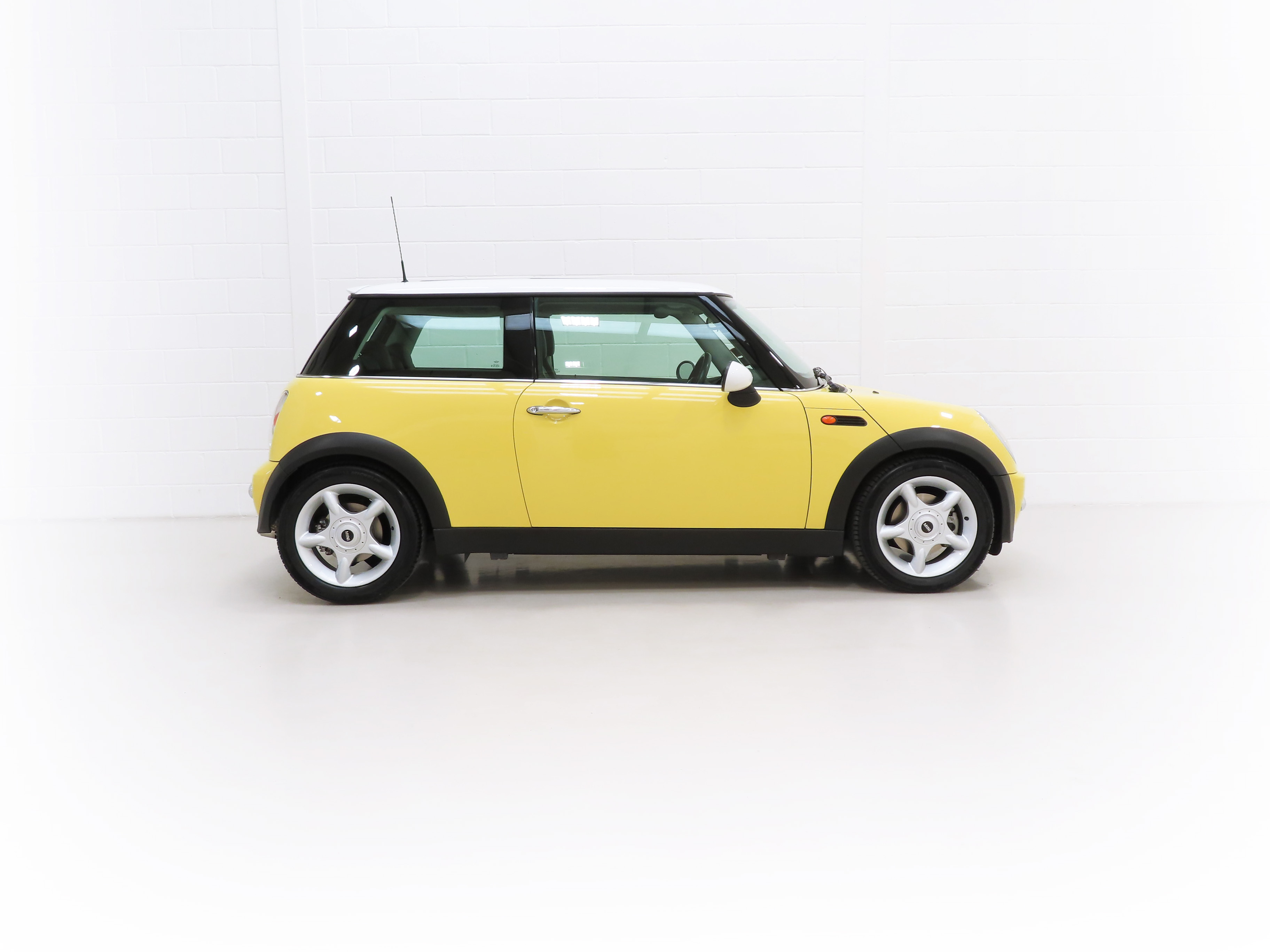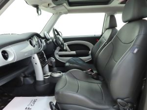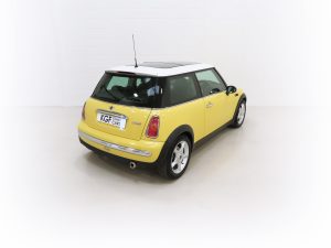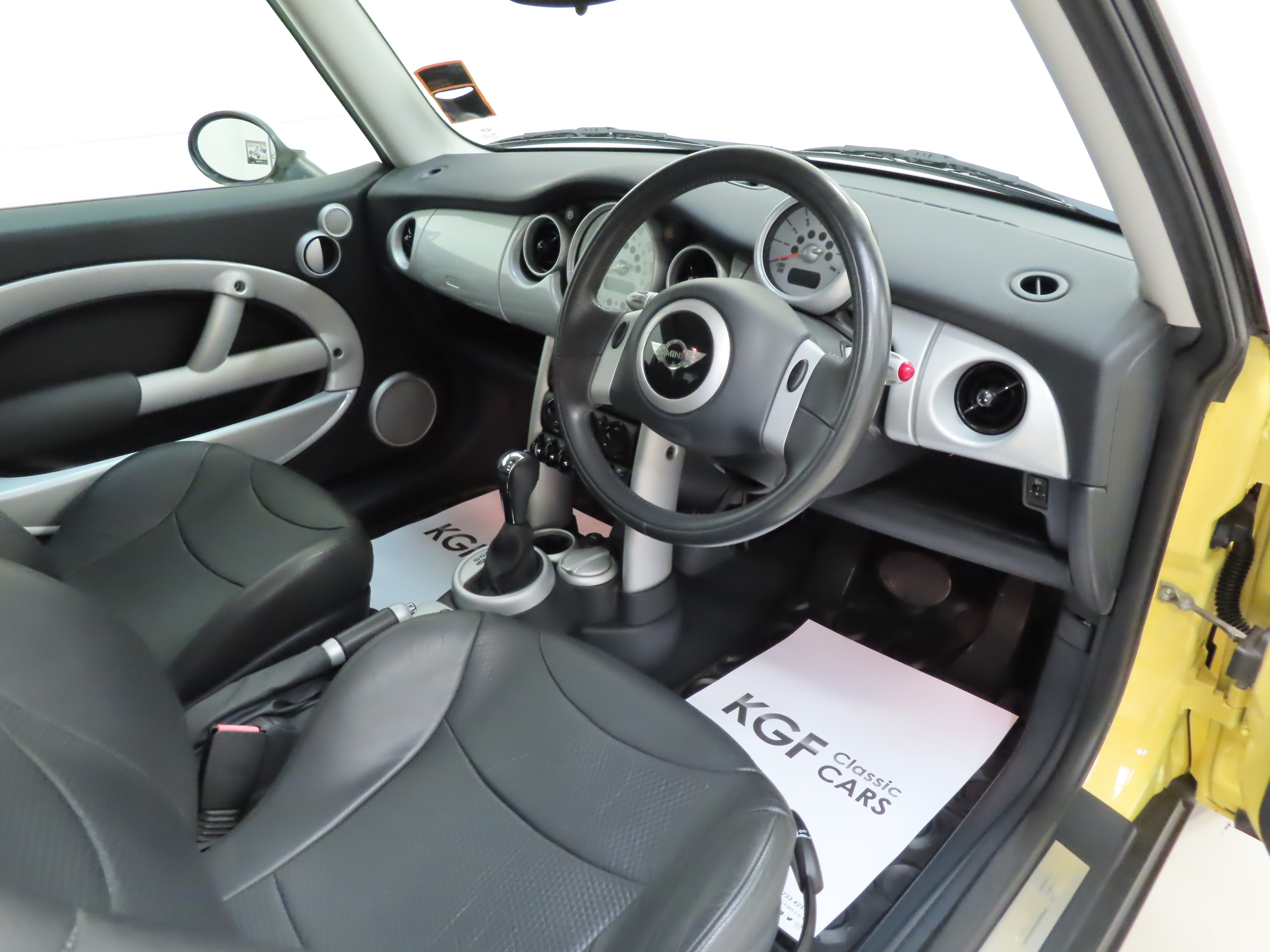 Chrome-plated radiator grille frame and slats, 55mm chrome-plated exhaust pipe, chrome door handles, tinted windows, rear headrests, 12v socket in boot, electric window control with radio key, remote central locking, car memory. Factory Options; Liquid Yellow paintwork, roof and door mirror caps in White, electric panoramic glass sunroof, automatic transmission with Steptronic, ASC+T, Profile leather seats, adjustable lumbar support to front seats, air conditioning, trip computer, single CD player, radio boost. Chili Pack; Bumpers with chrome inserts front and rear, front fog lights, rear roof spoiler in body colour, Sports Suspension PLUS, 5-star light alloy wheels, sports seats, leather steering wheel, velour floor mats, storage nets in back of front seats, height adjustable passenger seat, Brilliant Silver interior trim, revolution counter, interior light package. Dealer Accessories; Mini all-weather rubber gearmats.