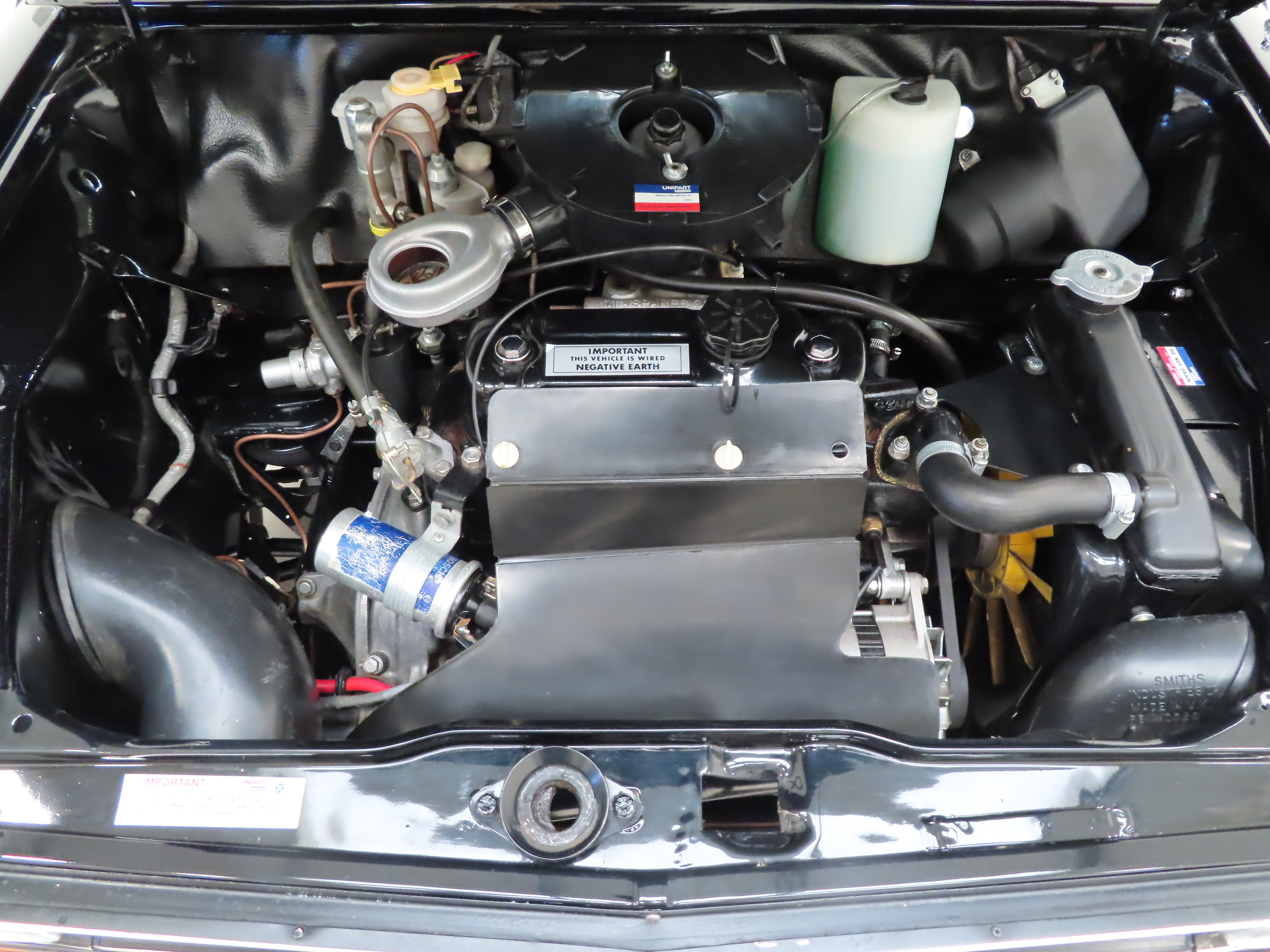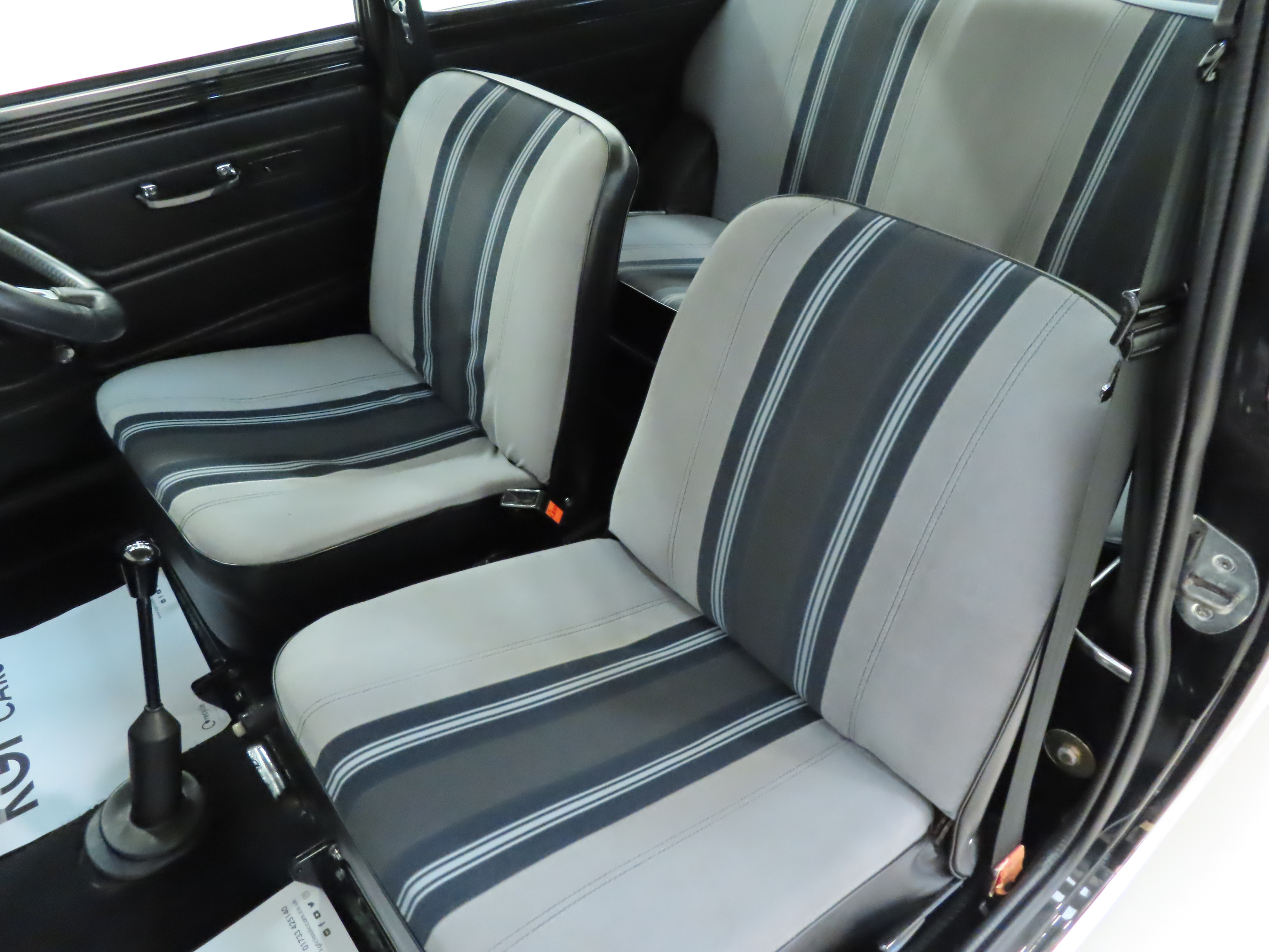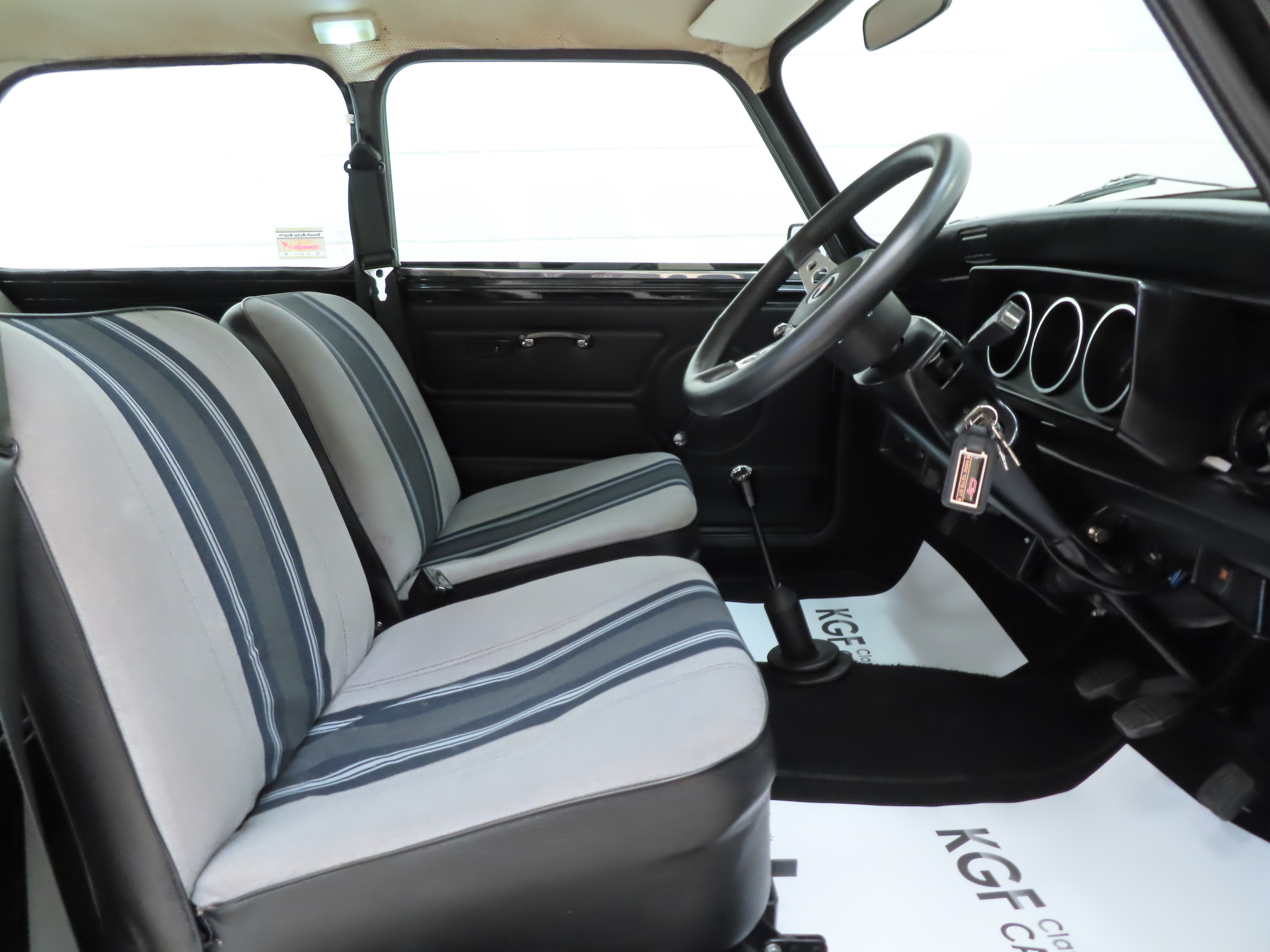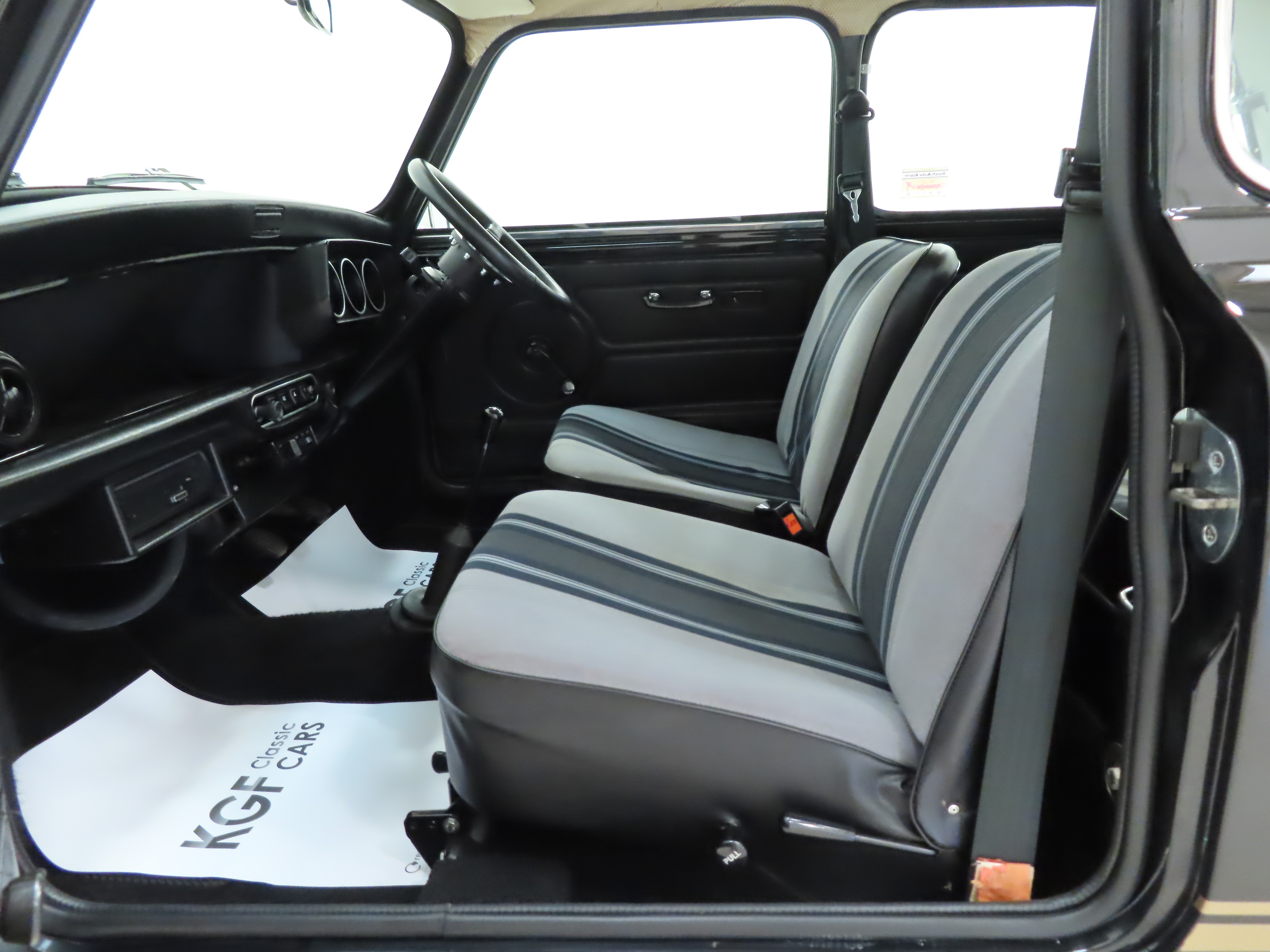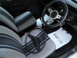 The striped cropped nylon seat material in grey stripe colour scheme is in excellent condition with only light markings and slightly stretched fabric to the driver’s seat. The black vinyl doors cards are undamaged and the headlining is intact and clean. The fascia is complete with fully functioning switches and gauges including the functioning revolution counter only found on the 1275 GT. The stylish Motolita steering wheel is a popular upgrade yet the original two-spoke leather rimmed item in great condition has been kept. A modern Sony Bluetooth stereo system with rear shelf mounted speakers have been fitted as the only modern upgrade and easily removed if desired.