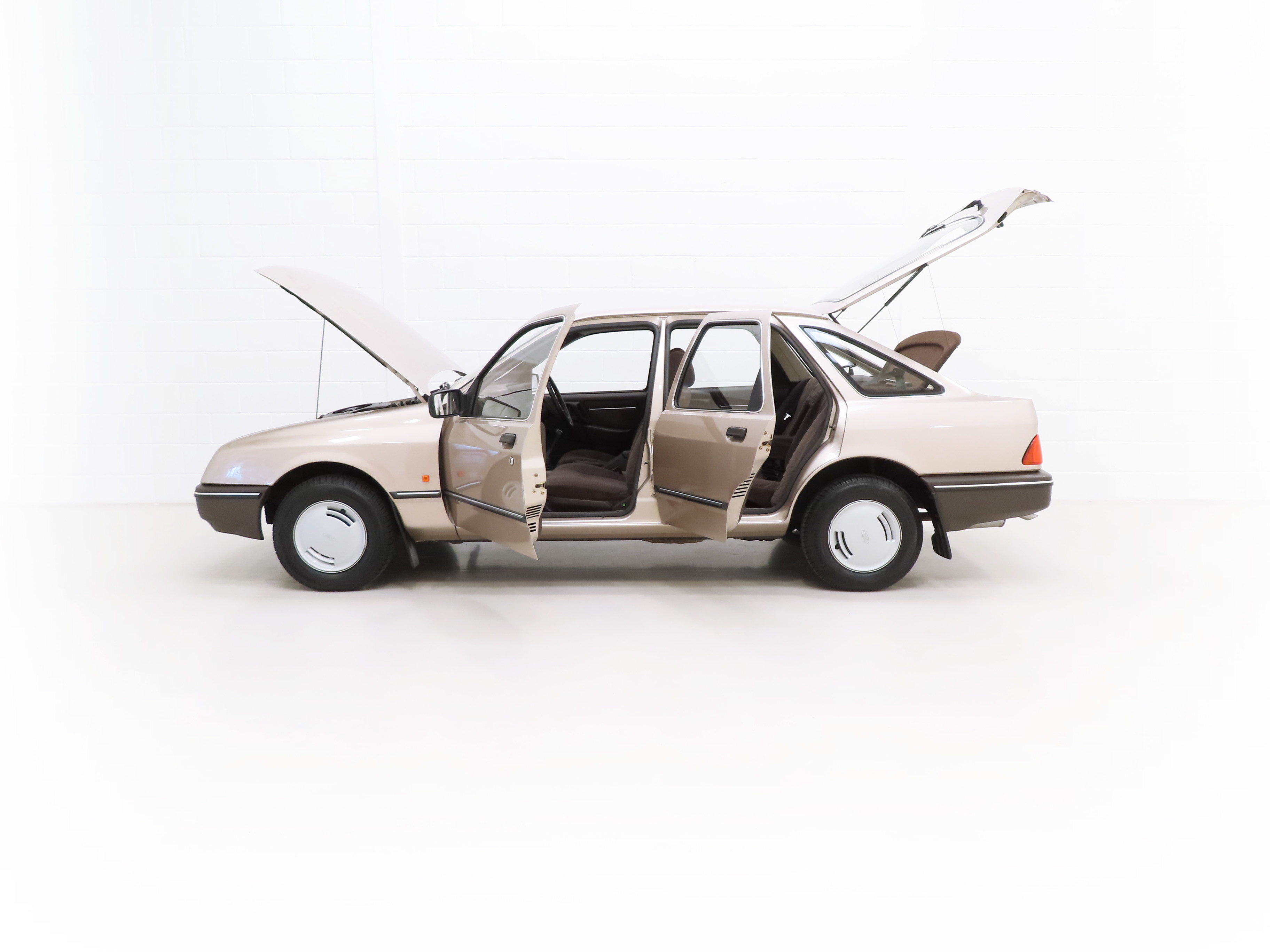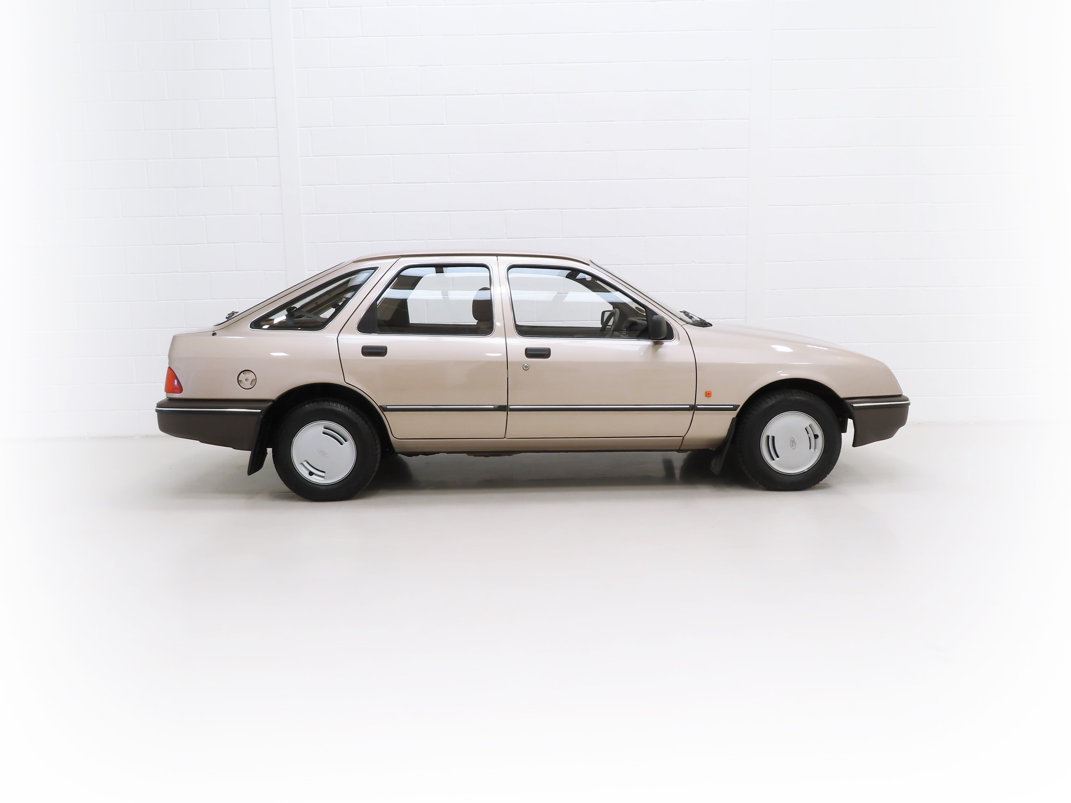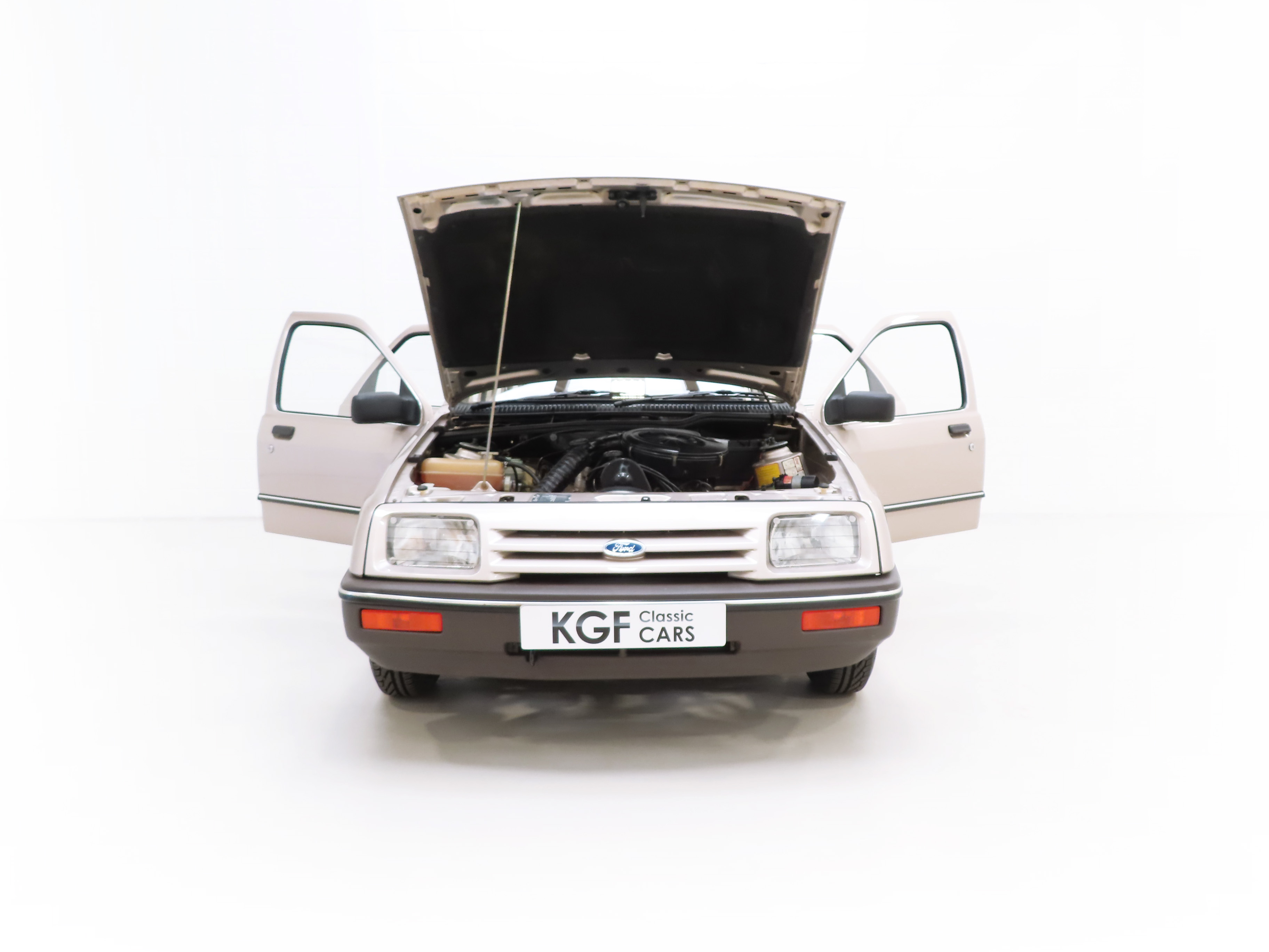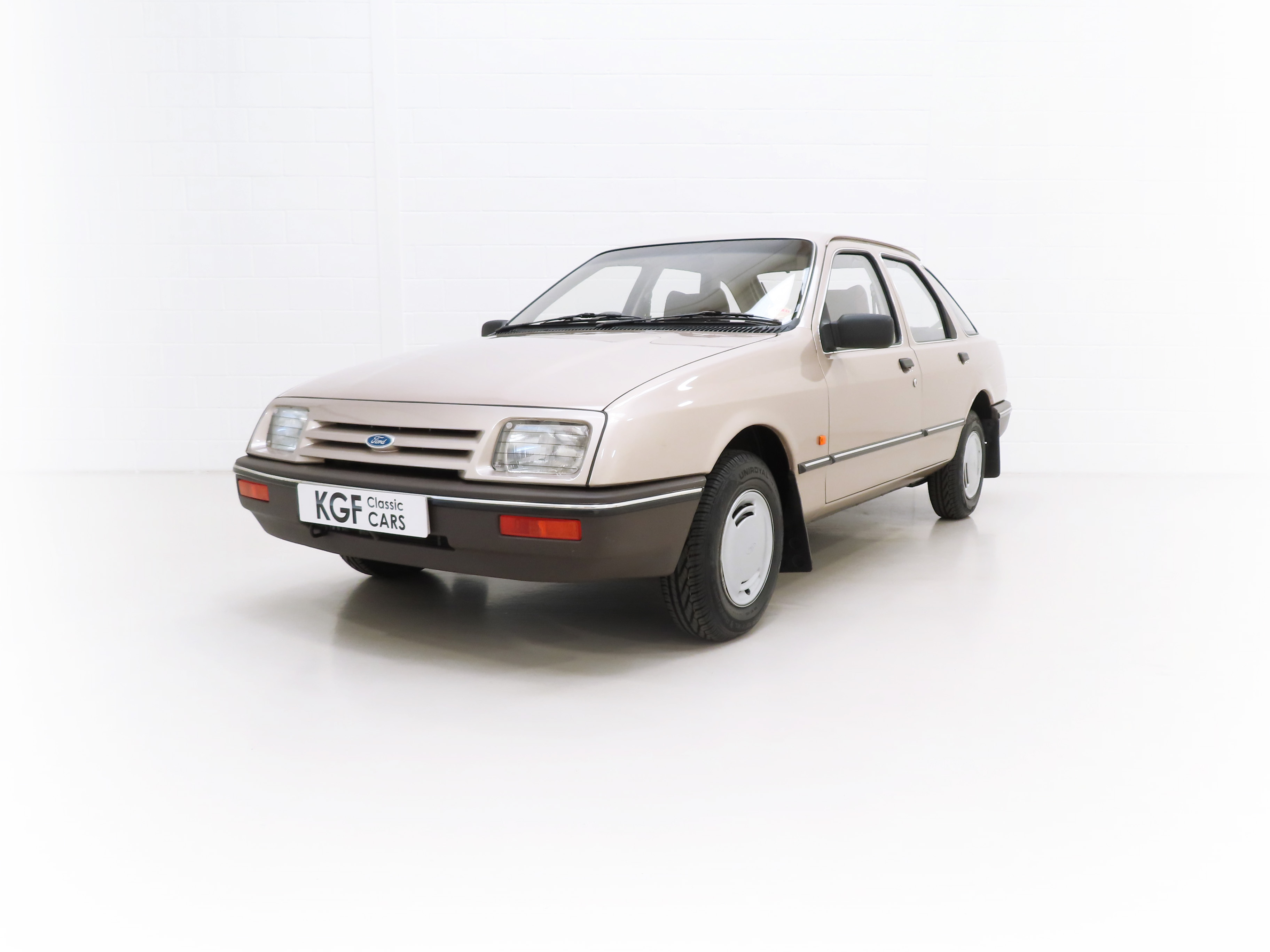 This exceptional and early Mk1 Ford Sierra 2.0 GL boasts impressive credentials of just two family owners and 27,013 miles from new. Finished in factory cost optional Metallic Champagne Gold, (Code O 3), the original finish is quite incredible with a rich and uniform shine. All factory panels remain fitted and the underside is in perfect structural order thanks to garage storage from new. A few markings to the excellent finish are barely worthy of mention such as some touched in chips to the bonnet and boot lid edge. All glass and rubbers are perfect factory fitment as are the light clusters and Lucas headlights with have been protected from new with optional Smoothy Light Guards. Original badges and model designation are in excellent condition and the supplying Ford Main Dealer number plates and tax disc holder remain with even the very first 1983 disc still in situ! One feature of this desirable early car is the absence of the D-Pillar Aerostrakes that were later fitted to the Sierra range in order improve crosswind stability. This car is an absolute credit to the two family custodians from new.