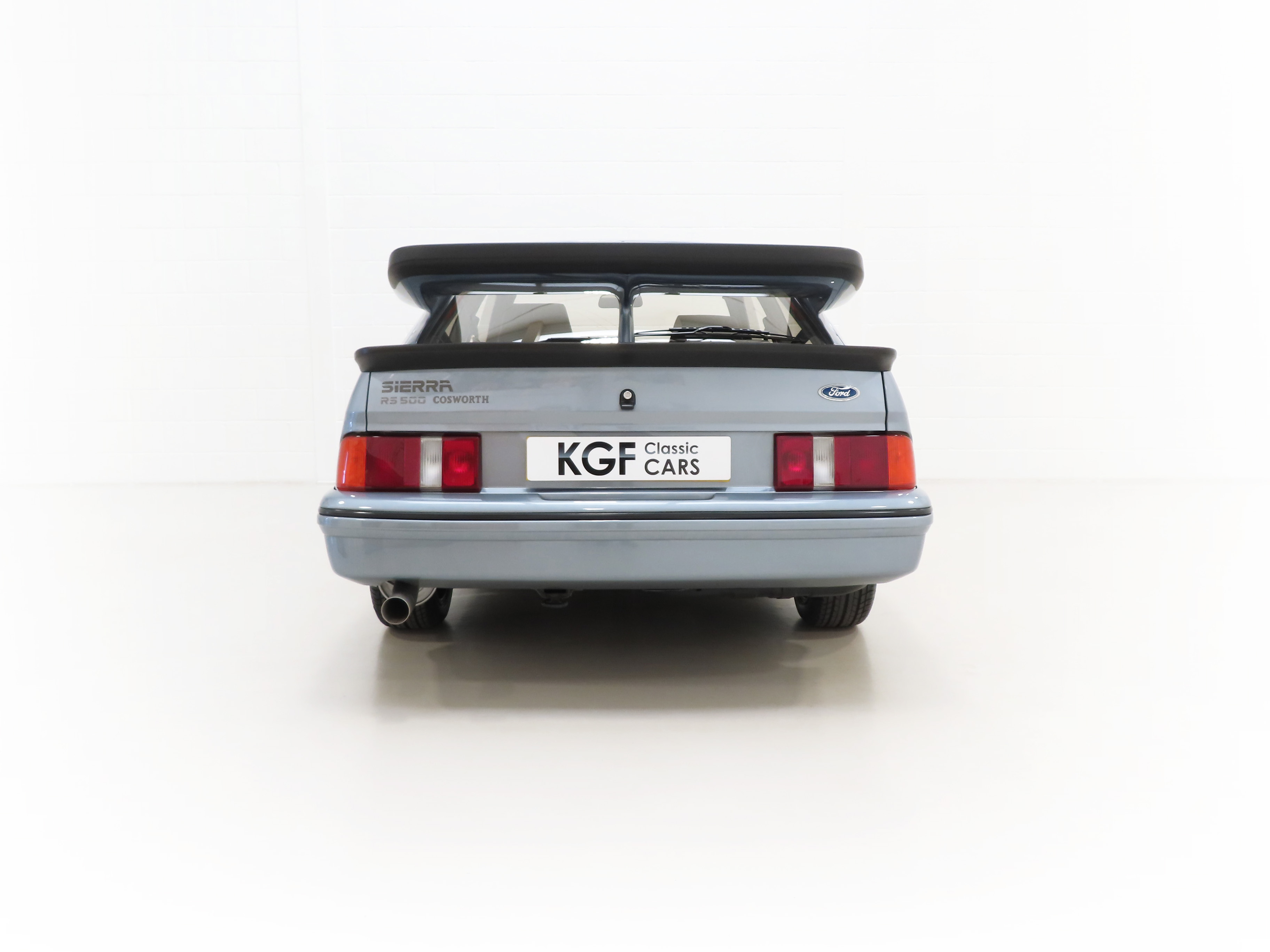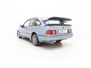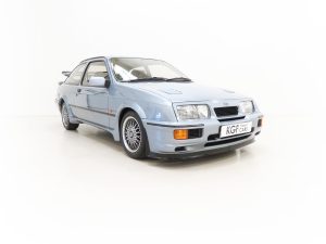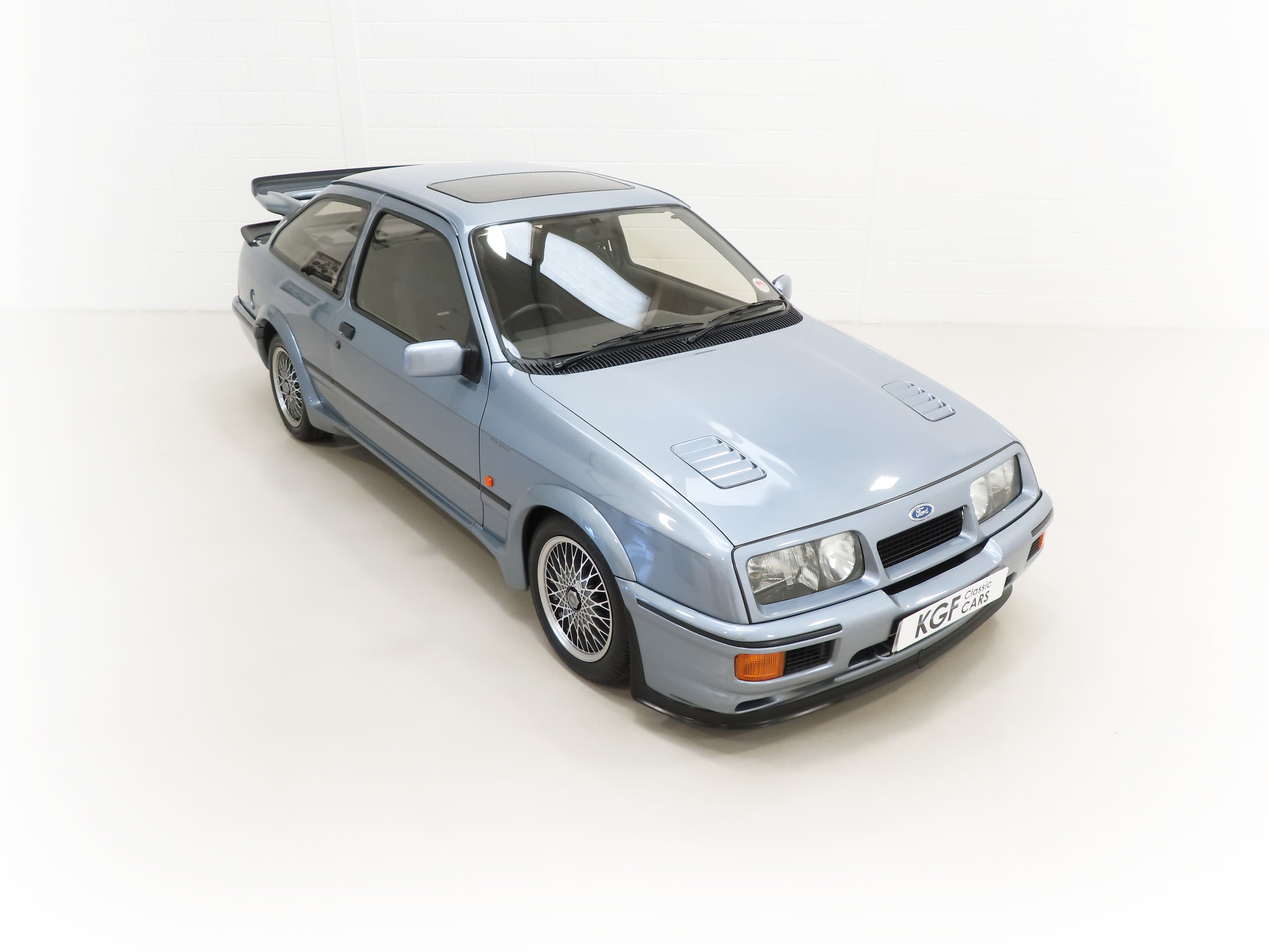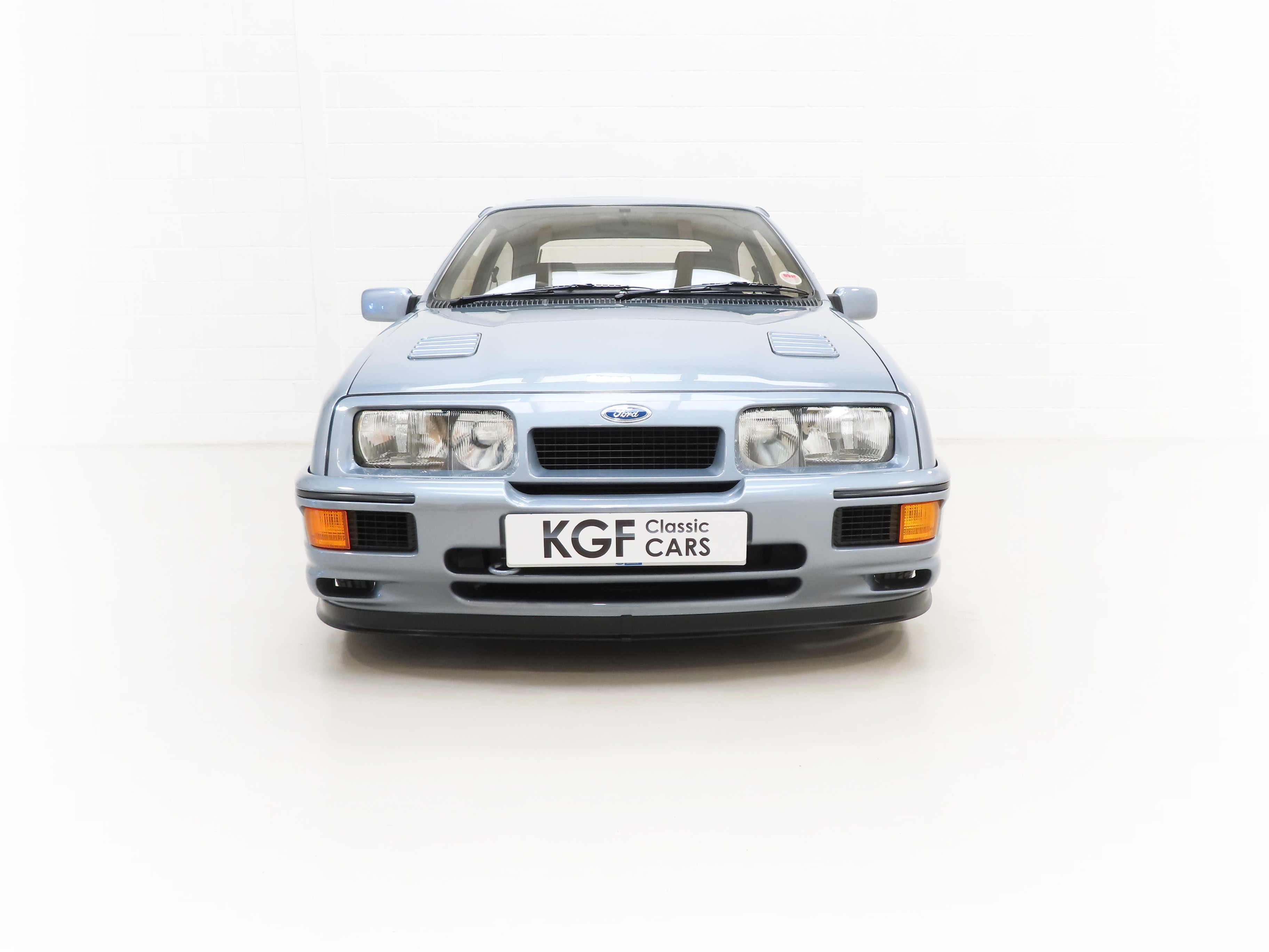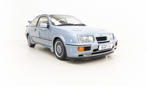 Five hundred extra special examples of the 150 mph Ford Sierra RS Cosworth went on sale in Britain on the 1st August 1987. This more powerful ‘evolution’ model was introduced to allow Ford to develop the original limited production run of 5,000 needed to allow the car to be homologated for International Touring Car Racing in Group A. Aston Martin at Tickford were assigned with converting the 500 cars and in addition to the more powerful 224bhp YBD engine, (with the potential to exceed 400bhp in race trim), numerous aerodynamic features were incorporated in the bodywork. These include a 30mm lip spoiler applied directly to the rear edge of the tailgate to increase rear downforce. New and larger cooling ducts were included in the design of the front bumper for the intercooler and the front brakes, as well as an aerodynamic splitter. Ford’s intention was for every RS500 to be finished in Black but limited stock of the regular Cosworths resulted in 56 Diamond White and 52 Moonstone Blue being converted. The vehicle was only available through 90 specialist Ford RS (Rally-Sport) dealers in Britain and was a £4,000 premium over a standard RS Cosworth. (Source: Ford News Release 87/76). This example is build number 404/500.