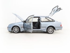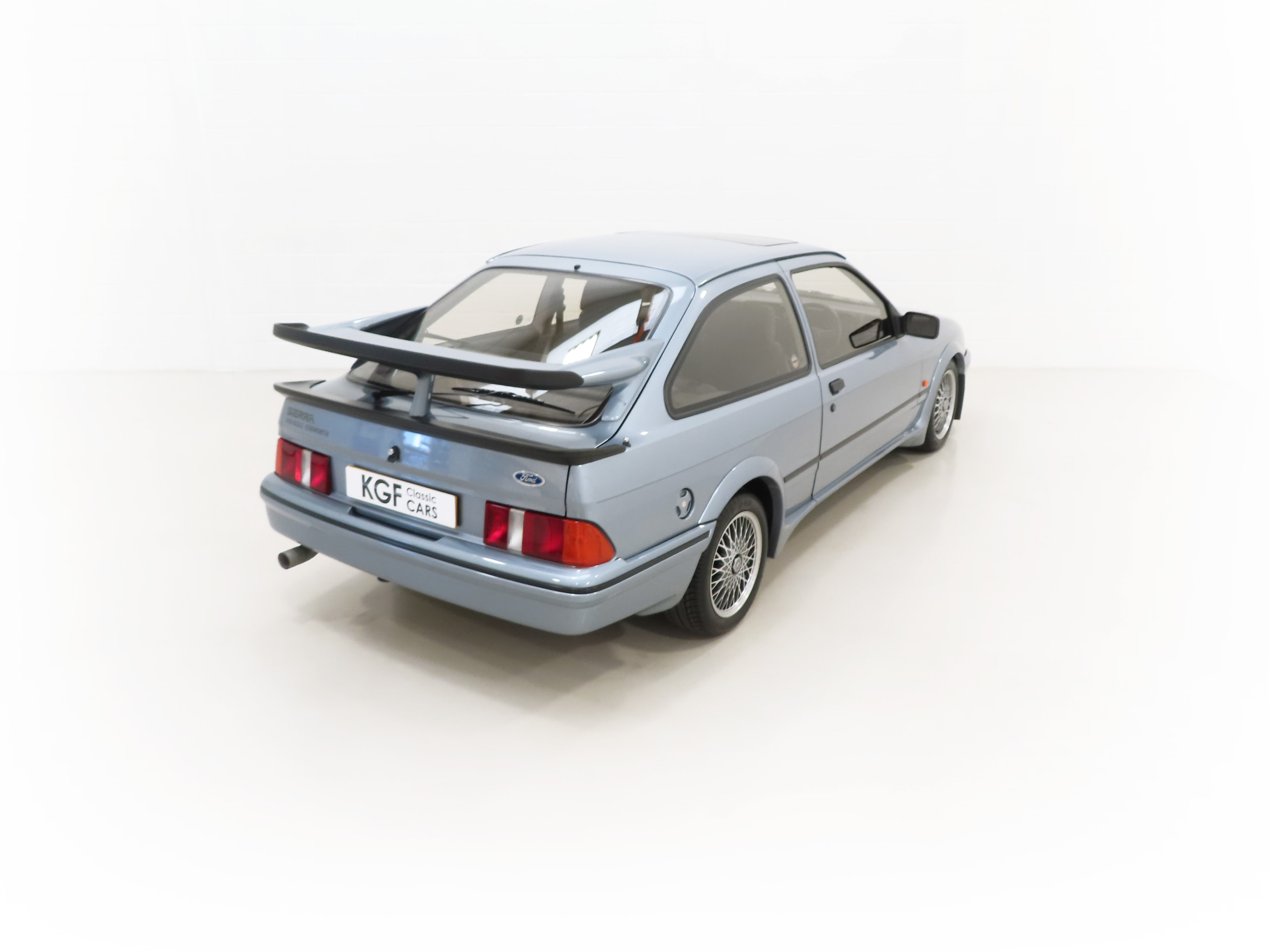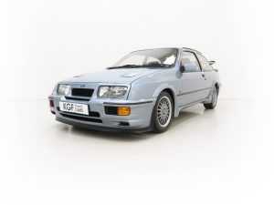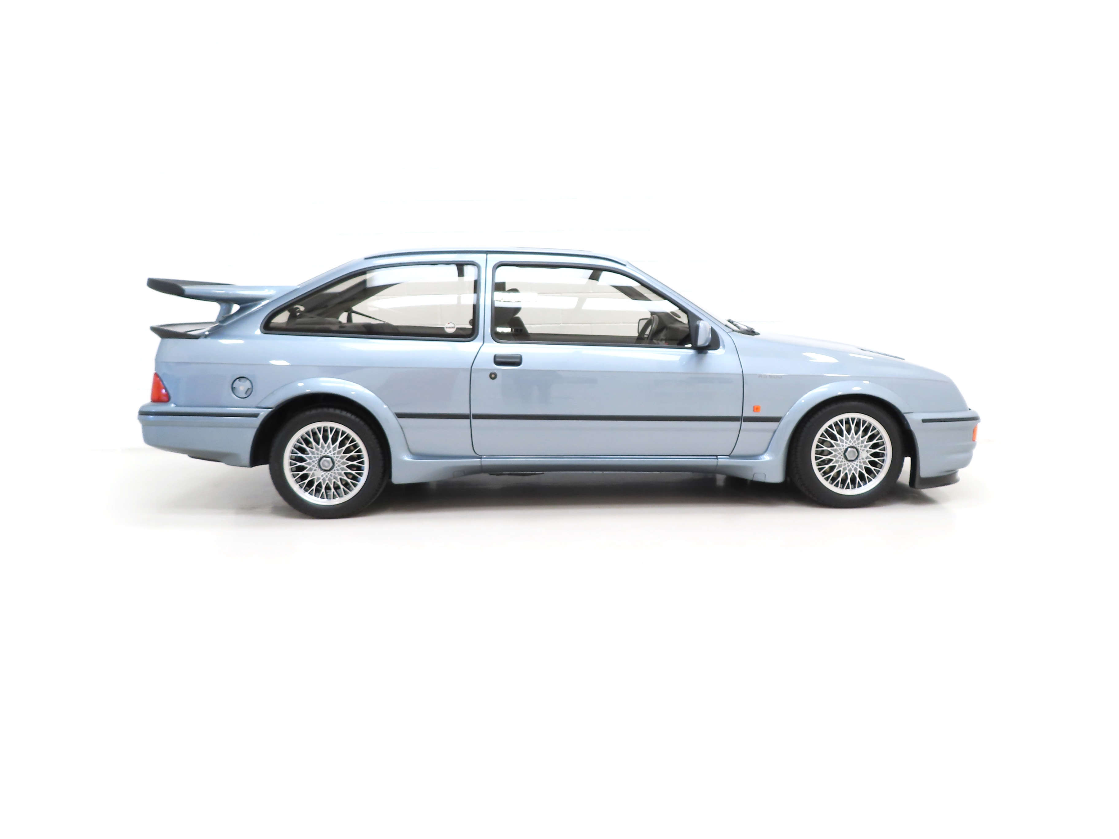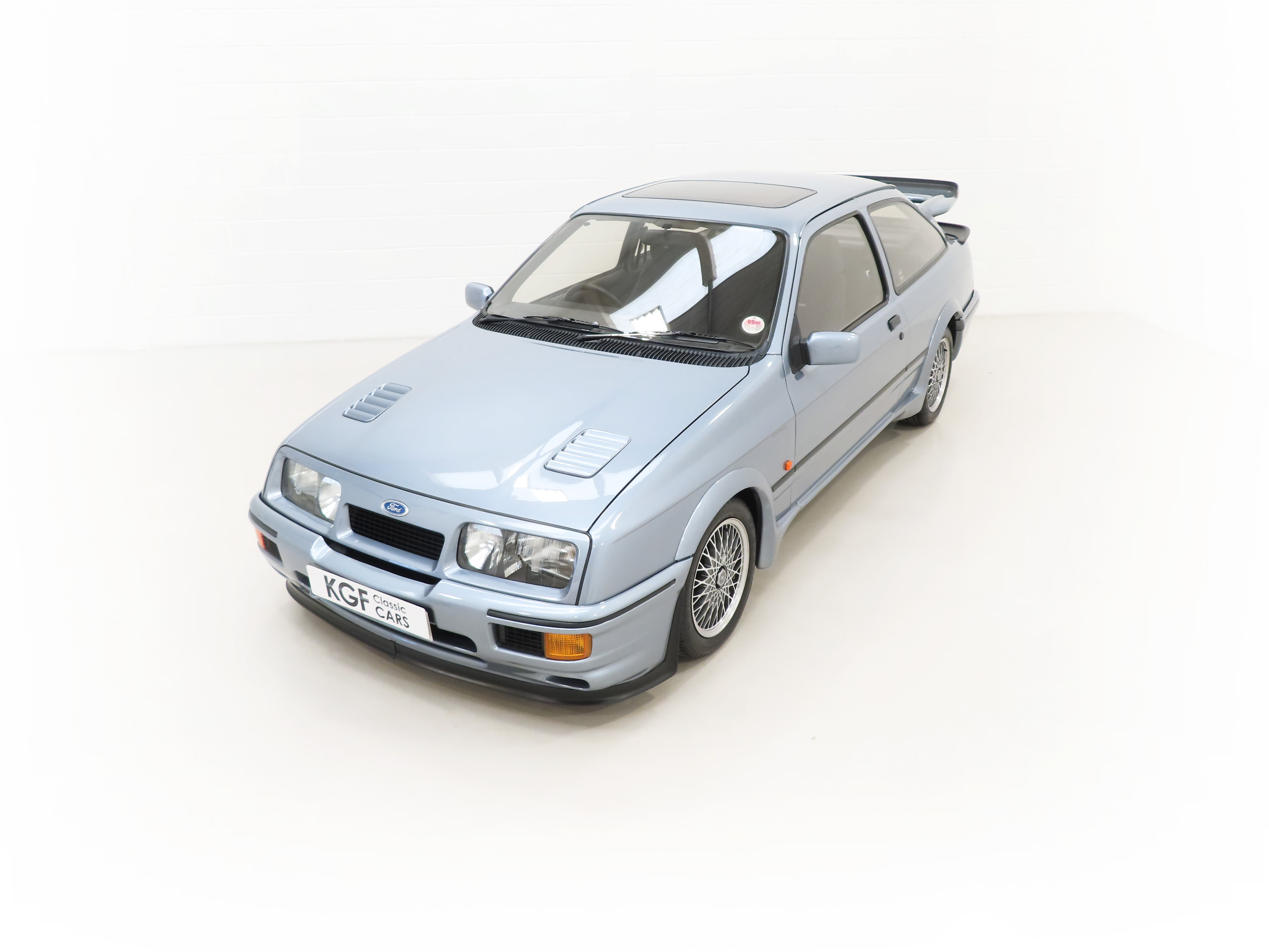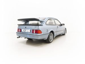 Five hundred extra special examples of the 150 mph Ford Sierra RS Cosworth went on sale in Britain on the 1st August 1987. This more powerful ‘evolution’ model was introduced to allow Ford to develop the original limited production run of 5,000 needed to allow the car to be homologated for International Touring Car Racing in Group A. Aston Martin at Tickford were assigned with converting the 500 cars and in addition to the more powerful 224bhp YBD engine, (with the potential to exceed 400bhp in race trim), numerous aerodynamic features were incorporated in the bodywork. These include a 30mm lip spoiler applied directly to the rear edge of the tailgate to increase rear downforce. New and larger cooling ducts were included in the design of the front bumper for the intercooler and the front brakes, as well as an aerodynamic splitter. Ford’s intention was for every RS500 to be finished in Black but limited stock of the regular Cosworths resulted in 56 Diamond White and 52 Moonstone Blue being converted. The vehicle was only available through 90 specialist Ford RS (Rally-Sport) dealers in Britain and was a £4,000 premium over a standard RS Cosworth. (Source: Ford News Release 87/76). This example is build number 404/500.