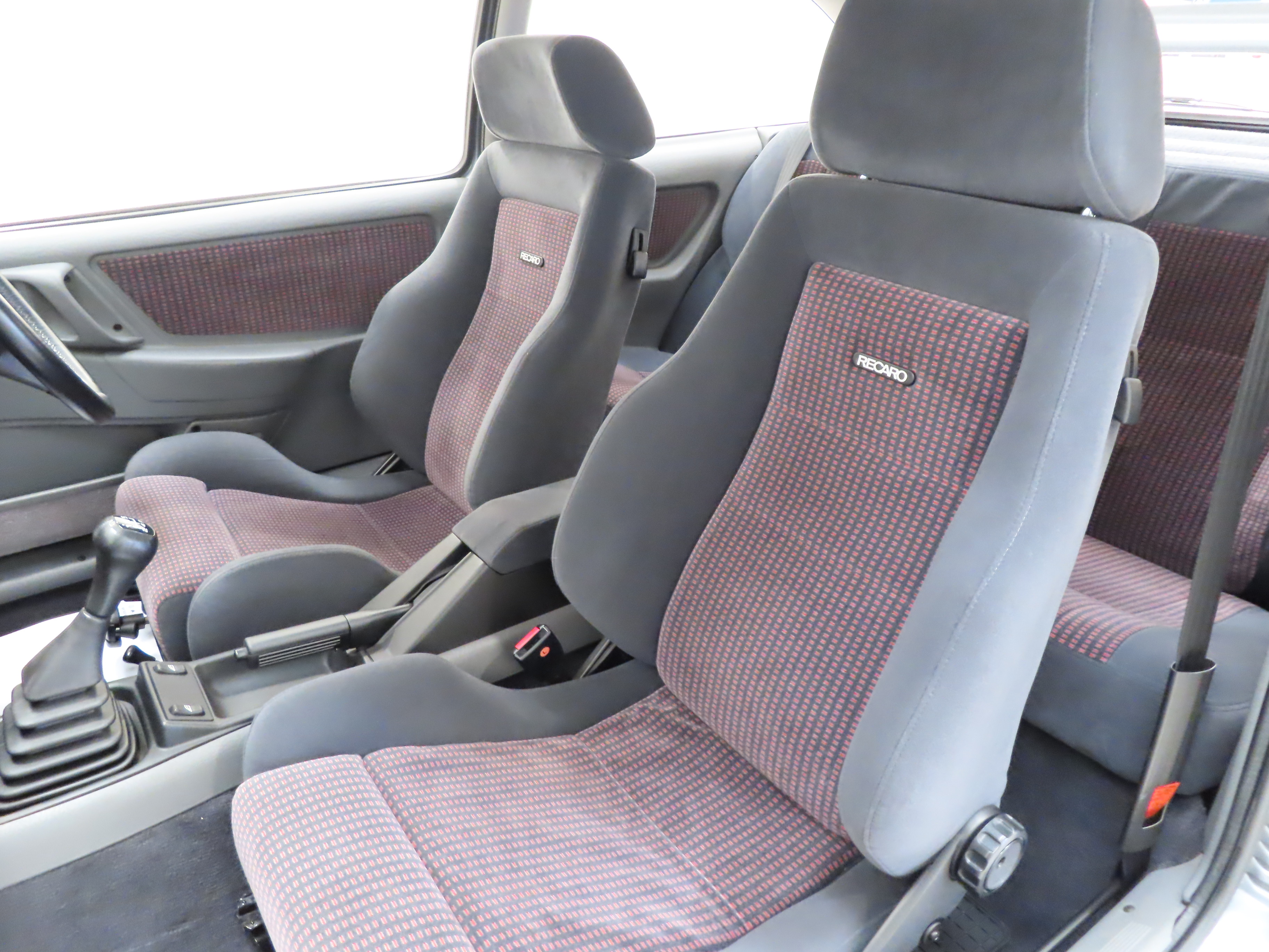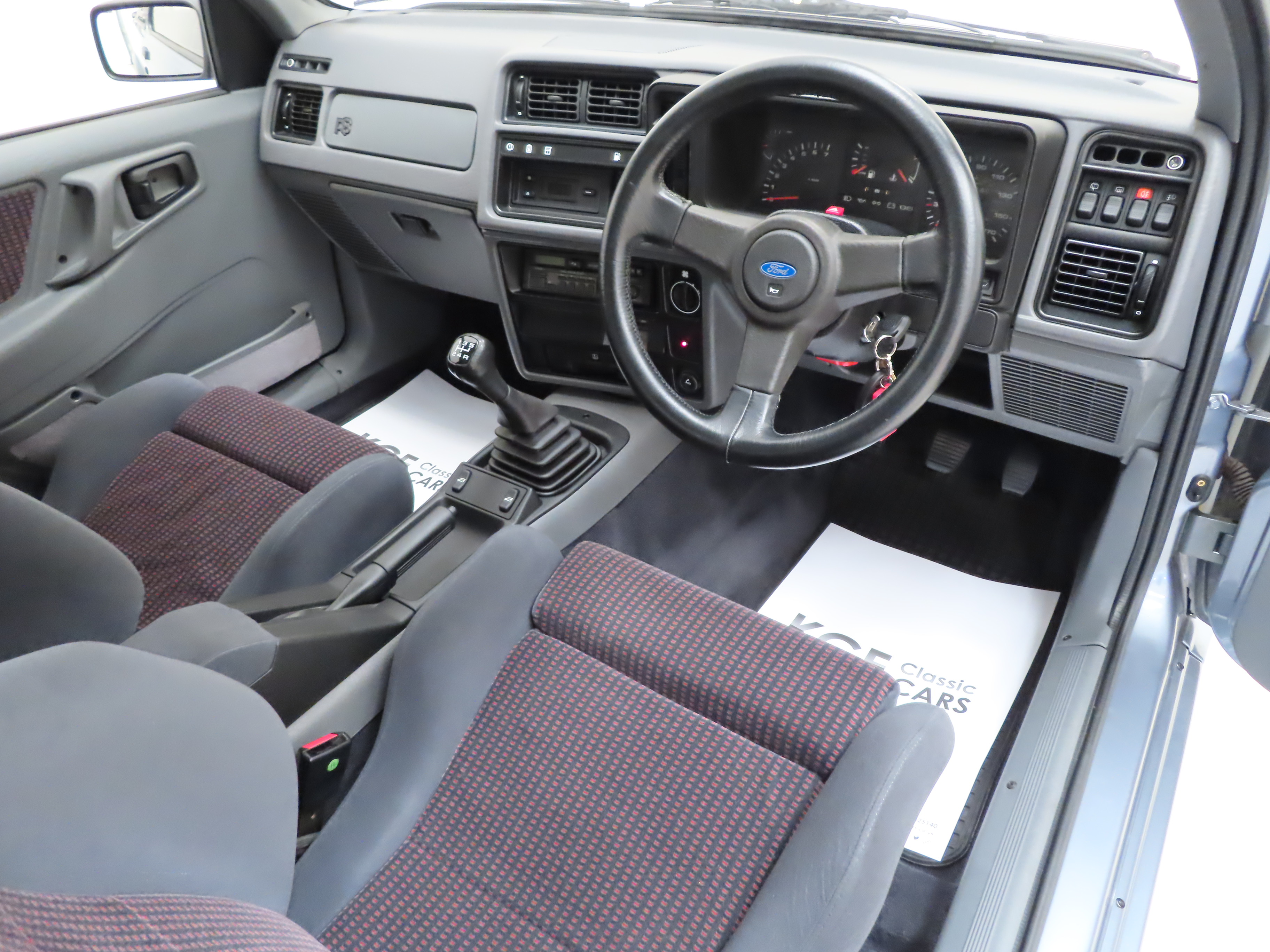 Bodyside mouldings, integral front air dam, electrically operated colour coded heated door mirrors, colour coded lockable fuel filler cap, single slot grille with bonnet cooling vents, halogen headlamps, single plane rear wing spoiler with trailing edge fence, lower tailgate mounted spoiler, tinted glass, wiper spoilers, tailgate wash/wipe, laminated windscreen, central locking with torch key, extended centre console, cigar lighter, quartz digital clock, fascia light dimmer, leather gear knob and three-spoke sports steering wheel, 3-speed heater fan, cassette storage, electronic sound system (Model ECU2) with power amplifier, electric aerial, Recaro Sports front seats, tilt and slide sunroof, tachometer with turbo boost gauge, trip recorder, Clear Hands warning lights, electric front windows, first aid kit, front fog lamps (not fitted but supplied). Dealer Accessories; Ford rubber mats