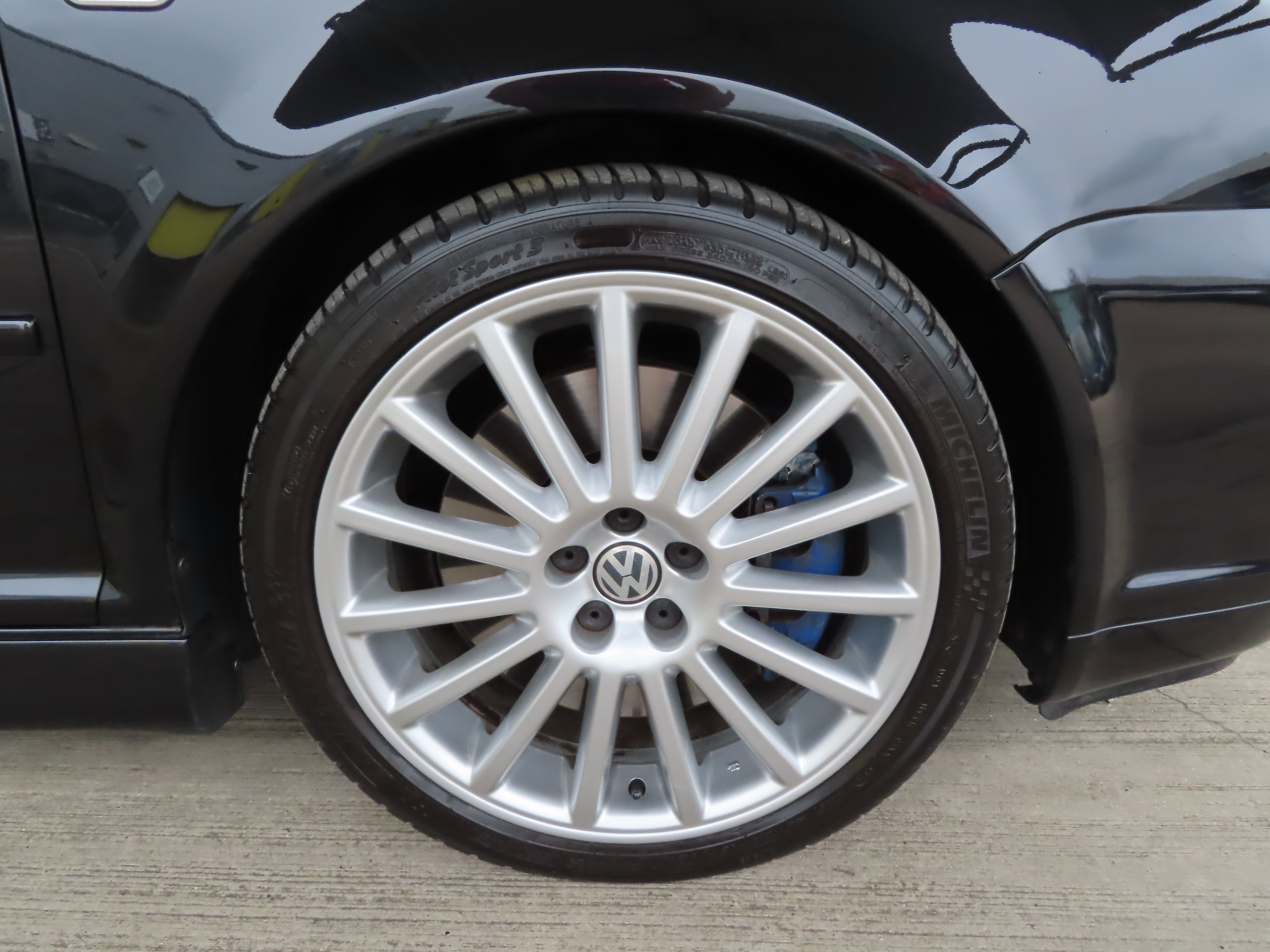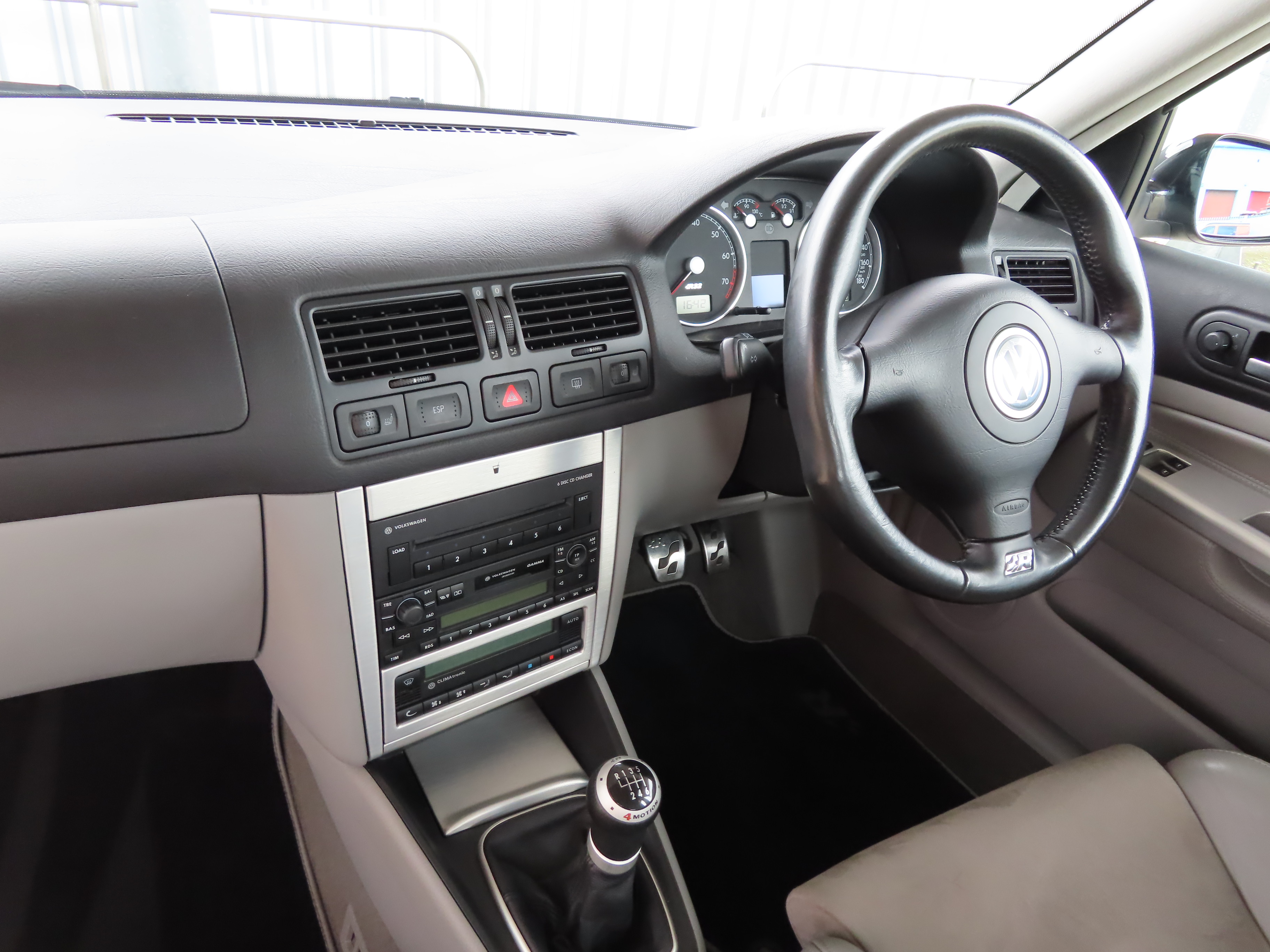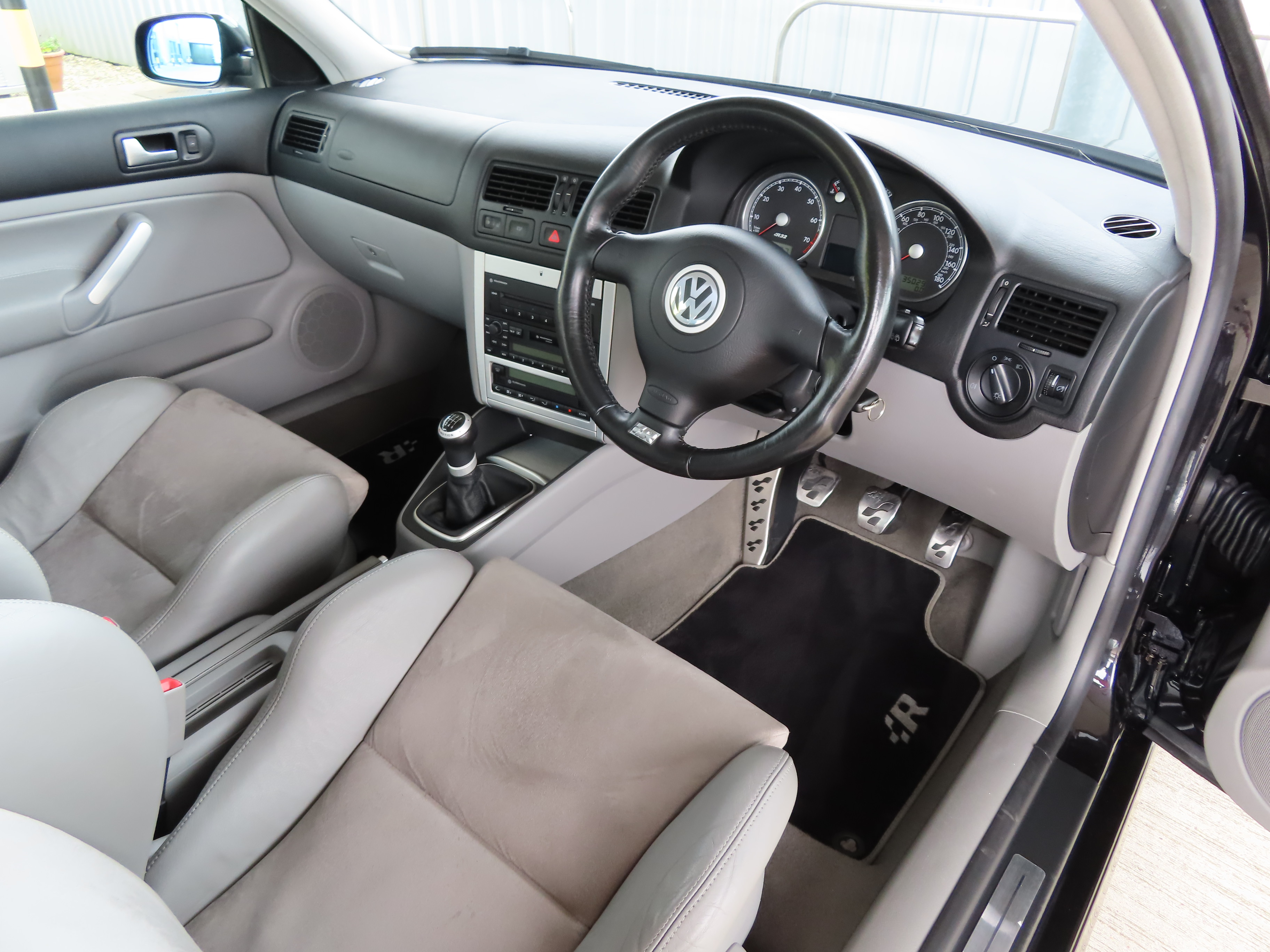 Honeycomb air intake, roof spoiler, Xenon headlights with wash function, wide sills with R32 inner sill logo, ISOFIX, driver, passenger, side and curtain airbags, chrome pack, darkened rear lenses, leather steering wheel and aluminium pedals with R32 logo, textile R32 floor mats, multi-function computer, Gamma radio cassette with 6-disc changer and 8 speakers, Climatronic air conditioning, electric heated door mirrors, heated seats, rain sensor, interior dimming mirror.