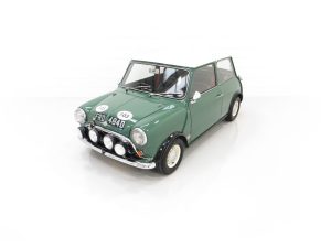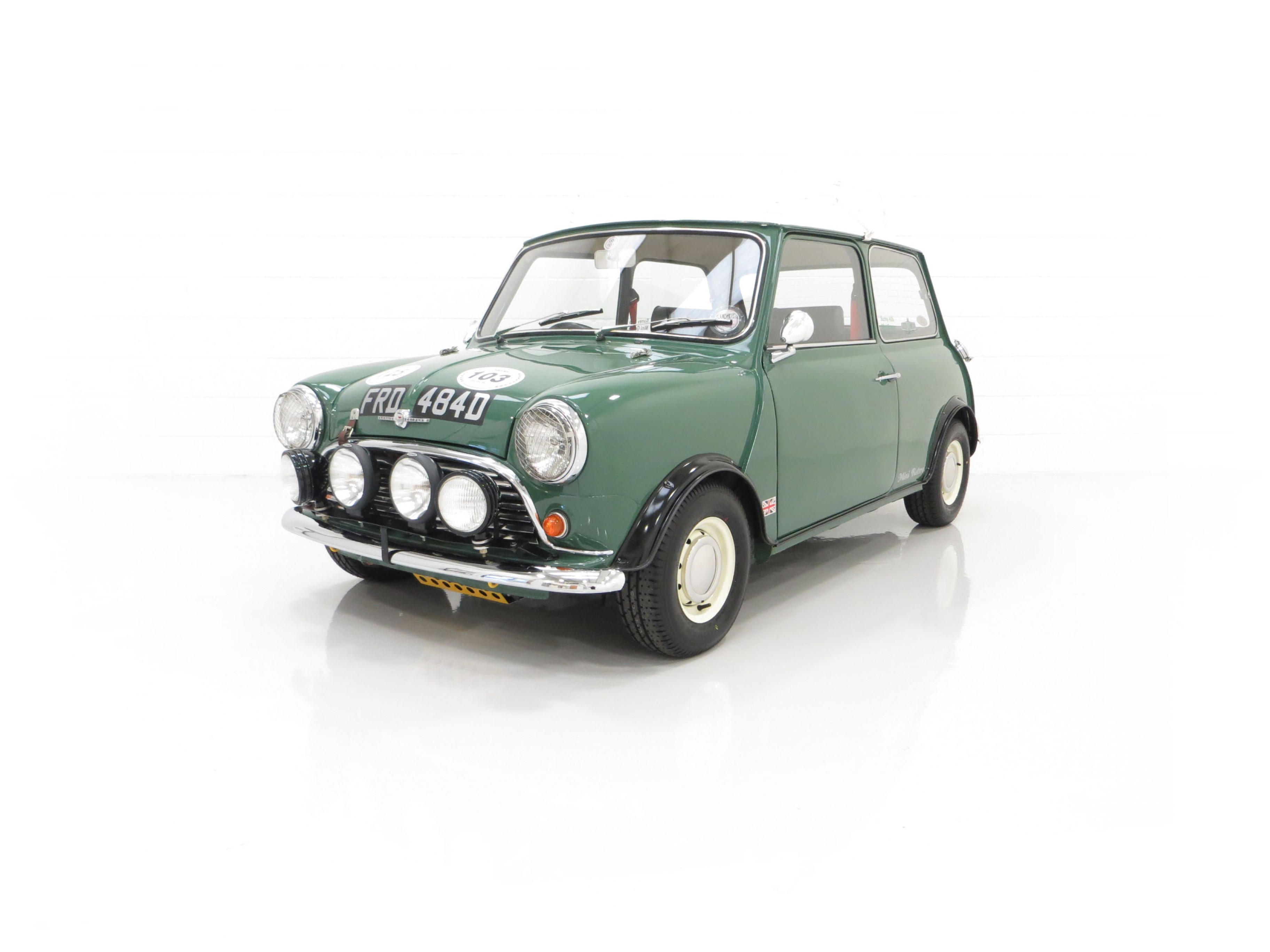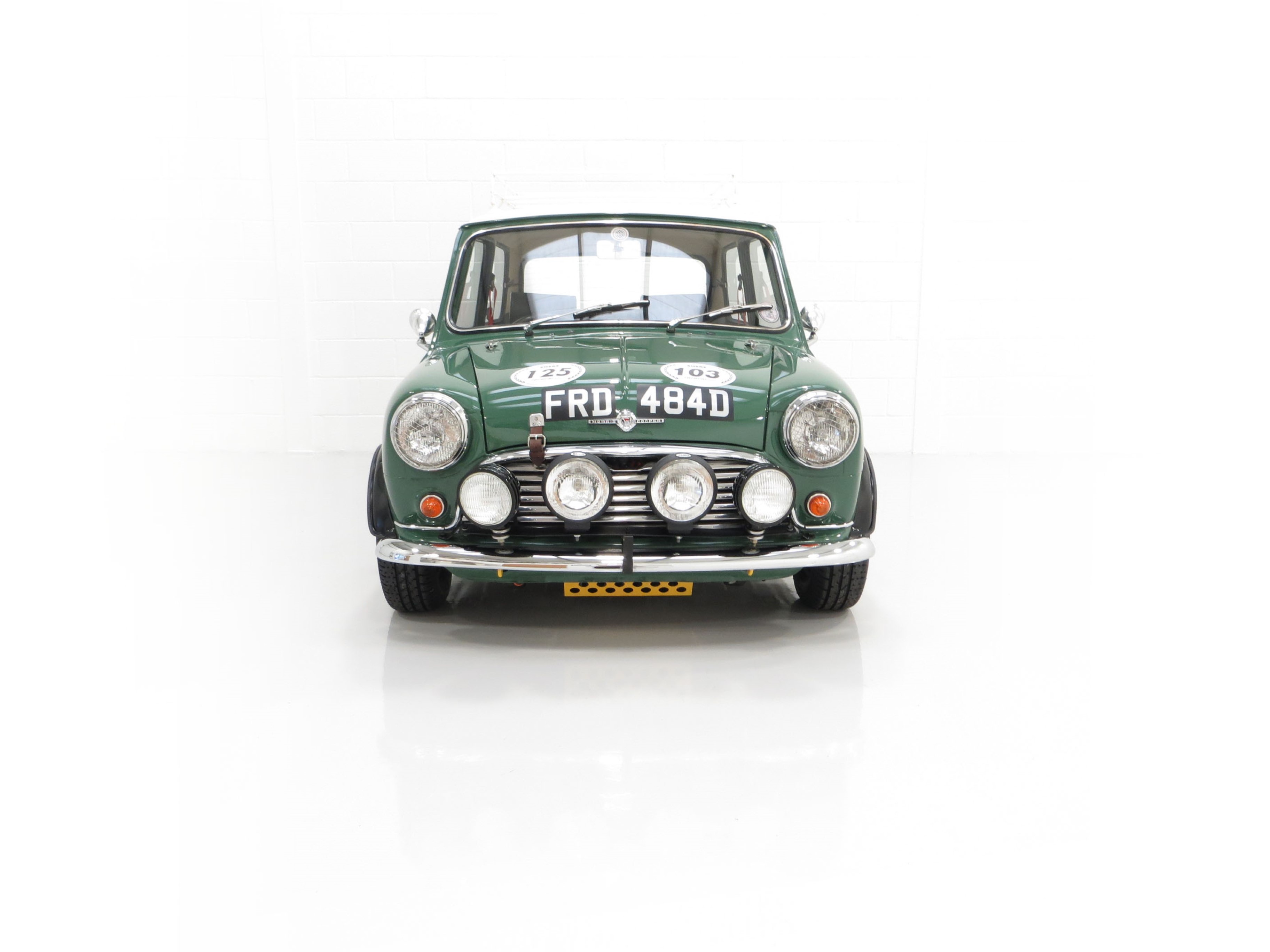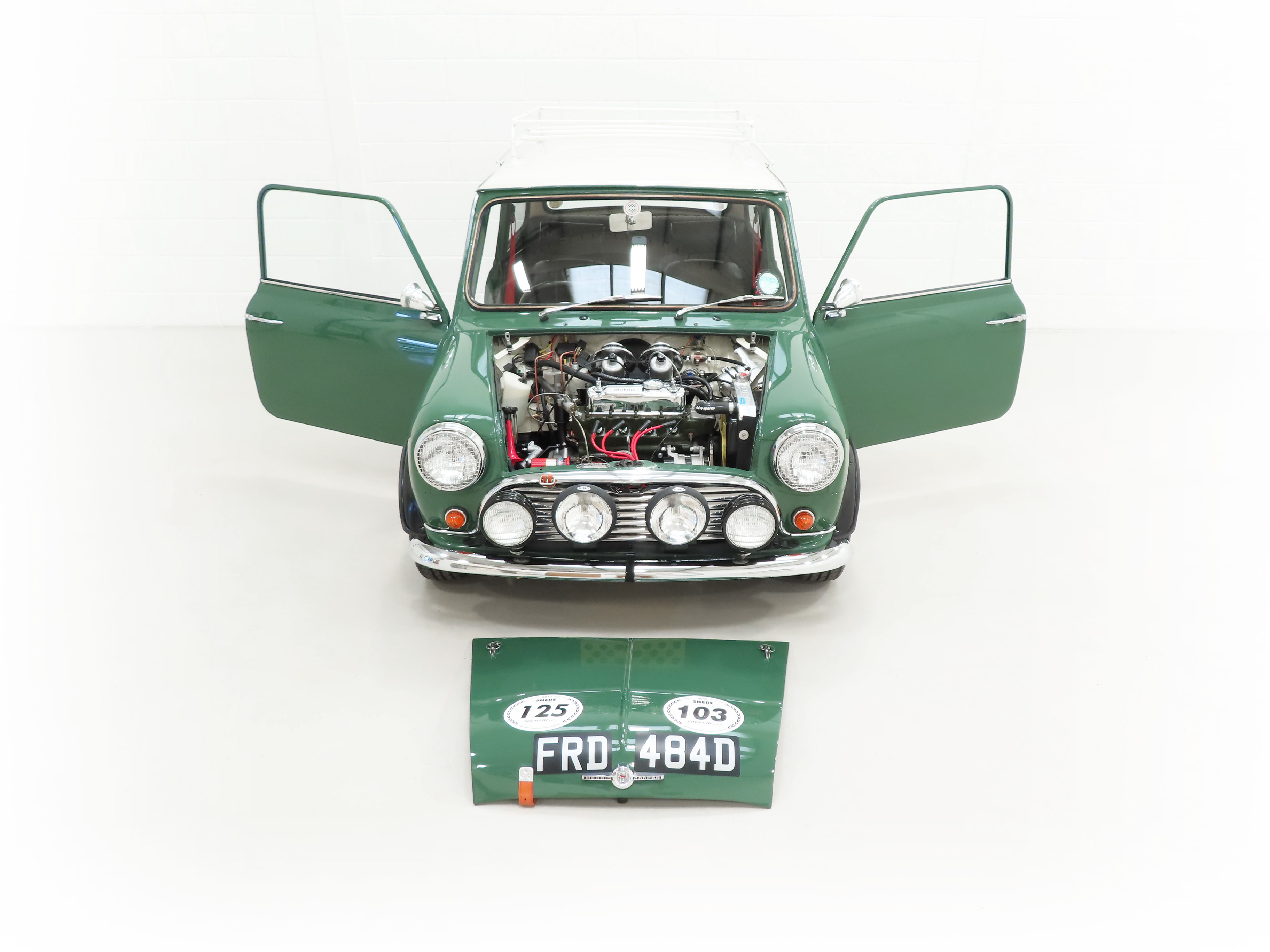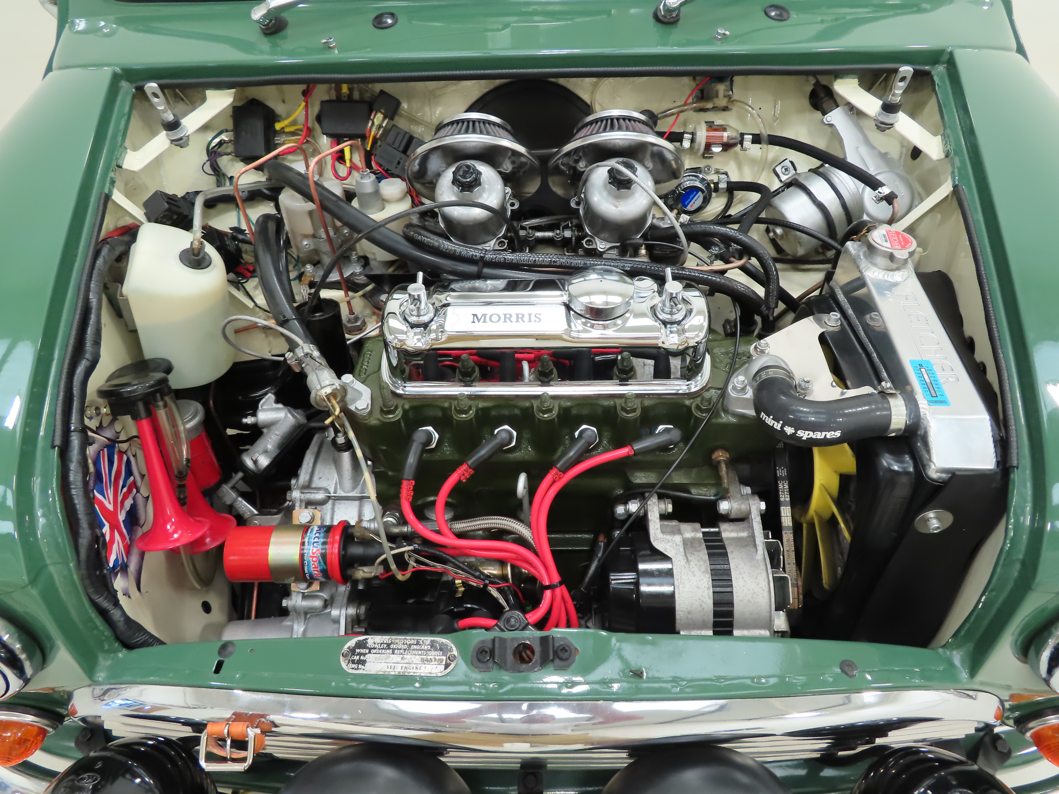 Rear bumper overriders, chromed number plate lamp, hinged rear number plate, opening rear windows, fresh air heater, two crushable sun visors. Exterior Accessories; Steel Cooper ‘S’ wheels, wheel arch spats, bullet door mirrors, headlamp guards, front fog and driving lamps, quick-release bonnet, leather bonnet strap, reversing lamp, alloy sump guard, twin fuel tanks with Monza filler caps, roof rack. Interior Accessories; Battery isolator, bucket seats, custom instrument panel with extended toggle switches, Smiths gauges including Tachometer, oil pressure, water temperature, ammeter and clock, map reading lamp, 2X USB ports, John Cooper Moto-Lita steering wheel. Modifications; 1293cc Stage 2 engine, reground nitro-carburised crankshaft, Duplex timing gears and chain, high capacity steel backed oil pump, twin SU carburettors, K&N air filters, Fletcher alloy radiator and electric fan, Accuspark electronic ignition, Proflow Sytec adjustable fuel pressure regulator, Facet electric fuel pump, braided fuel hoses, X-Drive starter motor, uprated Verto clutch kit, front brake disc conversion, SPAX adjustable shock absorbers, 2.2 turn quickrack, twin air horns.