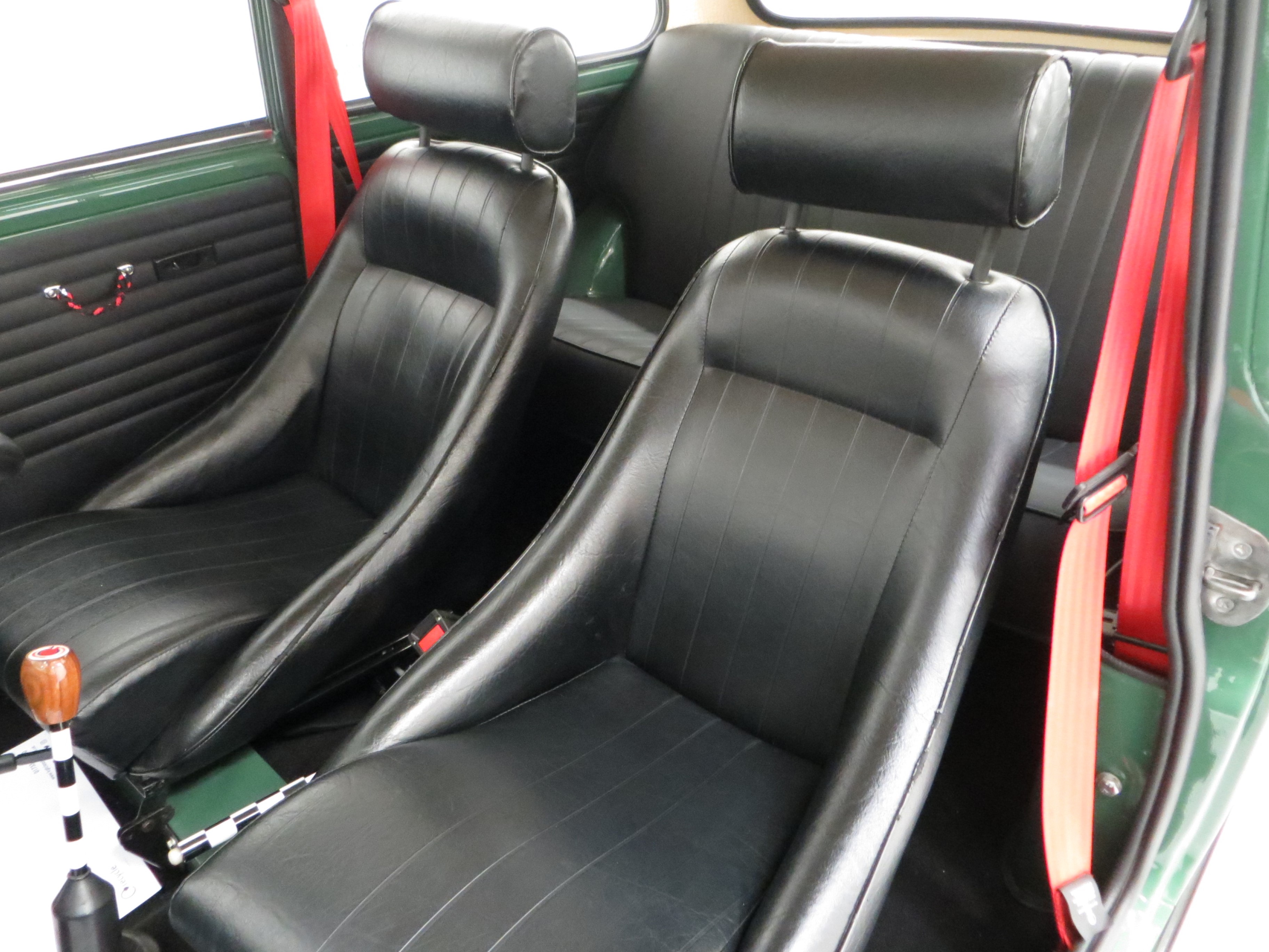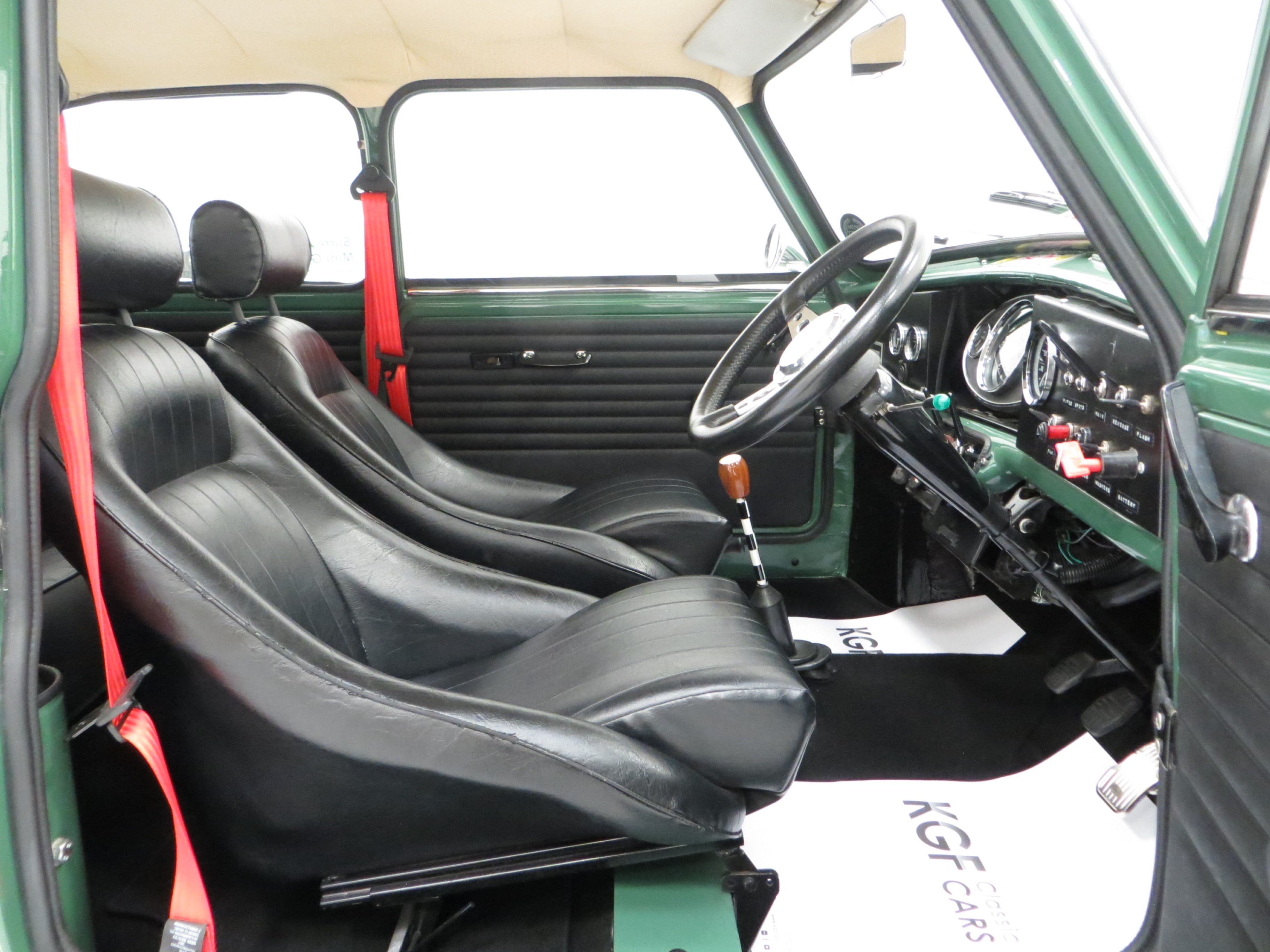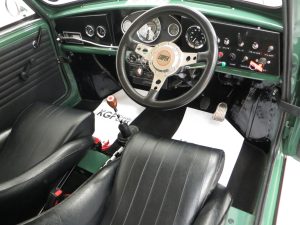 Steel Cooper ‘S’ wheels measuring 4.5×10 inches and finished in immaculate and correct Old English White are shod in premium Yokohama A008 165/70 R10 tyres fitted in 2020 and covering just 5 miles. Uprated disc brakes to the front and drums to the rear along with SPAX adjustable shock absorbers and a 2.2 turn quickrack ensure this Mini handles, turns and stops exactly like a rally car should!