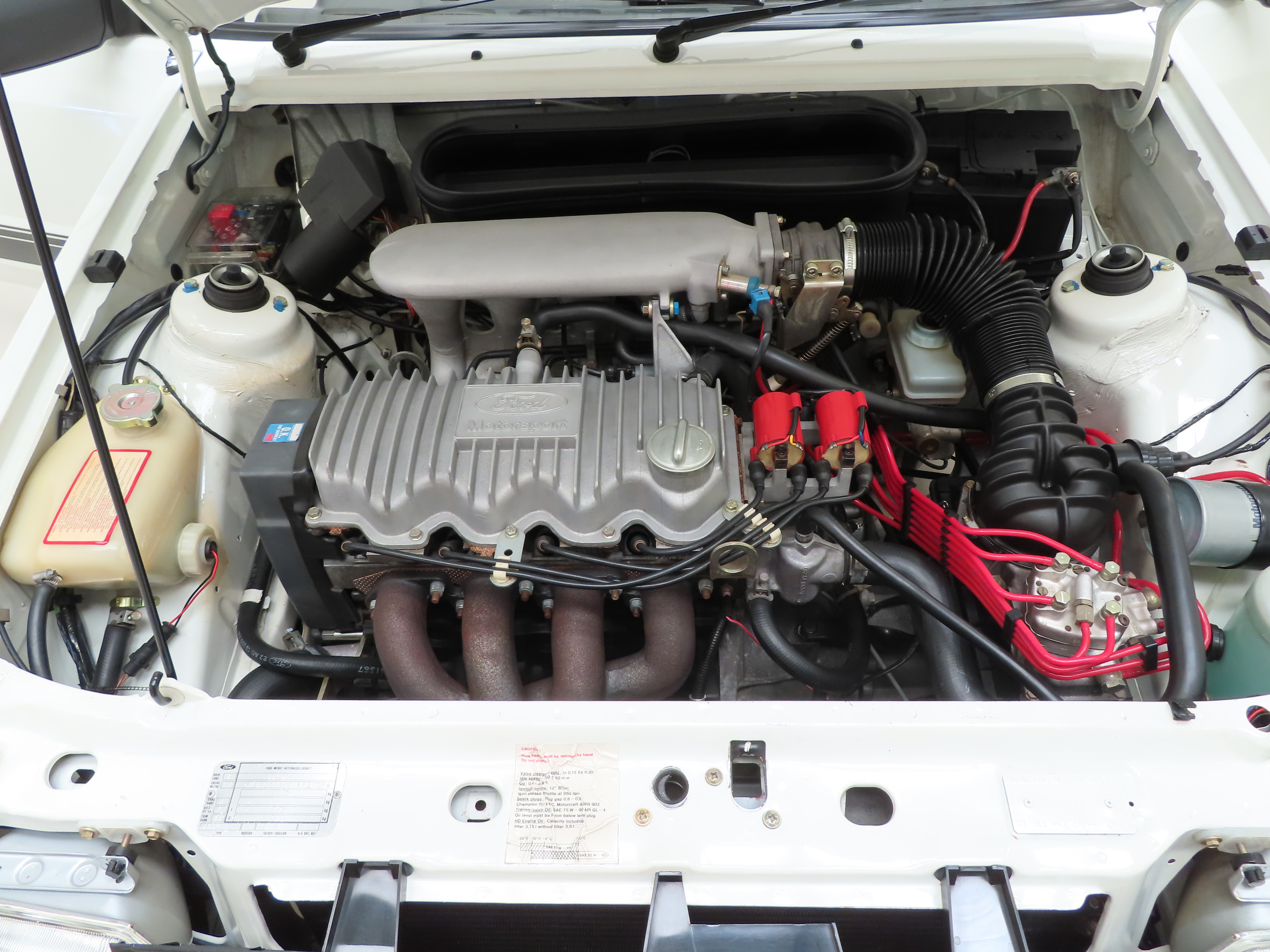 Fitted with Fords transverse mounted 1600 OHC Compound Value angle Hemispherical chamber (CVH) unit producing 115 BHP. Mated to the Bosch K-Jetronic Fuel Injection System incorporating deceleration fuel shut-off, special alloy cylinder head and camshaft the car has a top speed of 118mph and achieves 0-60 in 8.7 seconds. The engine bay is remarkably clean with even the delicate factory stickers being original. The twin coil set-up and finned cast alloy rocker cover are proudly on display ready for bonnet up exhibiting! The gear changes are light and a joy to use with the unique 0.83 fifth gear ratio fitted only to the RS1600i to close the gap between fourth and fifth gear.