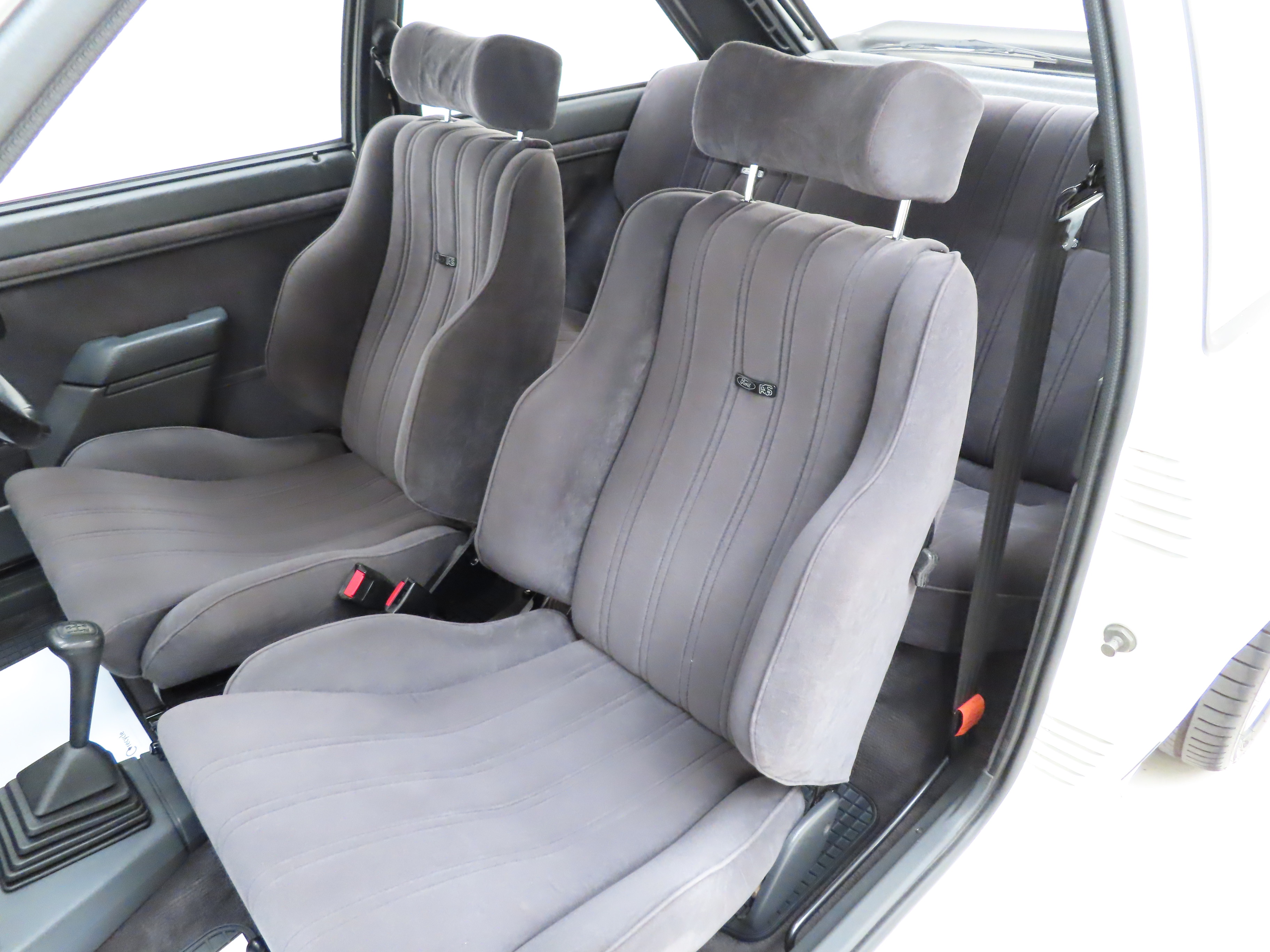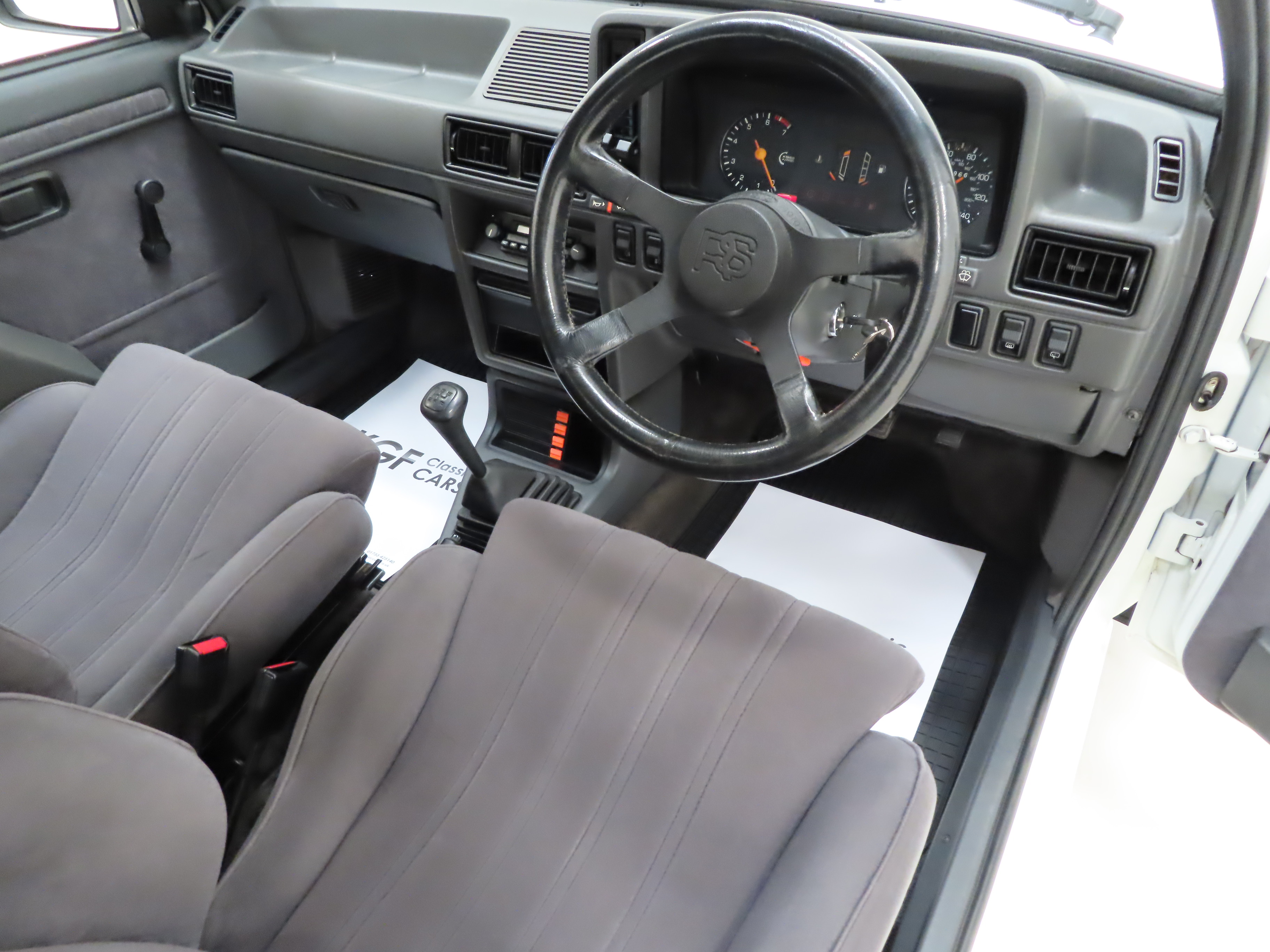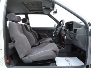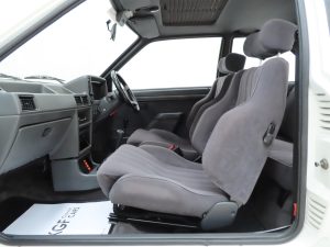 This RS1600i is finished in iconic Ford Diamond White, (Code B 3), and has a faultless uniform shine across every factory fitted and date stamped panel. The distinctive original RS decals are perfect and the rear wing is straight with no distortion issues and the front spoiler displays clearly the Motorsport logo and part number. There is a tiny chip to the Ford front windscreen and a touched-in mark to the bonnet which has never been painted. The correct stance is instantly recognisable as this example still sits on the special Koni shock absorbers only fitted to the RS1600i lowering the car by two inches. All components are exactly as it left the Ford factory and the underside is spotlessly clean and fully detailed. A rare and desirable example of the first front wheel drive Ford ever to wear the RS badge.