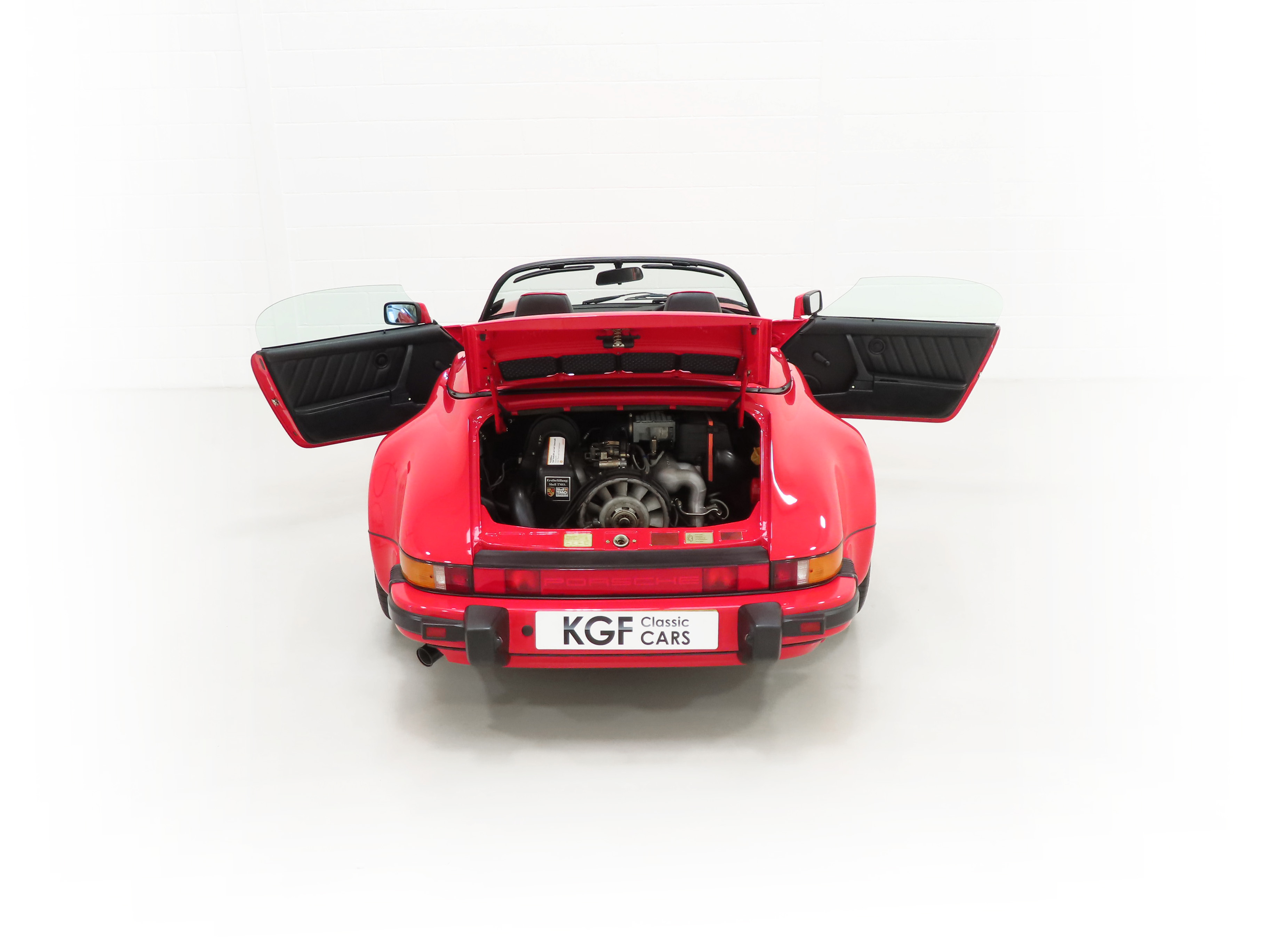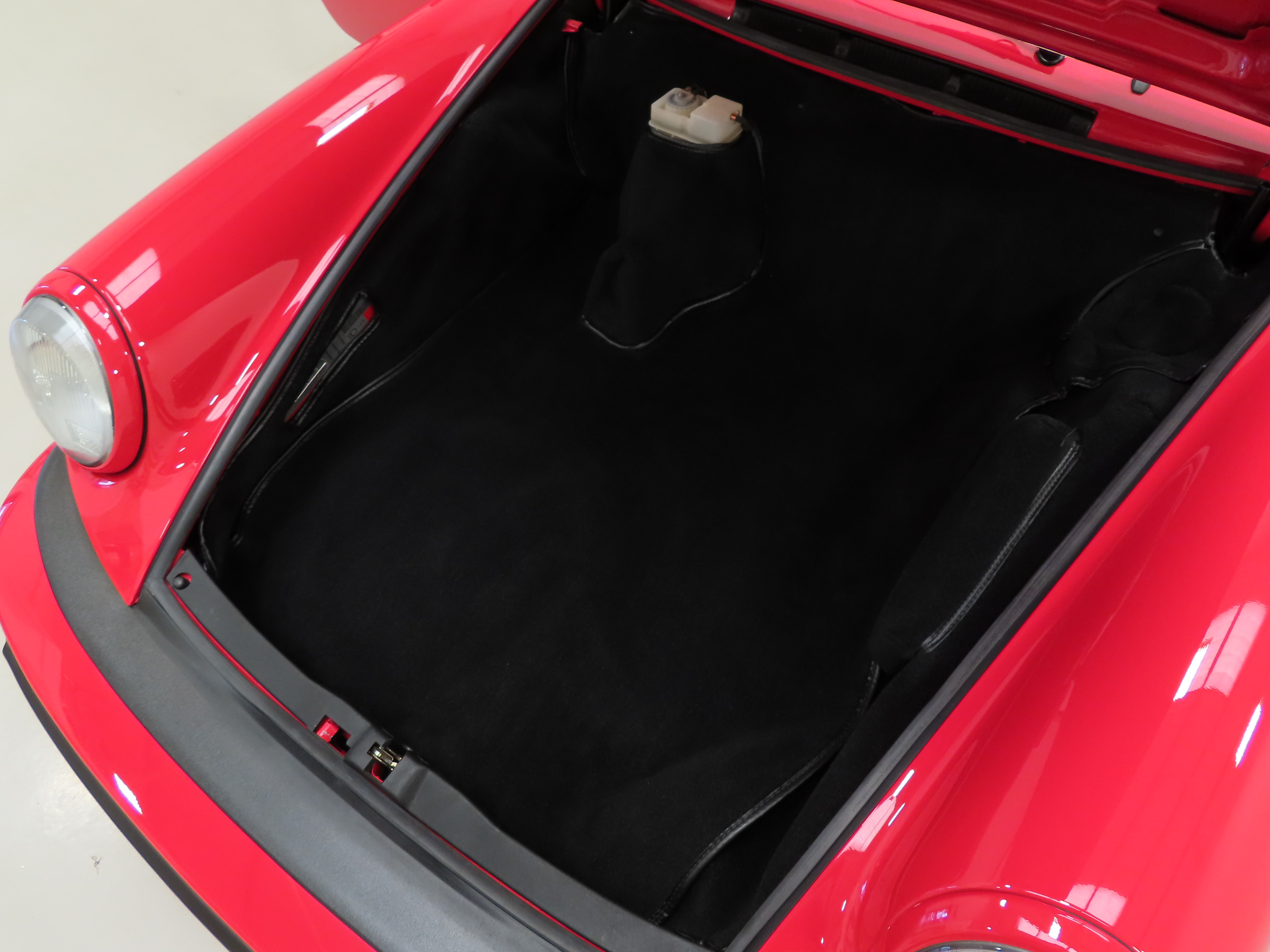 Being largely hand assembled, the Porsche G Model has a quality feel with meticulous attention to detail and this ultra-low mileage example upholds that notion perfectly. Trimmed in Black Leather, (Code LT), the optional sports seats with red piping offer perfect support and even the delicate piping has no wear. All interior materials are factory fresh and even the needles to all the working dials are bright red, thanks to perfect indoor storage. The stitched leather sports steering wheel is beautiful and the pedal rubbers unworn. The silk velour carpets are protected by carpet mats and the front screen ‘check oil’ and glove box ‘heater control’ stickers remain attached. To achieve a DIN curb weight of just 1220kg many luxury items were deleted from the Speedster such as electric windows and central locking and to ensure sufficient visibility through the cut-down windscreen, the seat rails were dropped by 20mm. The front luggage compartment is pristine with an unused tool kit, jack, brace, Porsche tyre pressure gauge and clear plastic tyre change sheet. The important correct factory code sticker, as duplicated in the Guarantee and Maintenance booklet, is attached to the bonnet lid. Without doubt, one of the best remaining examples of this iconic thoroughbred.