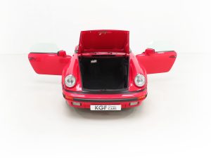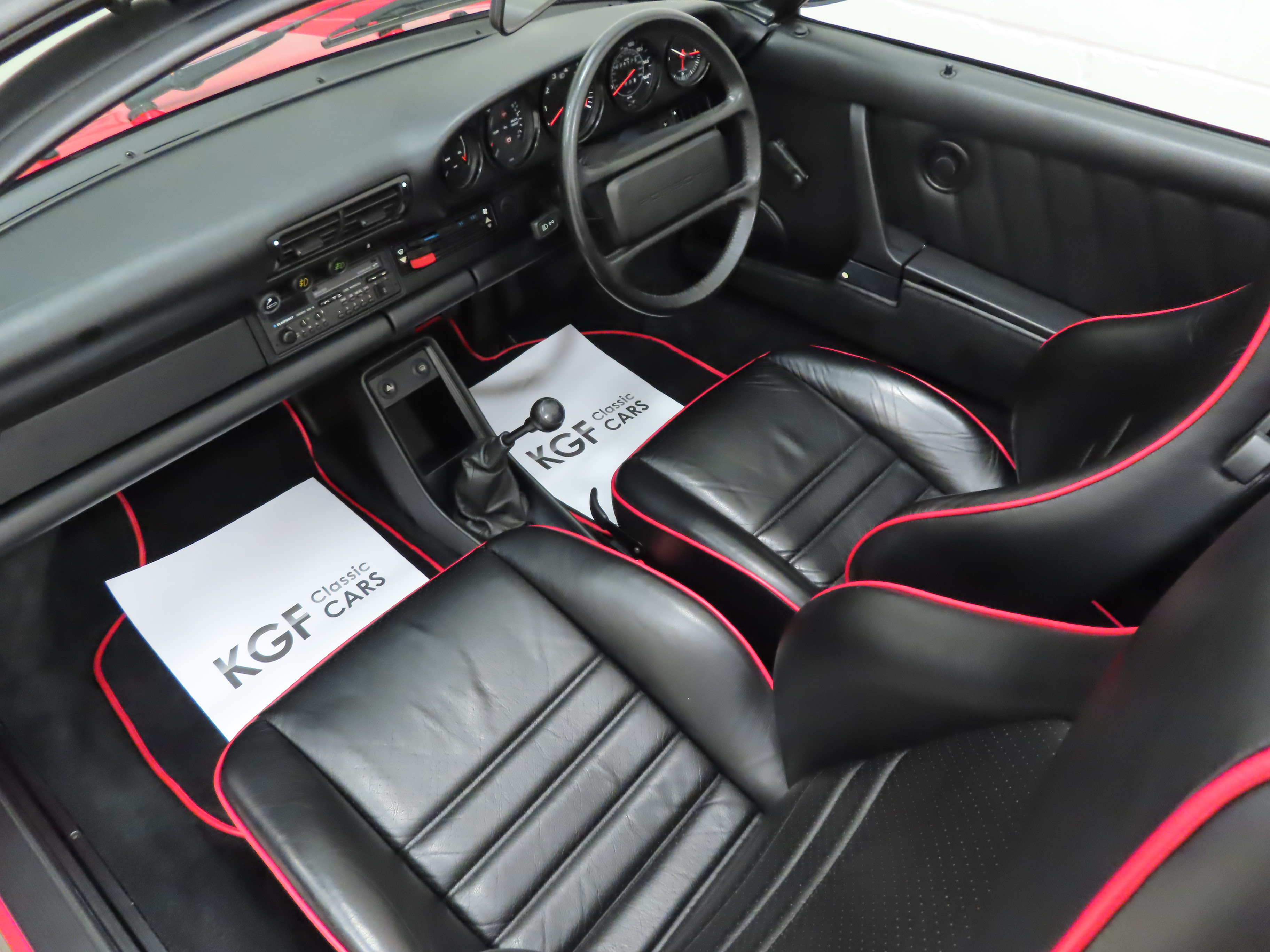 Zinc-galvanised steel body, hydraulic impact tubes, integrated fog lights, Bosch halogen headlights, quartz analogue clock, window lifters, heating controls, brake pad wear, brake warning and seat-belt warning lights, tachometer, cigarette lighter, fuel/oil level gauges, oil temperature/pressure gauge, hazard warning lights, lockable stowage compartments, engine compartment light, tool roll. Factory Options; Turbo Look, Locking Differential 40%, Fuchs wheel centres painted white, wheel caps with coloured Porsche crest, sports seats with electrical height adjustment, luggage compartment velour carpet, cassette-radio Blaupunkt Toronto SQR 46, Hi-Fi amplifier. Accessories; Speedster indoor car cover, 911 carpet mats.
