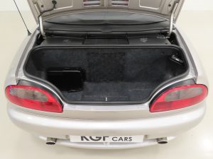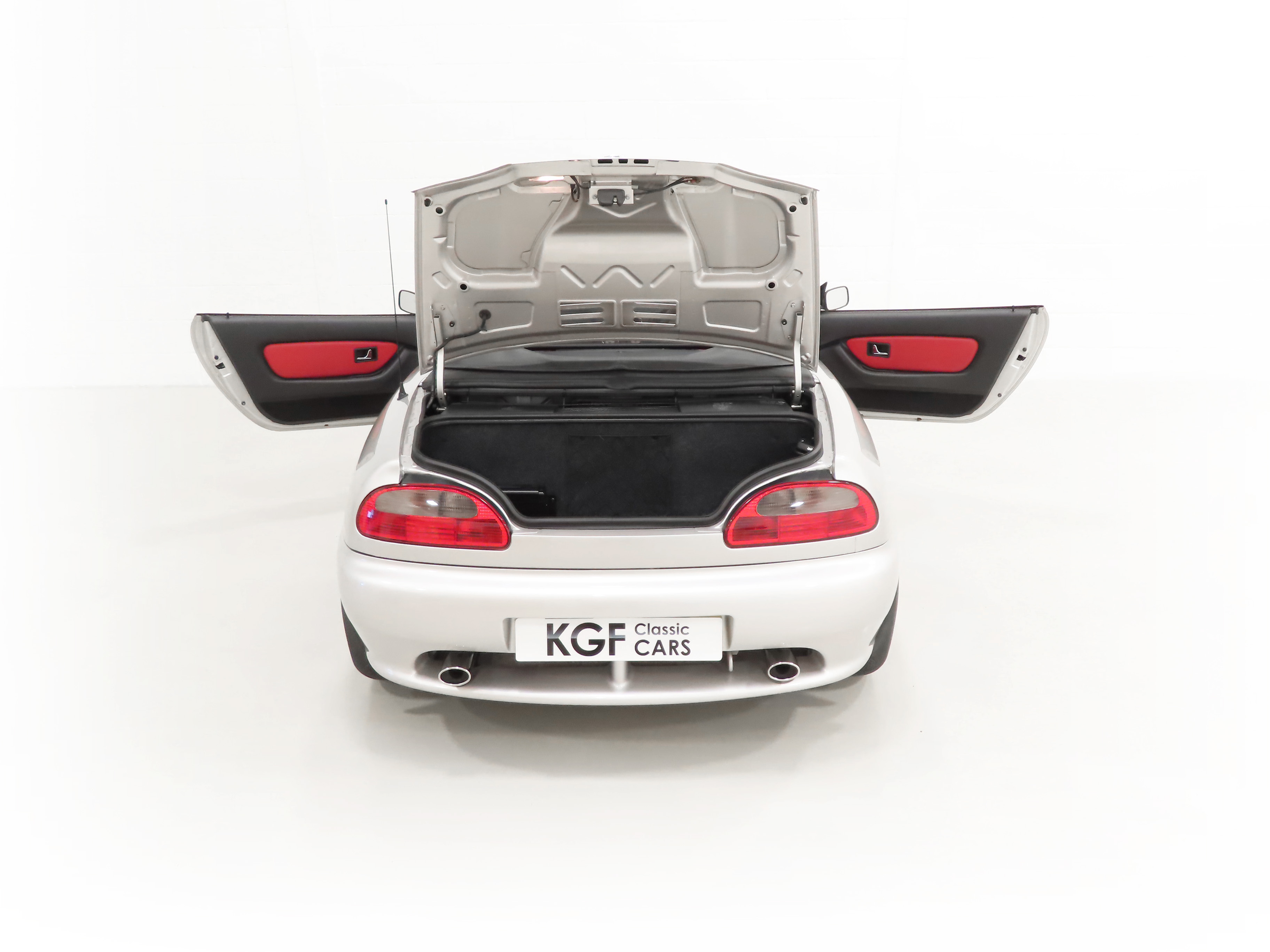 This incredible flagship MGF VVC is finished in sparkling Platinum Silver, (Code MNX). The paintwork boasts a deep gloss shine throughout and has clearly benefited from garaged storage and just 12,581 miles from new! All factory panels are original and the underside, wheel arch apertures and shuts are preserved and very clean. The original woven acrylic fabric hood is deep black and the plastic screen pleasingly clear with only very light scratches. All trim, light clusters and badges are in marvellous order and the correct orange indicator lenses denote an earlier car. There is a small ding to the rear panel barely noticeable. Many dealer fitted accessories separate this car from normal offerings with everything from an expensive hard top and front fog lights to the useful windstop. This example will satisfy the MG fanatic seeking a low mileage and low owner cherished example with large doses of fun!