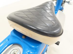 The chrome rims are bright and both wheel hubs have been restored, laced with new spokes, wheels trued and fitted with matching Vee Rubber 2.25-14 24B tyres which have masses of tread. The cable operated drum brakes work affectively but require a firm squeeze.