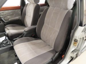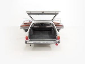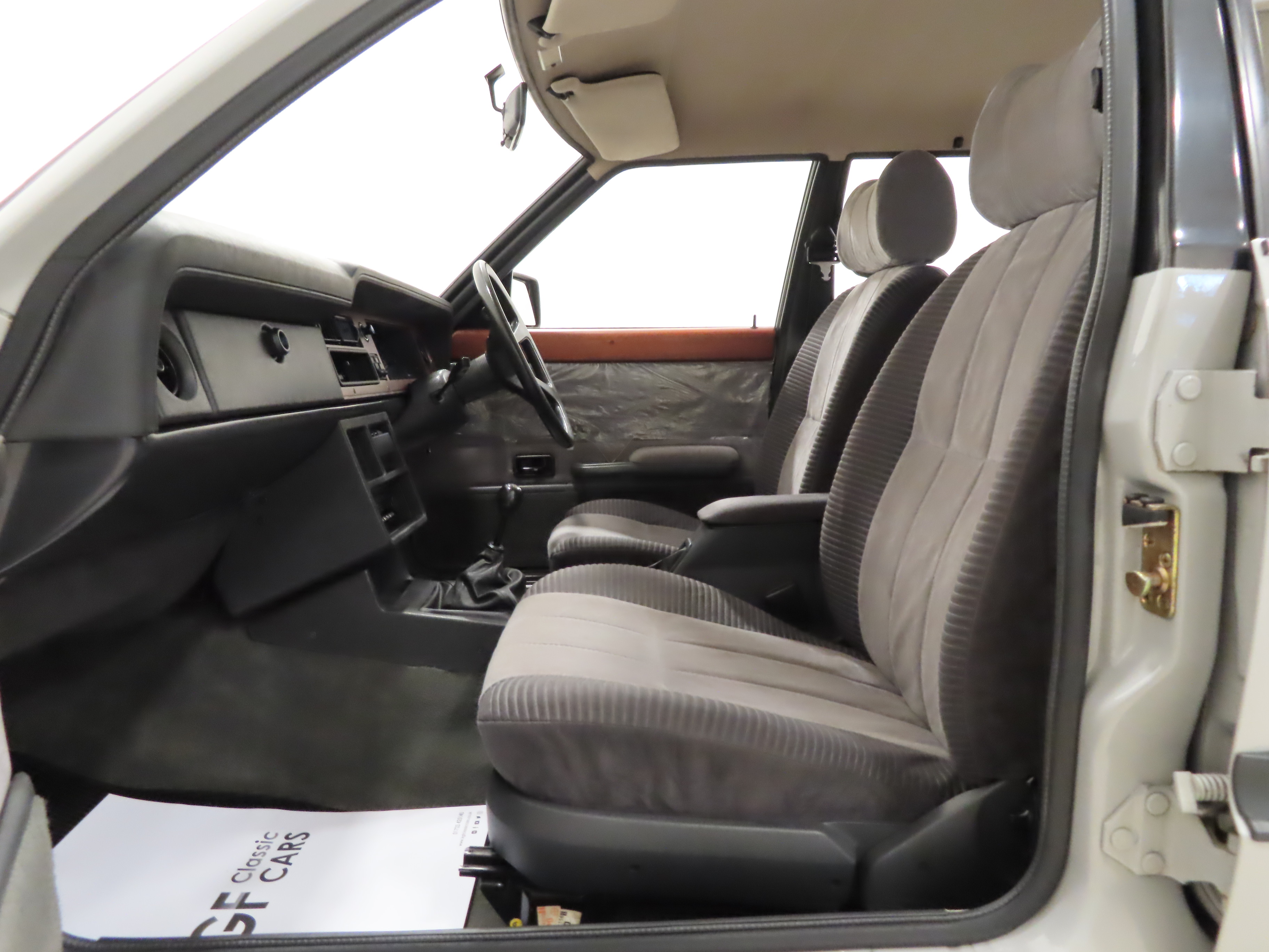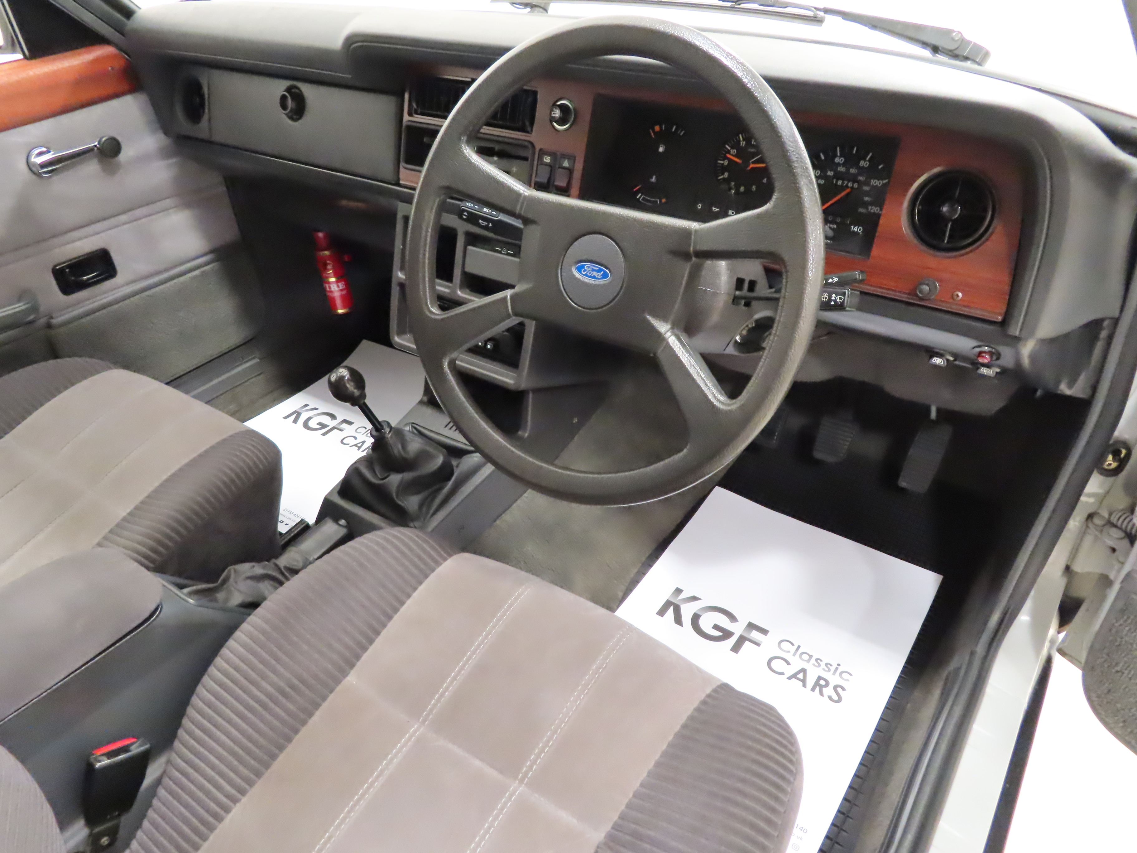 A well-appointed Ford interior, unique, refined and immensely comfortable. The two-tone fabric seats consisting of dark Durham with light Crushed Velour seat centre inserts, (Code T4), are very clean and match the colour keyed thick pile carpeting normally reserved for Ghia models. Genuine Ford rubber mats have been fitted from new. Carpeted lower sections on the doors raise to a light crushed velour topped by luxury wood veneer door cappings adding opulence to the impressive livery. Incredibly, the plastic film to the drivers door card remains, such was the protective nature of the husband and wife owners until 2022. With such low mileage covered, all switchgear and functions operate exactly as intended and the dashboard and wood effect facia are perfect. The four-spoke steering wheel displays prominent veins and the pedal rubbers are virtually unworn. The large estate boot area is remarkably clean for such heavily utilised areas with the carpeting, plastic side trim and even the headlining in excellent condition. The Ford jack and wheel brace are both present.