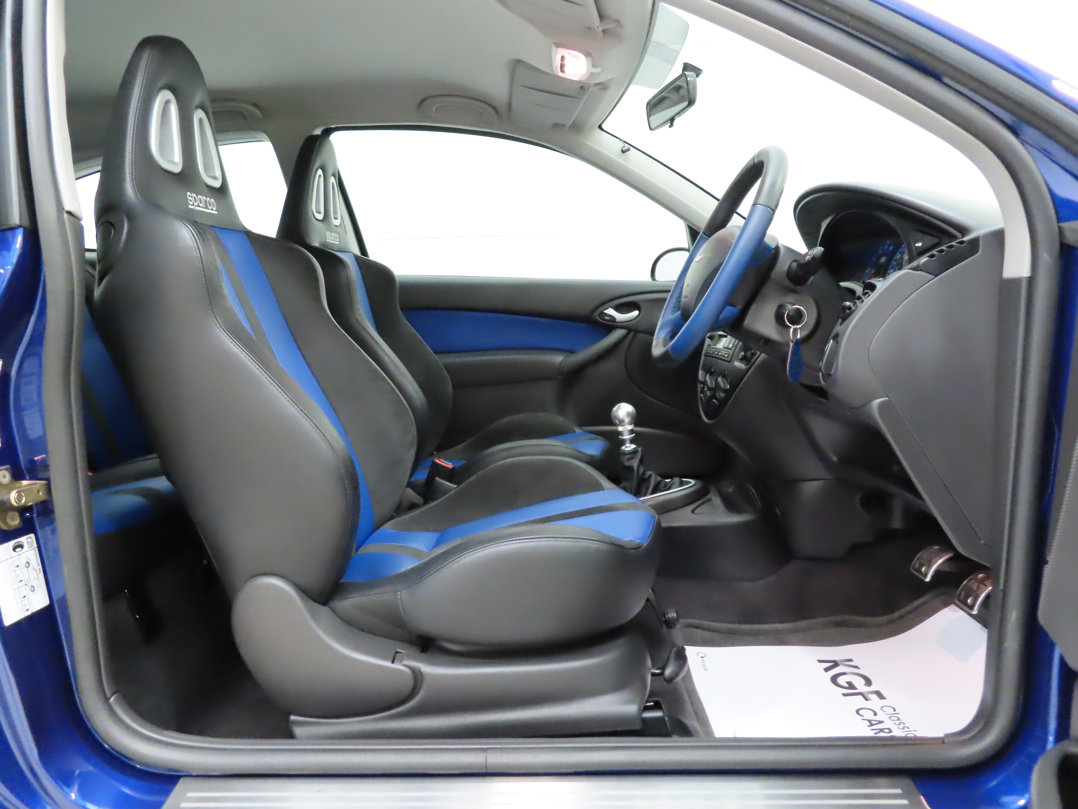 Inside this white-hot Ford are a pair of body-hugging Sparco road-race seats swathed in luxurious Racing Black and Blue Leather and Black Alcantara, (Code AR). The RS and Sparco logos are embossed and stitched into the upholstery, and this coupled with the aluminium fittings, push button start and numbered plaque, leave you with little doubt this is no ordinary Focus! The seats are perfect, even to the alcantara on the drivers side, thanks to the careful one owner from new. The steering wheel blue leather, a known weak point, is clean and there is a small mark to the drivers aluminium scuff plate. The RS carpet mats remain fitted and are in excellent condition. All controls function. Ford built this car to truly delight its motorsport loving RS devoted fan base and this is as good as they come.