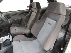 The interior of this RS Turbo defies its age with the fully adjustable Recaro seats finished in original two-tone grey Monza crushed velour, (Code HC). The seat pads and bolsters are very firm and show no sign of wear. The door cards and carpets are in remarkable condition, the latter having been protected by genuine Ford rubber waffle mats. The original perforated headlining is tight and free from marks and discolouration. The soft-feel three-spoke steering gives a clear view of the neat binnacle showing fully working warning lights and dials. The dashboard has remained completely free from cracks, an otherwise common issue with MK3 Escorts. The correct Ford SRT32P stereo and cassette storage holder with joystick control speakers remains fitted with two rear speakers to the parcel shelf. A preserved Ford RS interior guaranteed to delight spectators.