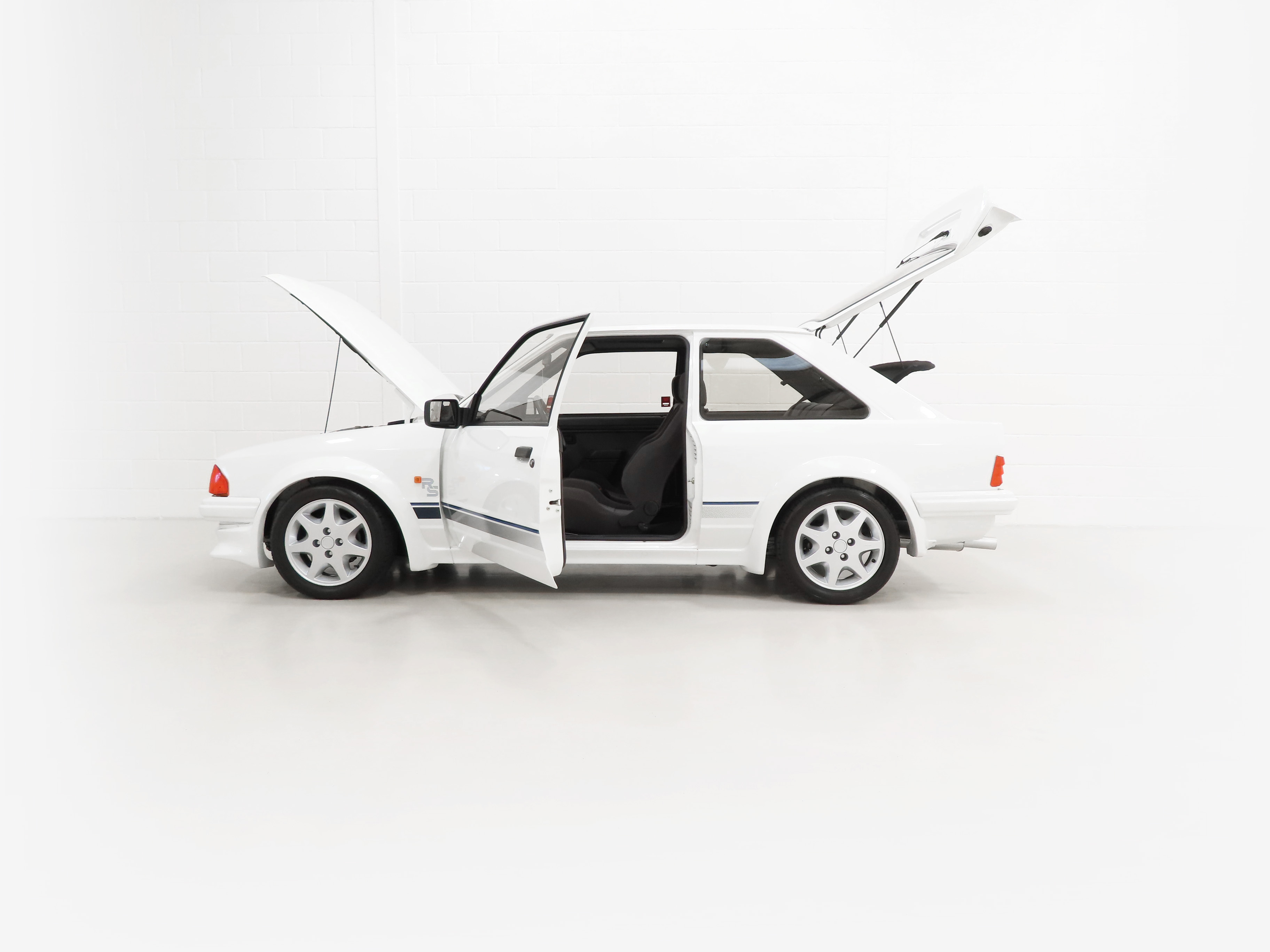 An incredible history awaits the new owner of this special RS. Built in December 1985 and registered on the 6th March 1986 by Ford main dealers, Days of Lowestoft, this example has only had five former keepers. The history files contains numerous invoices and every historic MOT. The original service book is full with entries revealing the service work and care this car has enjoyed and a diary diligently detailing all works carried out from 1989 until 2015 makes reassuring reading. It was then purchased by Steven Brannan, the Company Owner and Director of SJB Classics Ltd, a specialist Aston Martin restorer with a soft spot for Fast Fords. It was selected due to the condition and history and as his own personal car, it was restored to a concours level with no expense spared. The result today is truly spectacular. Supplied with the Escort operating guide, service book, original sales brochures and two sets of keys which work all locks, central locking and ignition, this car will absolutely appeal to a Blue Oval fanatic wanting one of the best.
