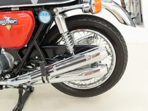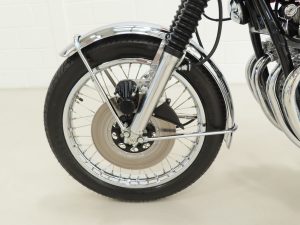 This CB-750 K3 retains chrome wire wheels in stunning condition and still displaying outer rim D.I.D Japan and part number stampings. Premium Metzeler 3.25-19 front and 4.00-18 rear tyres are fitted and unused still showing delicate tyre nobbles. A hydraulically operated single 296mm disc and 179mm rear drum braking system is as new and standard specification.