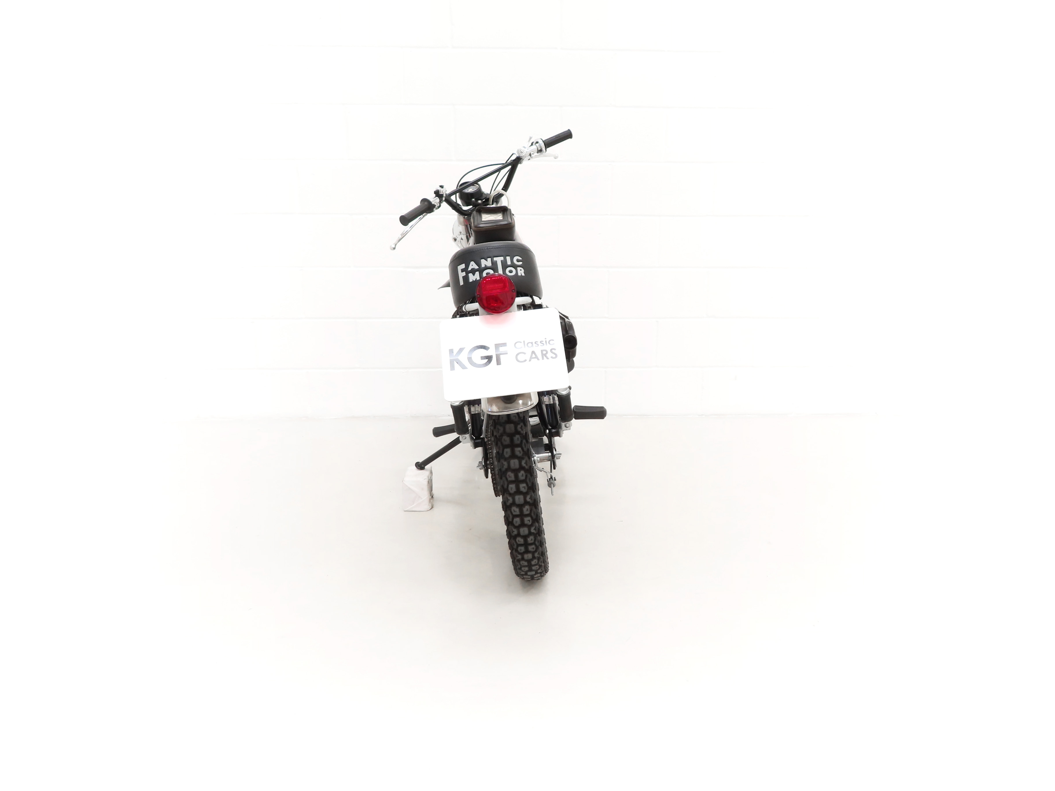 Double loop steel tube frame, 1.7 imp. Gallon fuel tank, alloy wheel hubs, dual beam headlamp with ‘lights-on’ indicator, rear lamp, stainless steel front and rear mudguards, rear foot pegs, front Fantic hydraulic and rear adjustable dampers, rubber front mudguard upper and lower extenders, Fantic flat exhaust with chrome lightweight heatshield, Domino clutch and front brake levers, CEV control switch and speedometer, handlebar mounted choke lever, electromagnetic horn, engine cut-out button, fuel valve, Fantic motor embossed seat, tank pack with running-in/maintenance instructions.