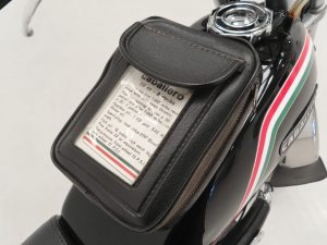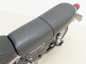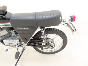 The Fantic motor Minarelli two-stroke 49cc air cooled engine is quoted to produce 6.8 bhp @8000rpm and capable of speeds up to 55mph! The engine casings and components are beautifully detailed and the Fantic’s prancing pony design, cheekily echoing Ferrari’s famous logo is clear and proud and the original Dell’Orto carburettor remains fitted as does the engine number plate. The genuine Silenziatori Lafranconi exhaust with Fantic stampings shows some light pitting and the chrome guard is perfect. This unrestricted bike is fully operational and rides well with the preferred 6-speed foot change transmission allowing much better top-end cruising.