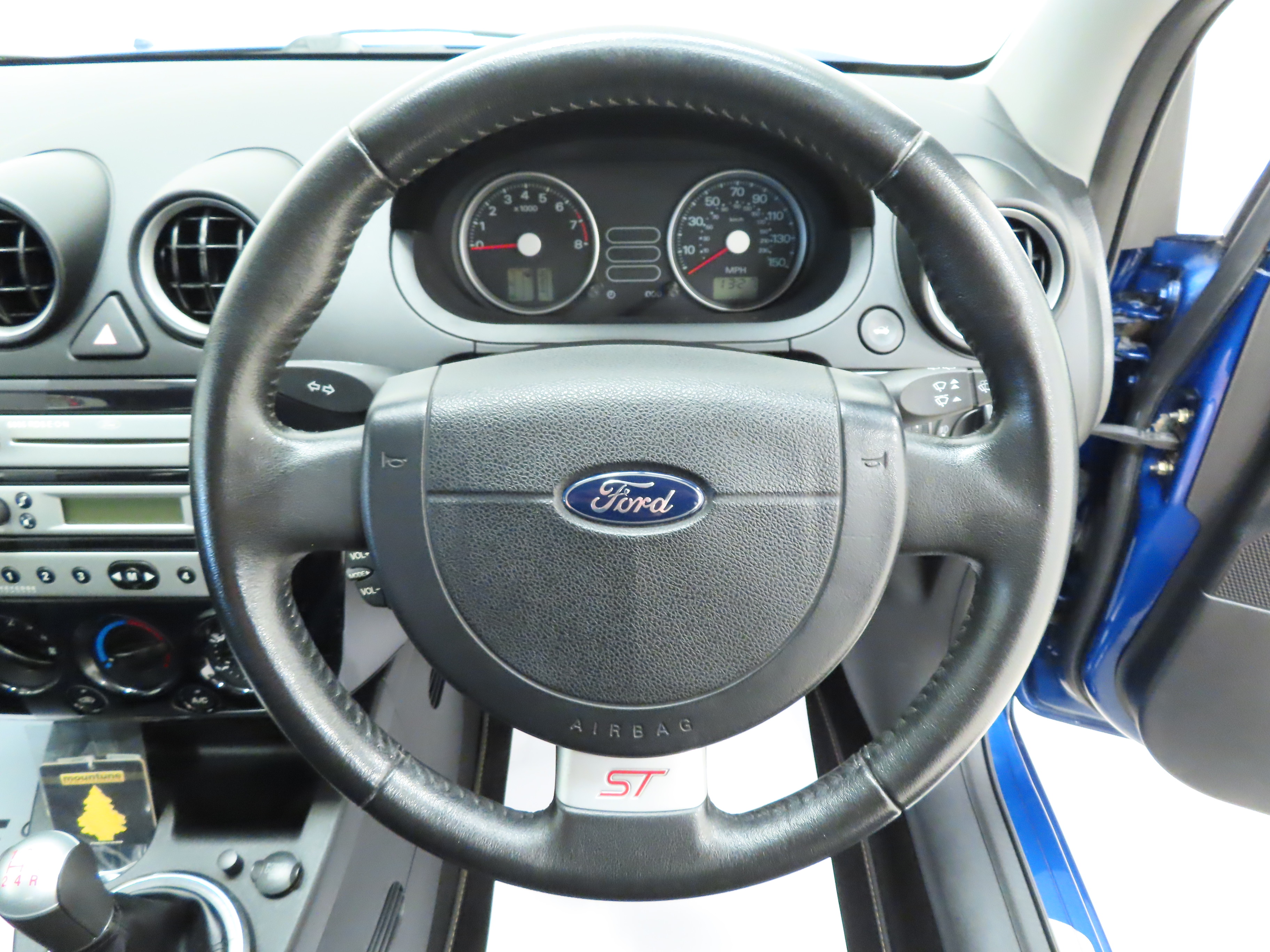 Computer optimised unitary welded steel body, rigid occupant safety cell, ‘Aero’ kit, sports boot spoiler, driver and front passenger airbags, Quickclear heated windscreen, remote locking, electric windows, electric heated mirrors, air conditioning, ST design 17in alloy wheels, ST scuff plates and metal pedals, stereo radio/CD model 6006, Thatcham CAT 1 alarm, Passive Anti-Theft System immobiliser (PATS). Mountune MR200 Equipment: High-flow exhaust manifold, Sports catalyst and rear exhaust section with laser-etched tailpipe, Cold Air Induction System, Mountune camshafts, valve springs and retainers, Bespoke cast inlet plenum, 60mm throttlebody, Thermal inlet gasket, Performance engine calibration programmed into the production engine control module, Mountune Performance and Racing badge, Mountune gearbox roll restrictor mount, Mountune PAS fluid front mount cooler kit, Mountune carbon C.A.I.S airbox cover, Mountune HT lead kit & Billet oil cap, Mountune LUX carpet and boot mats. Accessories: Ford approved Eibach suspension springs, red brake calipers, 4X JL Audio enclosed door speakers, JL Audio W3 subwoofer with quick release Slot-Ported Basswedge enclosure, JL Audio amplifier, Piano Back ST150 interior, phone holder.