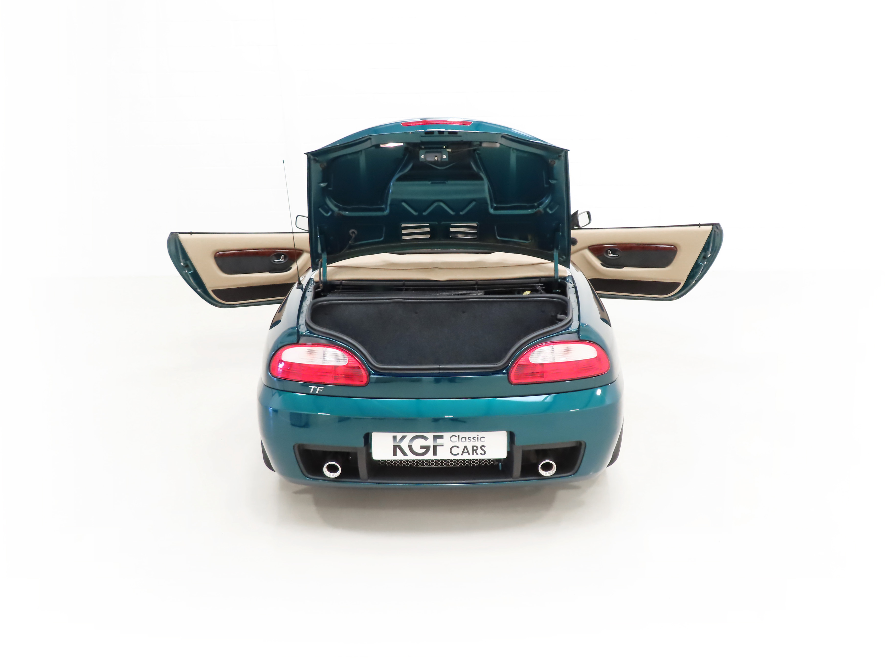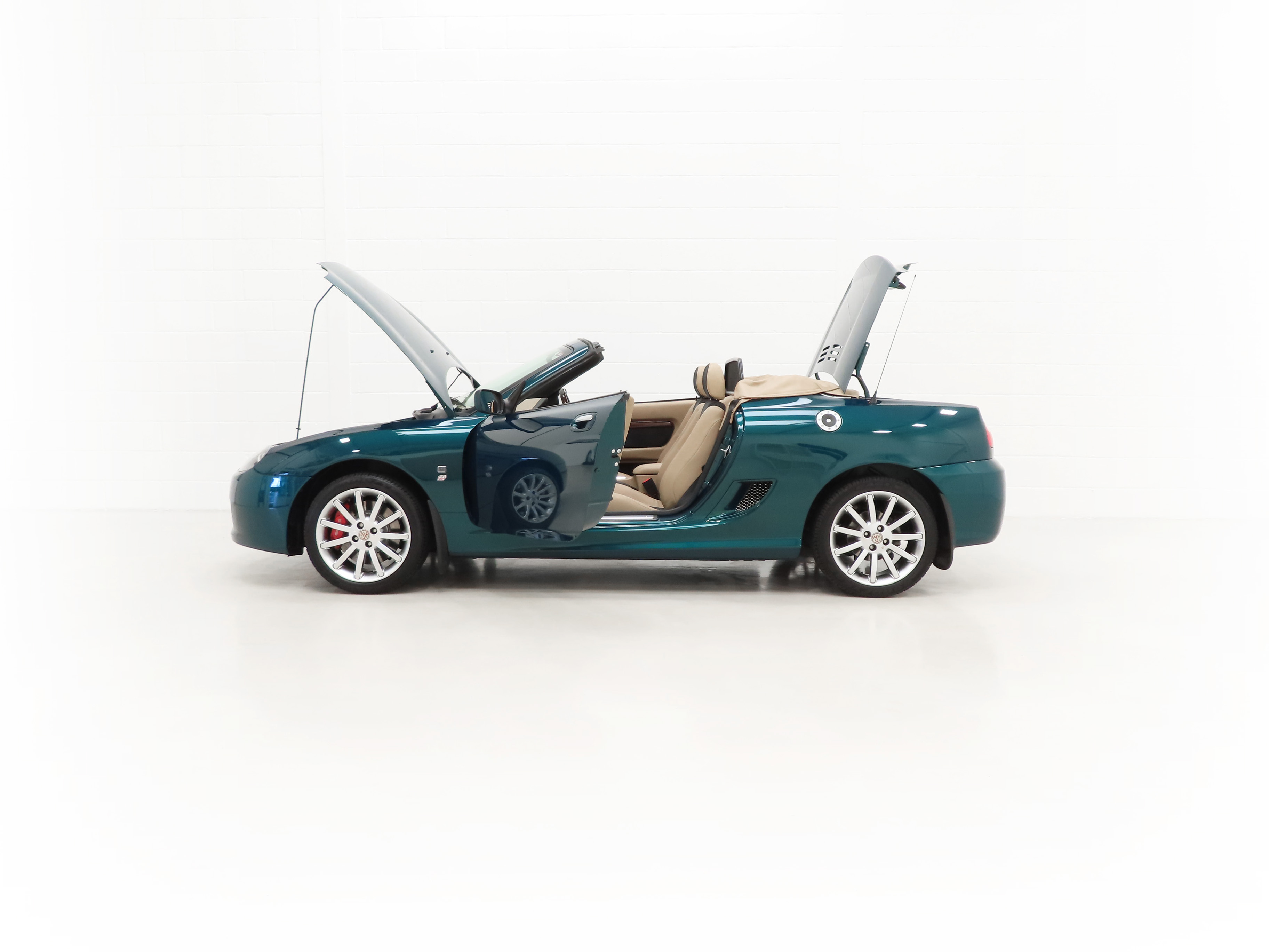Reinforced body structure, door side intrusion beams, tinted glass, bright sill finishers, fuel tank cage, high tensile tubes in A pillars, impact absorbing front and rear structures, remote central superlocking, Thatcham Category 2 immobiliser, perimetric and volumetric alarm system, heated electric door mirrors, drivers airbag. MG TF Limited Edition – Goodwood Green Equipment: 16” 11-spoke Shadow Chrome finish alloy wheels, front fog lamps, anti-lock brakes, uprated front discs and callipers, Tan Hood and hood tonneau, 1924-2004 exterior badge, Tan interior, Black Alcantara & Tan leather seat with 1924-2004 logo, wood and leather steering wheel, wood gearknob and handbrake grip, wood effect inserts on console and doors, bright pack, windstop, CD tuner, individual serial number badge. Factory Options: Temporary spare wheel (16” alloy). Dealer Accessories: Mud flaps, Supagard paint protection, carpet mats.