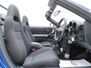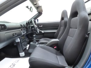 The radical design of this MR2 Roadster looks striking at any angle – from its bold front design incorporating crystal clear projector type headlights through to the bright stainless steel exhaust finish to the rear. Finished in rich metallic Lagoon Blue, (Code 8M6), it gleams thanks to the ultra-low 2,096 miles covered. All chrome badges and glass are unmarked and supplying dealer, Roundswell Toyota, number plates remain fitted along with their branded tax disc holder still with the first tax disc in the screen! All factory chassis stickers to panels remain attached and the front window has a tiny area of delamination to the drivers side. The underside, wheel-arch apertures and door shuts are as clean as the topside and the black soft-top roof with glass rear window is as new. Sitting low and wide, the untold excitement comes not only in the thrilling drive but also in the immaculate low mileage condition.