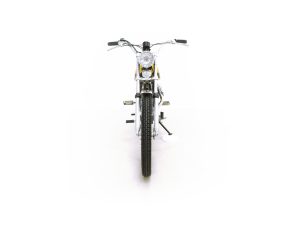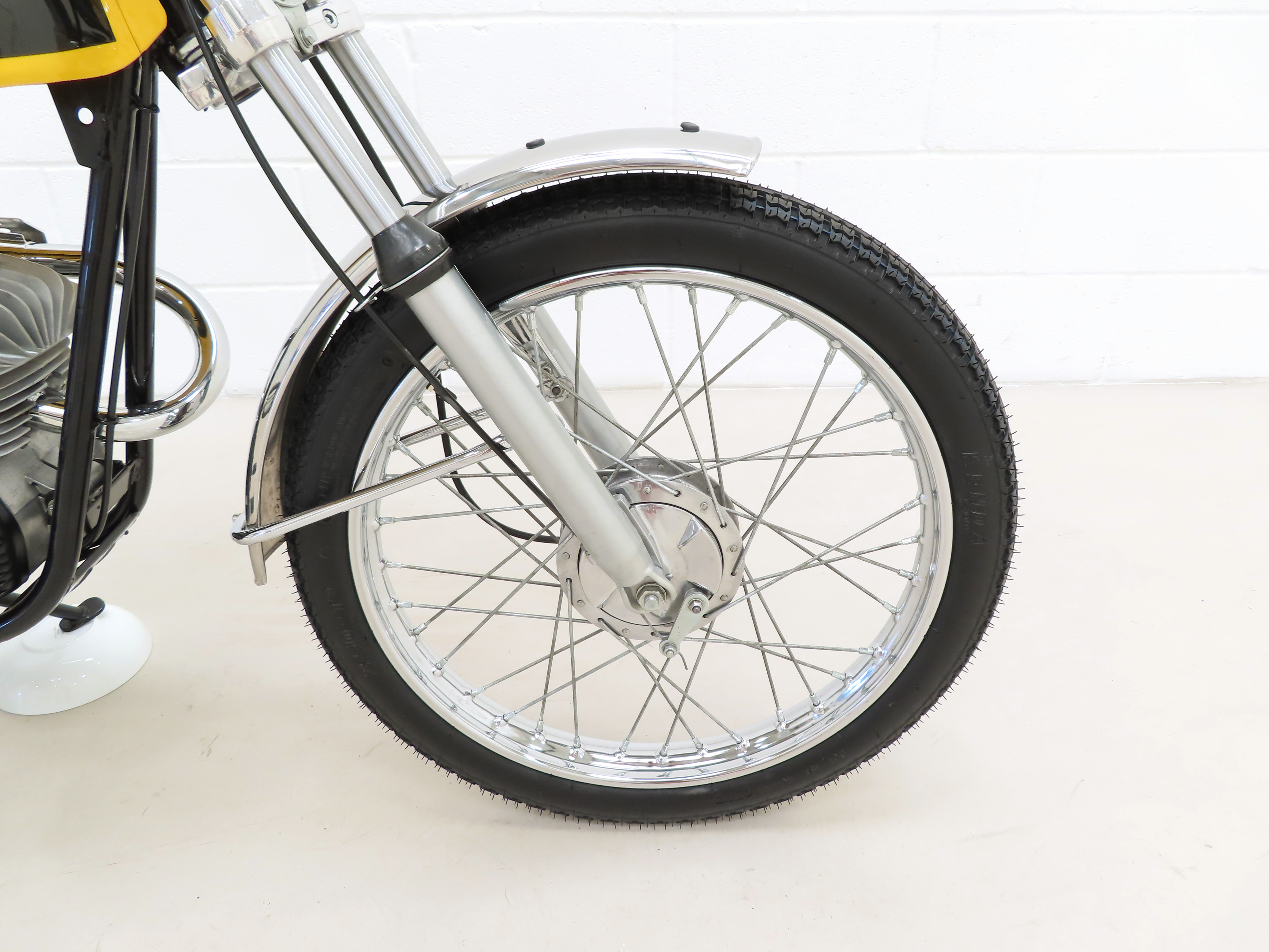 Factory spoked wheels display a mirror chrome finish as do the wheel hubs. 2.50-19 front and 2.75 -17 rear knobbly tyres are fitted. Drum brakes front and rear require a firm squeeze and stamp to provide adequate braking!