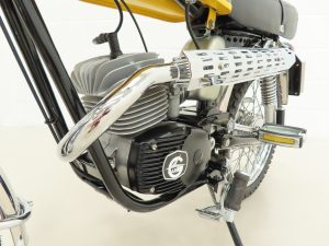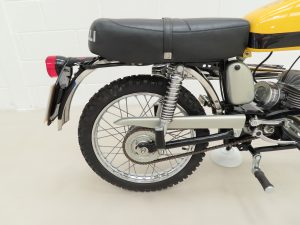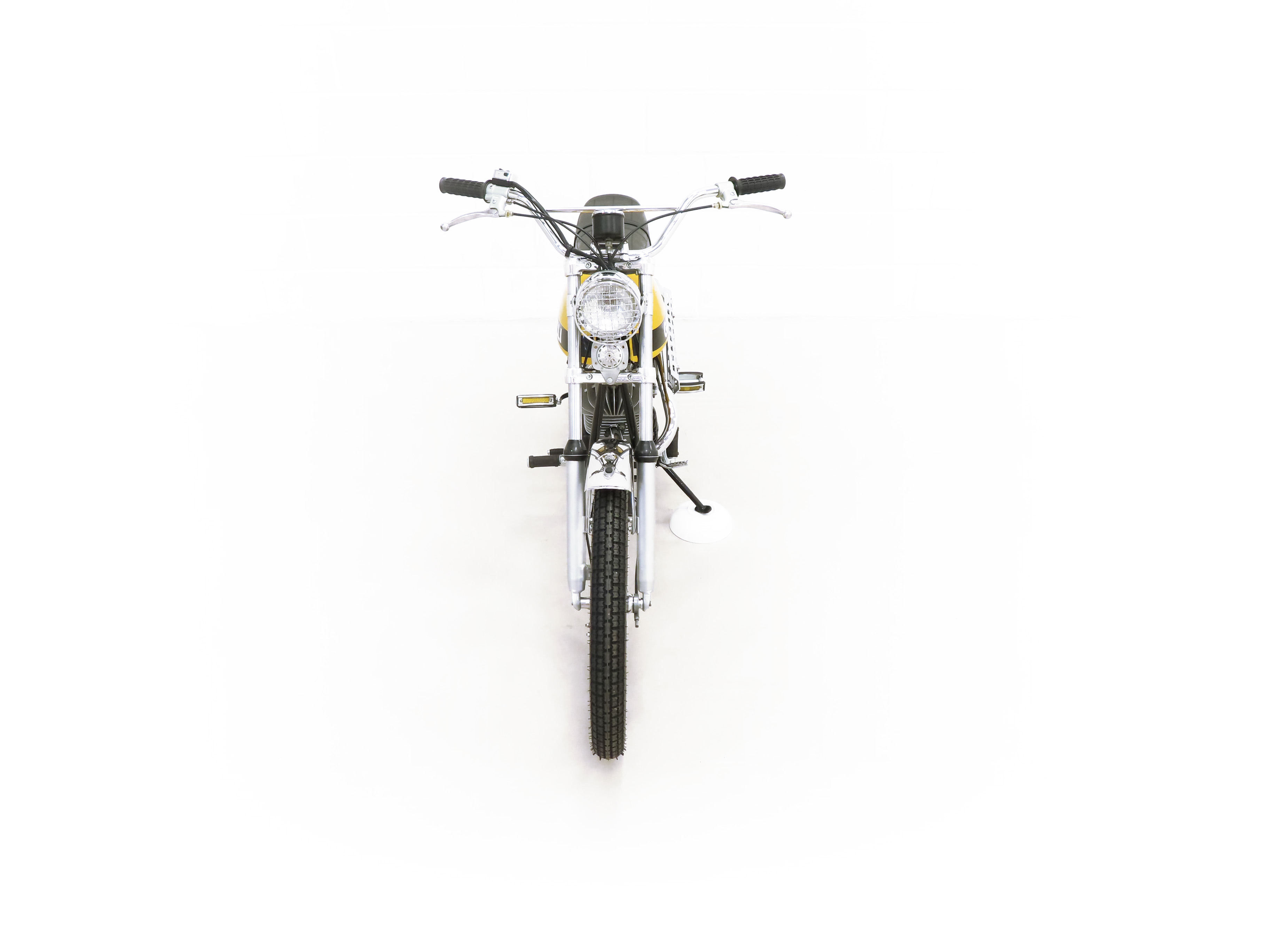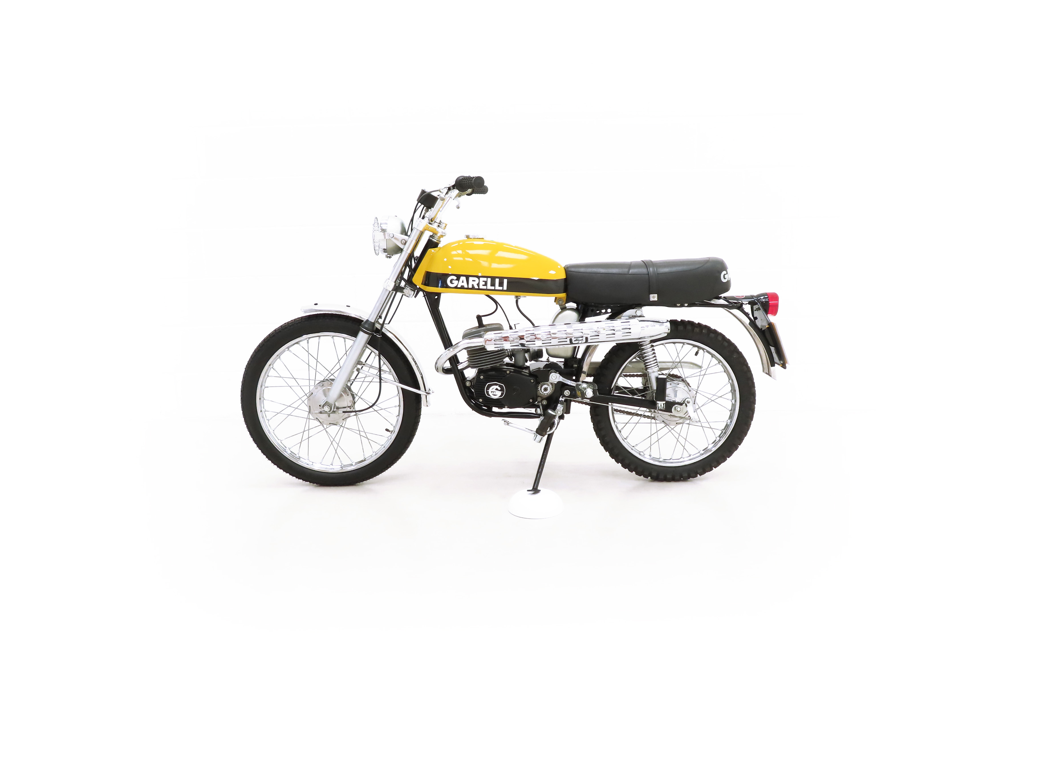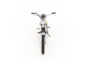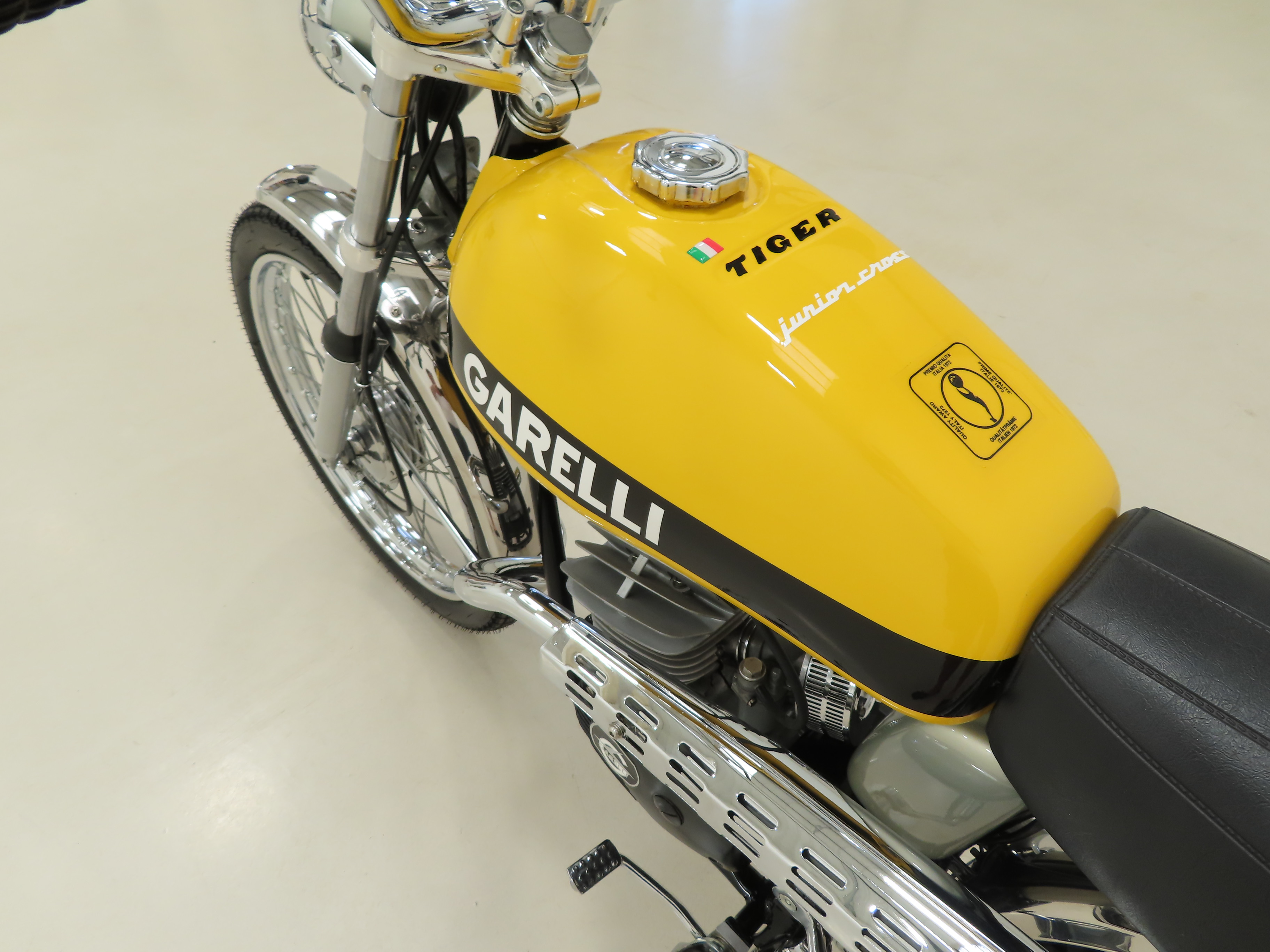 Finished to a wonderful standard, the light and sturdy double cradle tubular steel frame has been powder coated and the distinctive yellow and black Garelli fuel tank is unmarked displaying correct thinner Garelli decals as well the Tiger and Quality Award Italy 1972 stickers. Bright chrome work and stainless steel make this iconic sports moped a real show piece. Restored with careful attention to detail including correct colour to the headlamp bowl, chain guard and toolkit cubby. A real ‘sixteener special’.