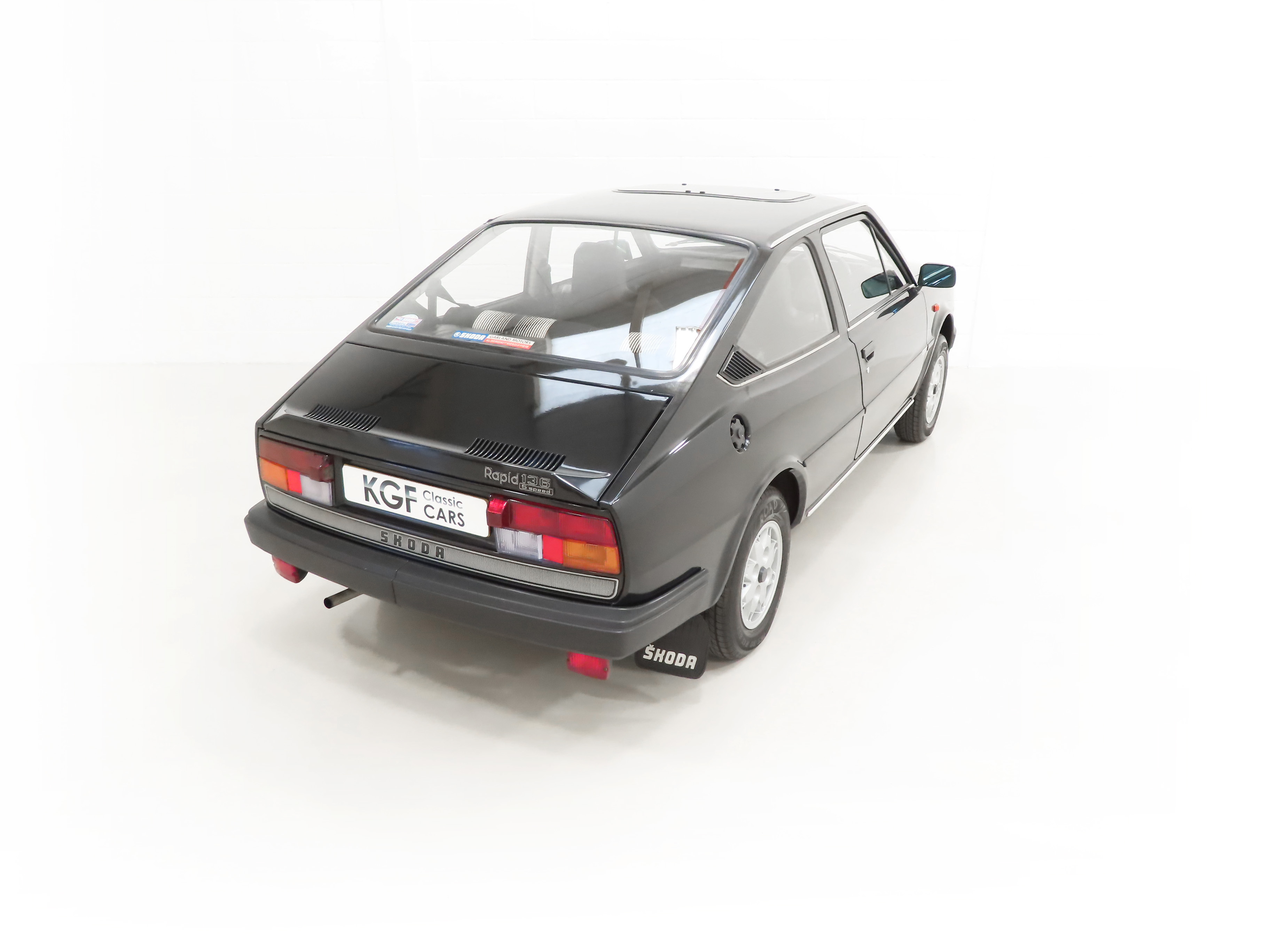 What handles like a Porsche, costs only £4,200 and is more fun than a Golf GTi? According to the Autocar & Motor magazine issue released on the 28th September 1988 the answer is the range topping sporty fastback Skoda 136 Rapid! This rare surviving example has been a regular sight in the classic Skoda fraternity and rightly so with just 36,896 miles and remarkable original condition. Specified in desirable factory cost optional Brilliant Schwarz Black, (Code 1999), the paintwork has a few inconsequential markings and aging . All panels are original fitment, exactly as is left the small Kvasiny Factory in 1990. The underside is very clean and close inspection will assure superb structural integrity thanks in part to Waxoyl professional wax applied by Rust Master. The two-piece bumpers, etched Thorax glass, lights and trim sections are all fully intact and free from damage. The original supplying dealer number plates, rear screen sticker and Lombard RAC Rally sticker remain fitted as it left the dealer new. A rare surviving example preserved, unspoilt and low mileage. Does it get much better?!