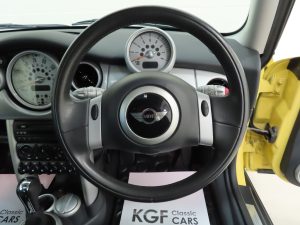 At the time of launch, the all new R50 Mini was available as the Mini One or the Mini Cooper which took its name from the iconic original Mini variant. This Mini Cooper has the more powerful 113bhp version of the 1598cc petrol engine. The front end lifts entirely including the headlights to reveal a clean engine bay still with factory labels, protective wax and strut top stampings clearly visible. The factory optional automatic transmission with switchable manual control operates perfectly and is great fun!