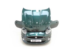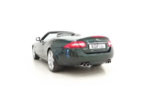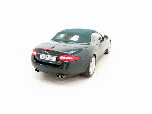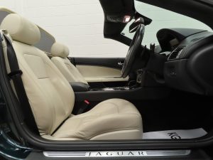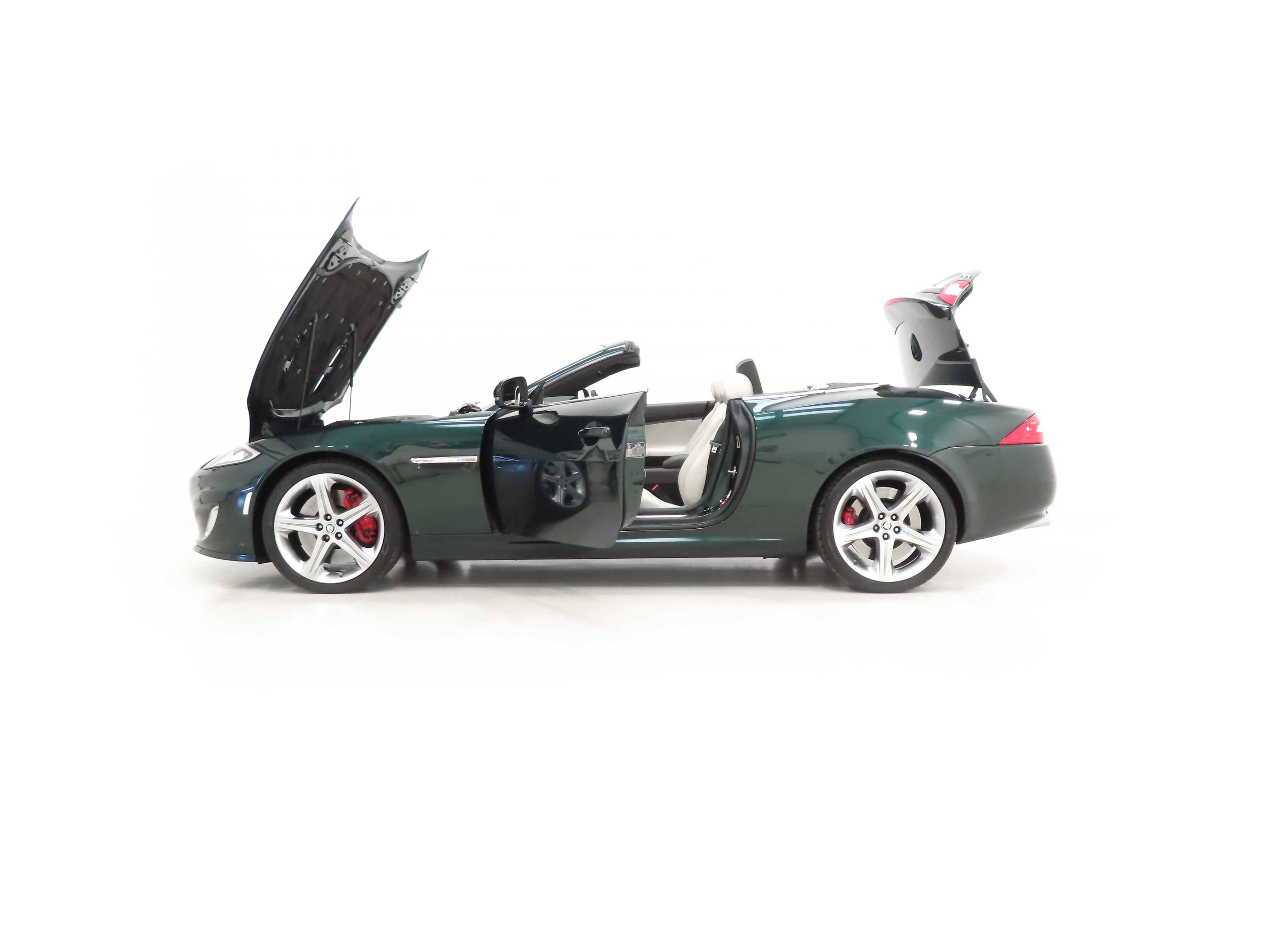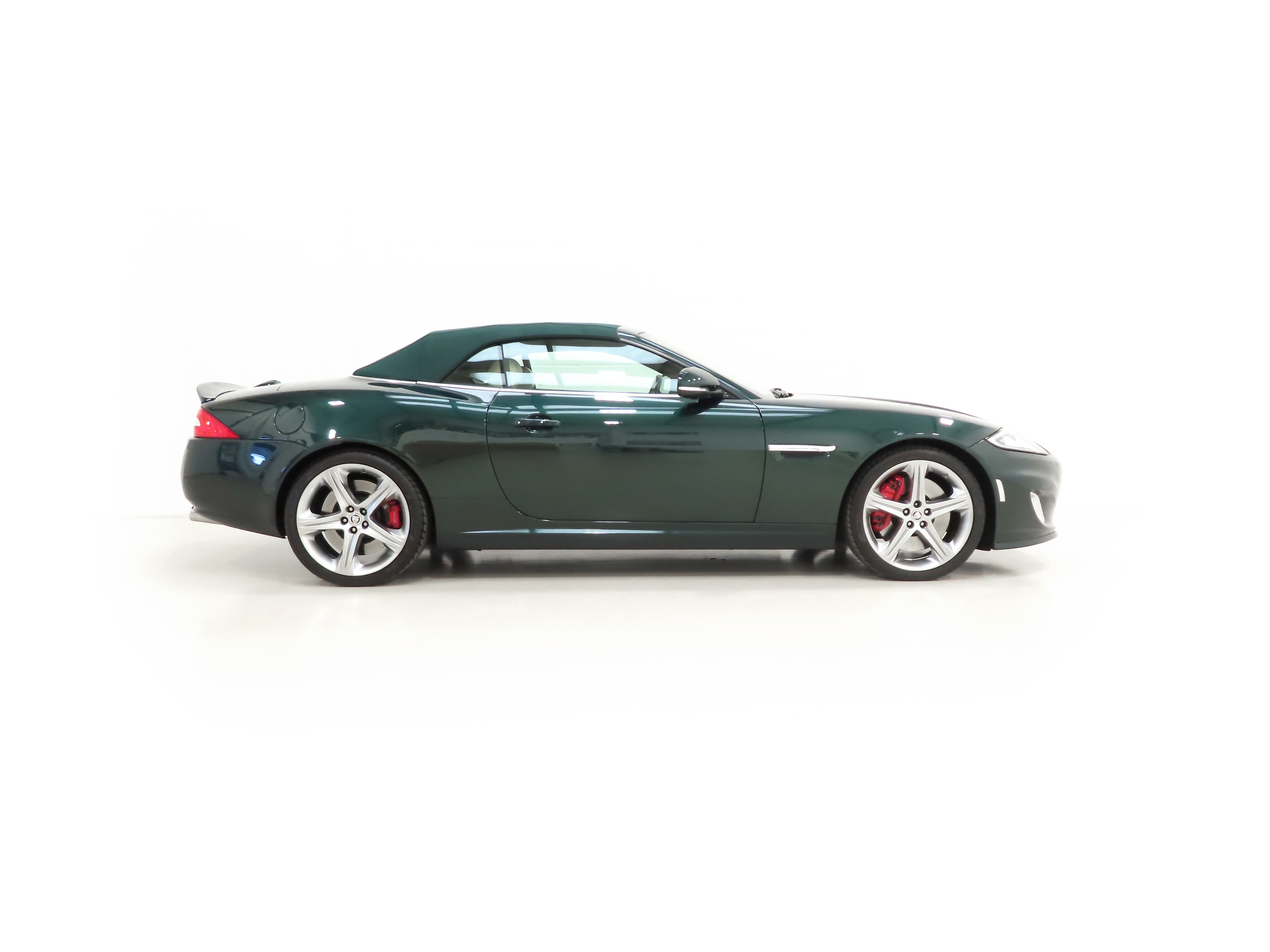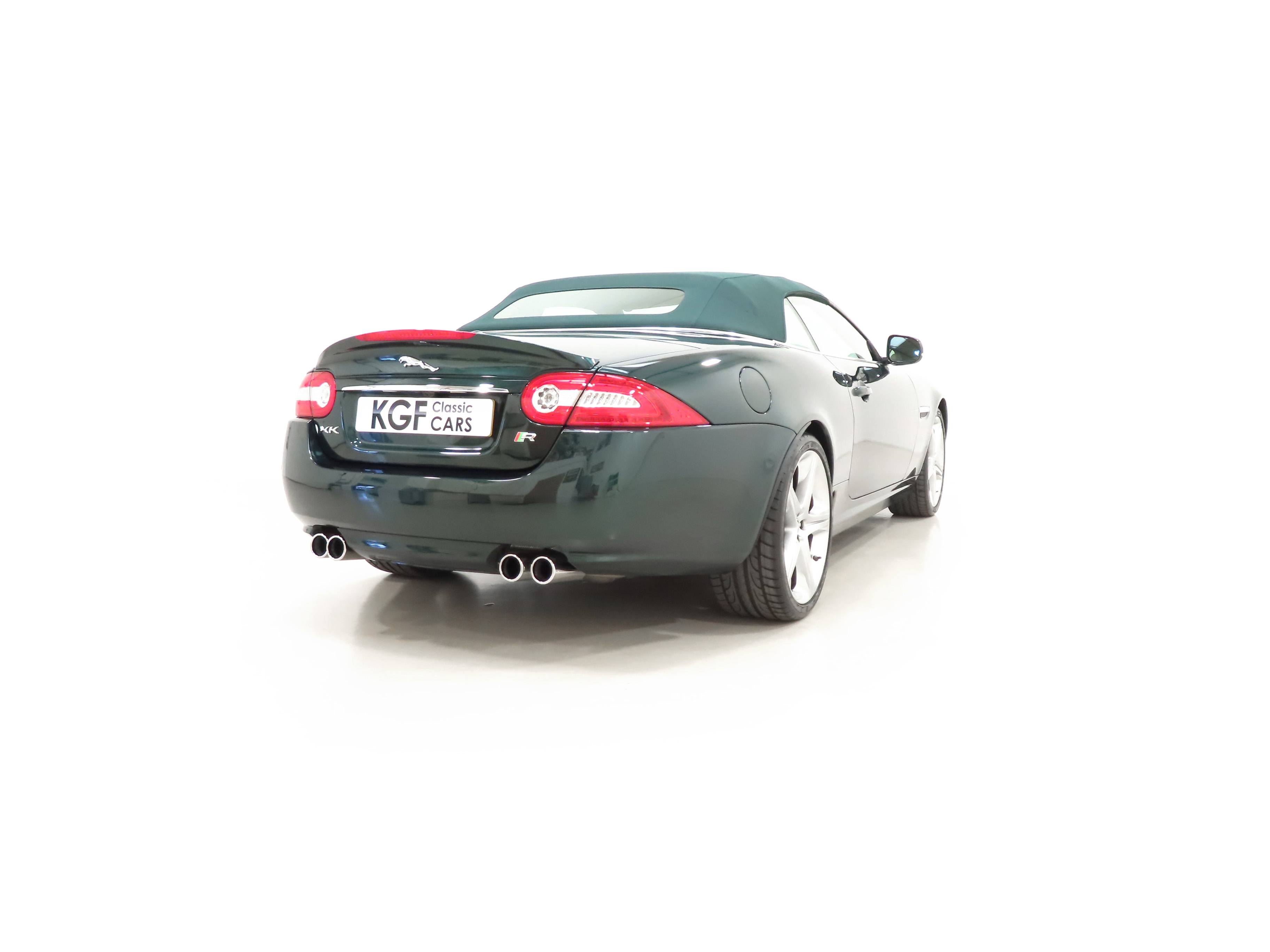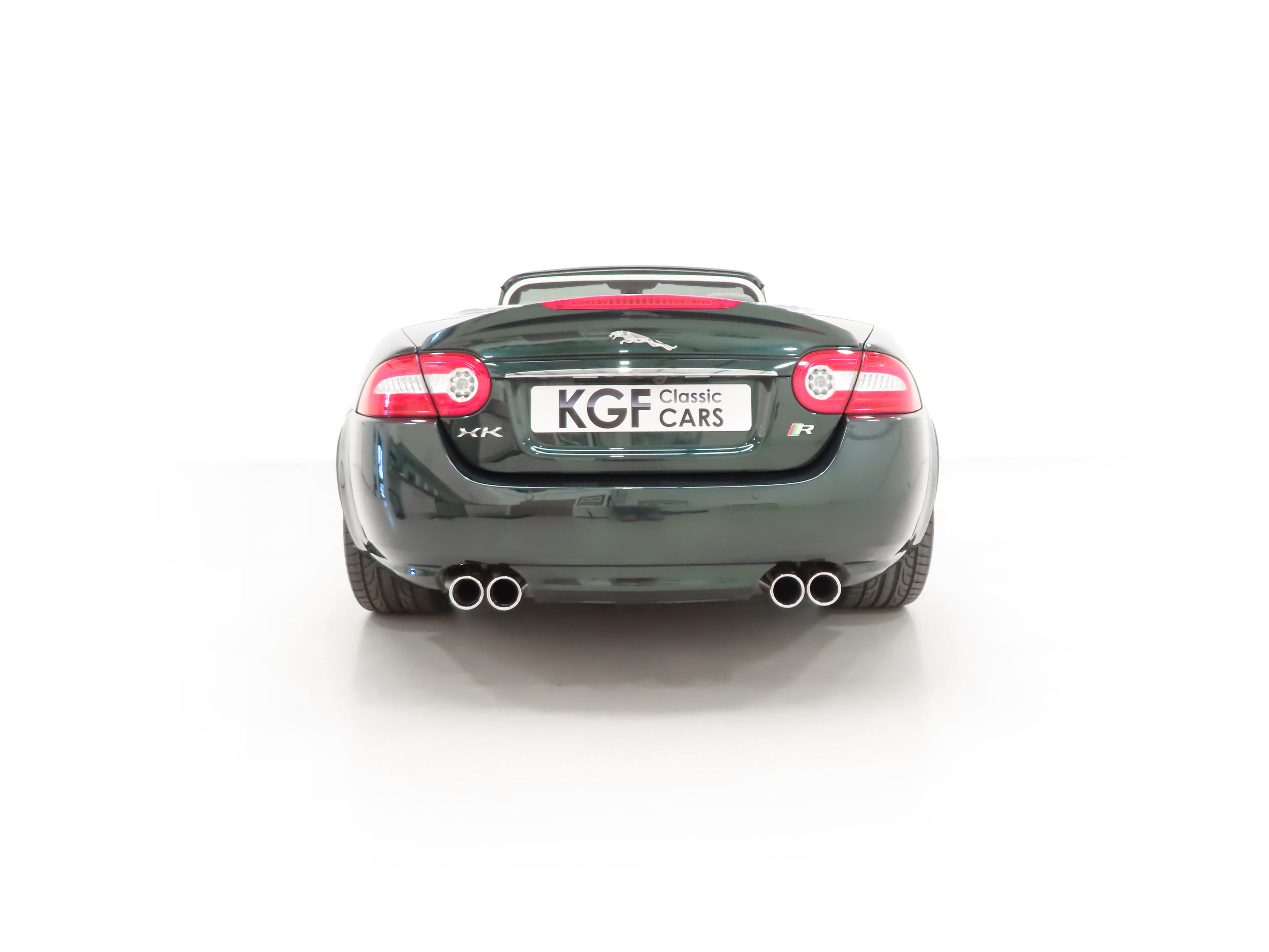 Aluminium monocoque bodyshell, XKR Aerodynamic Pack incorporating front splitter and large rear spoiler, electrically operated convertible hood with integrated tonneau, bonnet louvres with Supercharged script, Bi-Xenon with LED daytime running lights, LED tail lamps, auto lights and wipers, front and rear parking sensors, JaguarDrive Control with Winter and Dynamic Mode, cruise control with speed limiter, electric memory seats and steering column, heated and cooled front seats, heated leather steering wheel, dual zone climate control, Phosphor blue halo illumination and mood lighting, keyless start, message centre, 7 inch colour touch screen display with navigation, Bluetooth, Bowers & Wilkins 525W surround sound system, 6 disc in-facia CD. Factory Options: Xirallic Special paintwork, Premium Dark Green convertible hood, 20” Takoba alloy wheels, Performance Active Exhaust with quad tailpipes, Reverse park Camera with Guidance, DAB radio receiver. Dealer Options: Supaguard paintwork and upholstery preservation treatment, colour coded wind deflector, Road Hero Spare Wheel Kit.