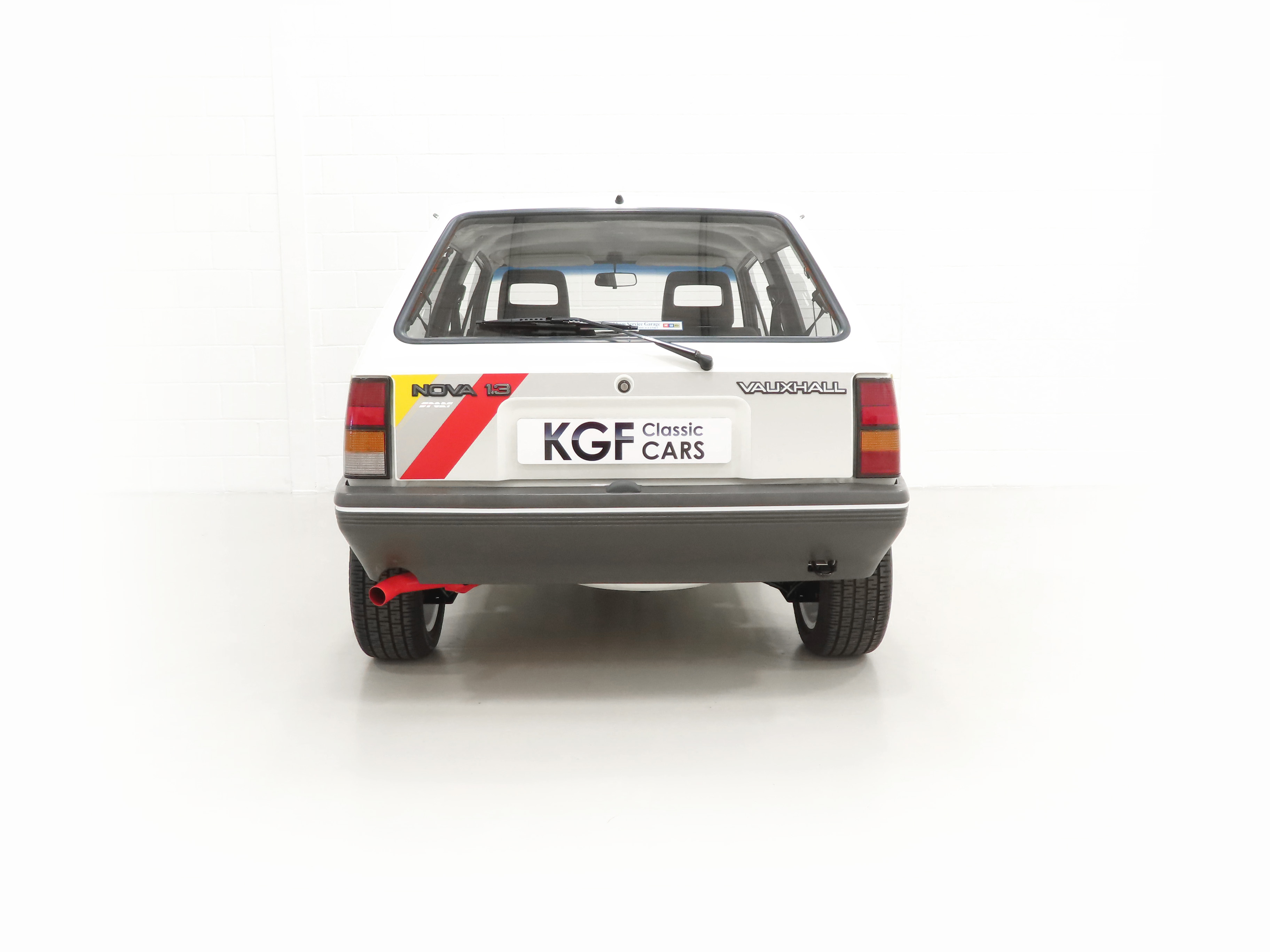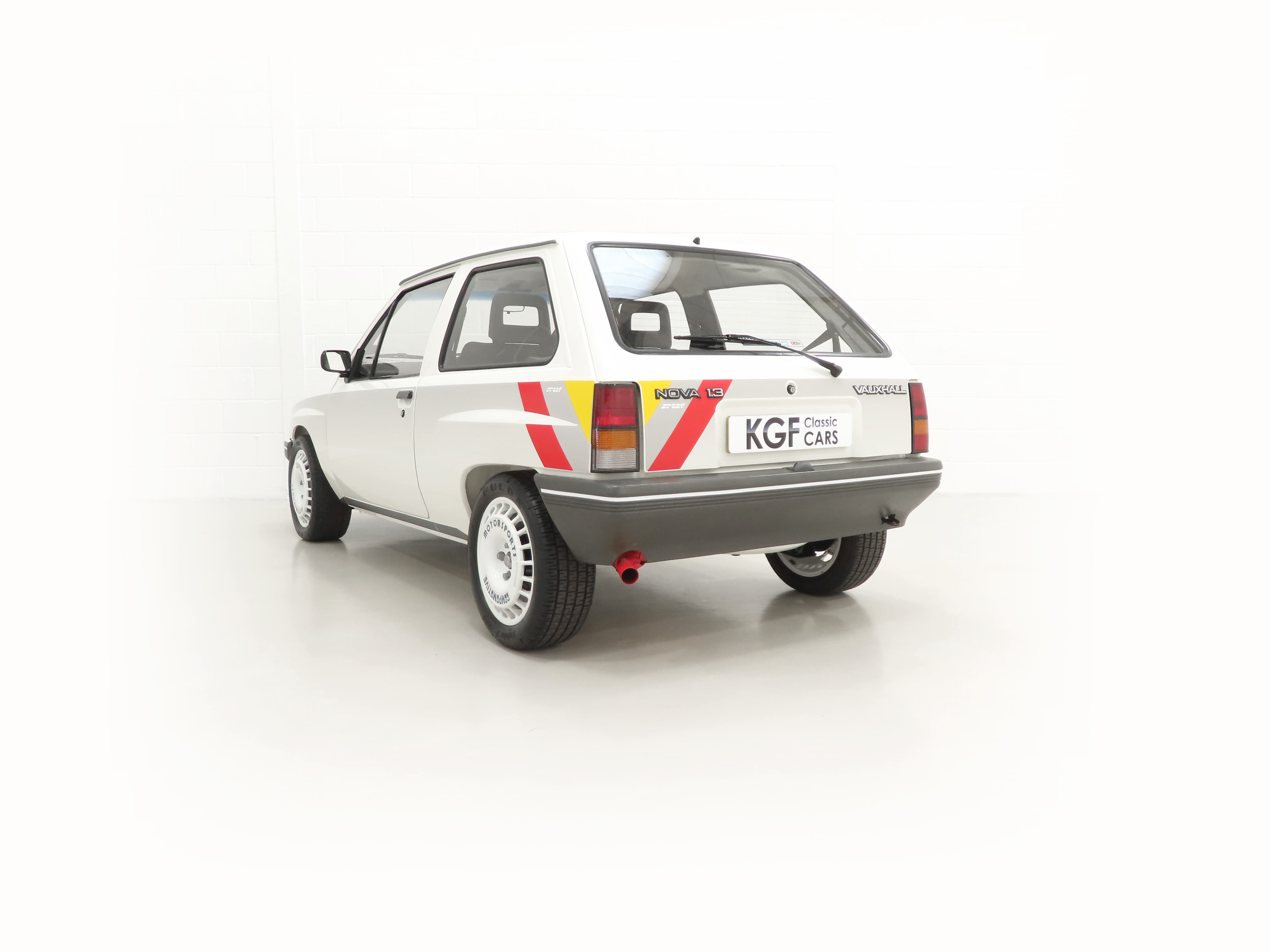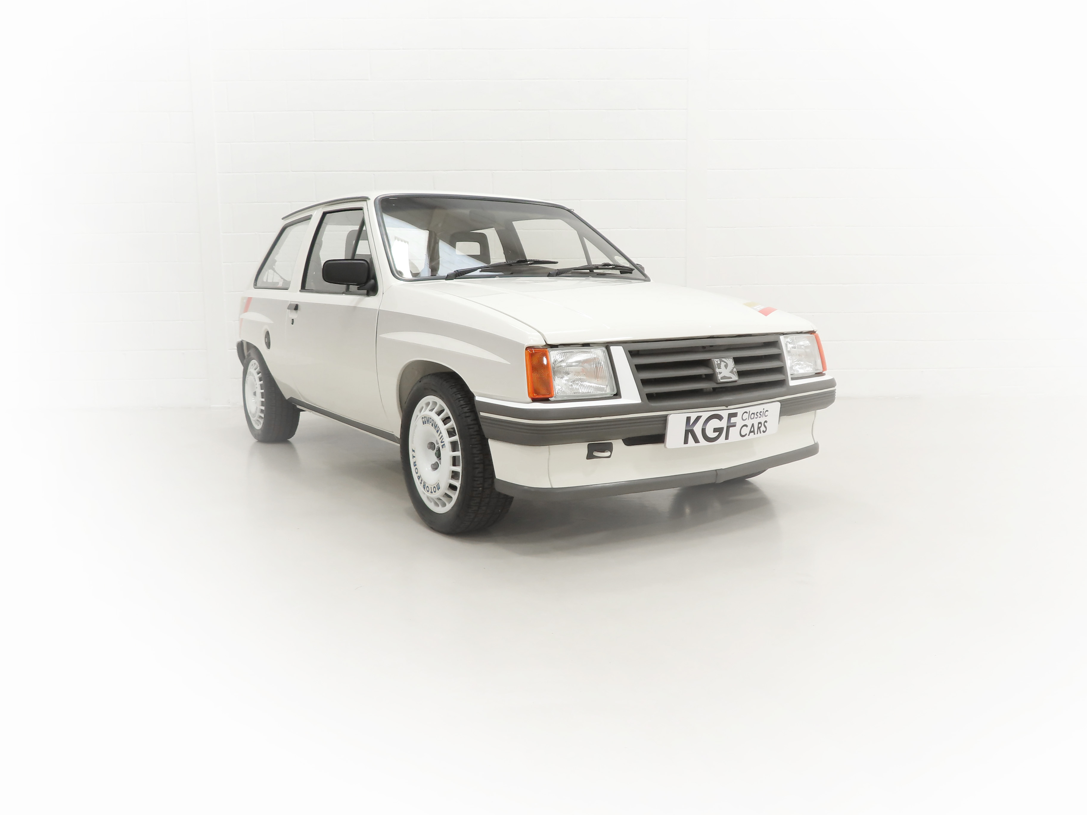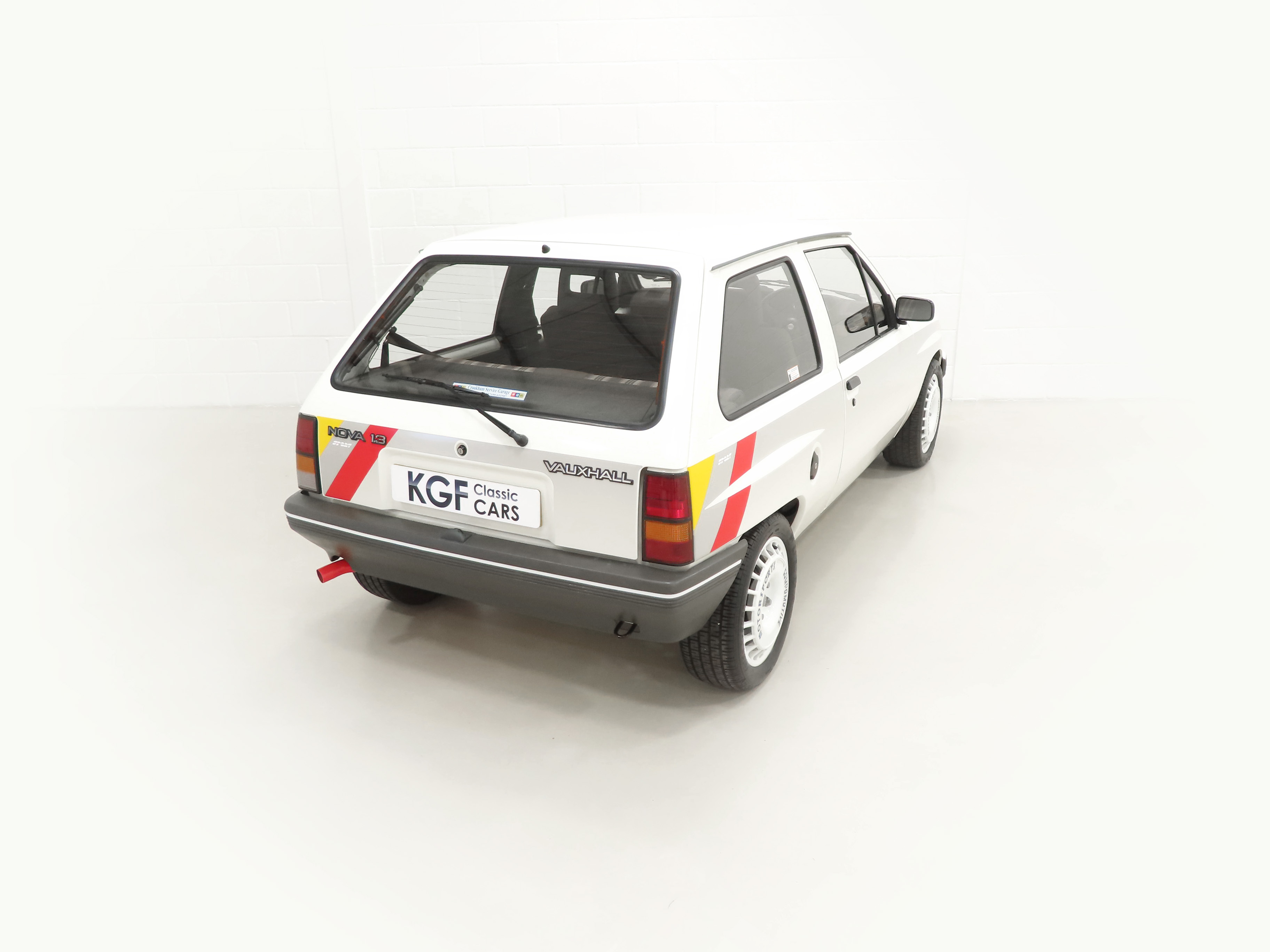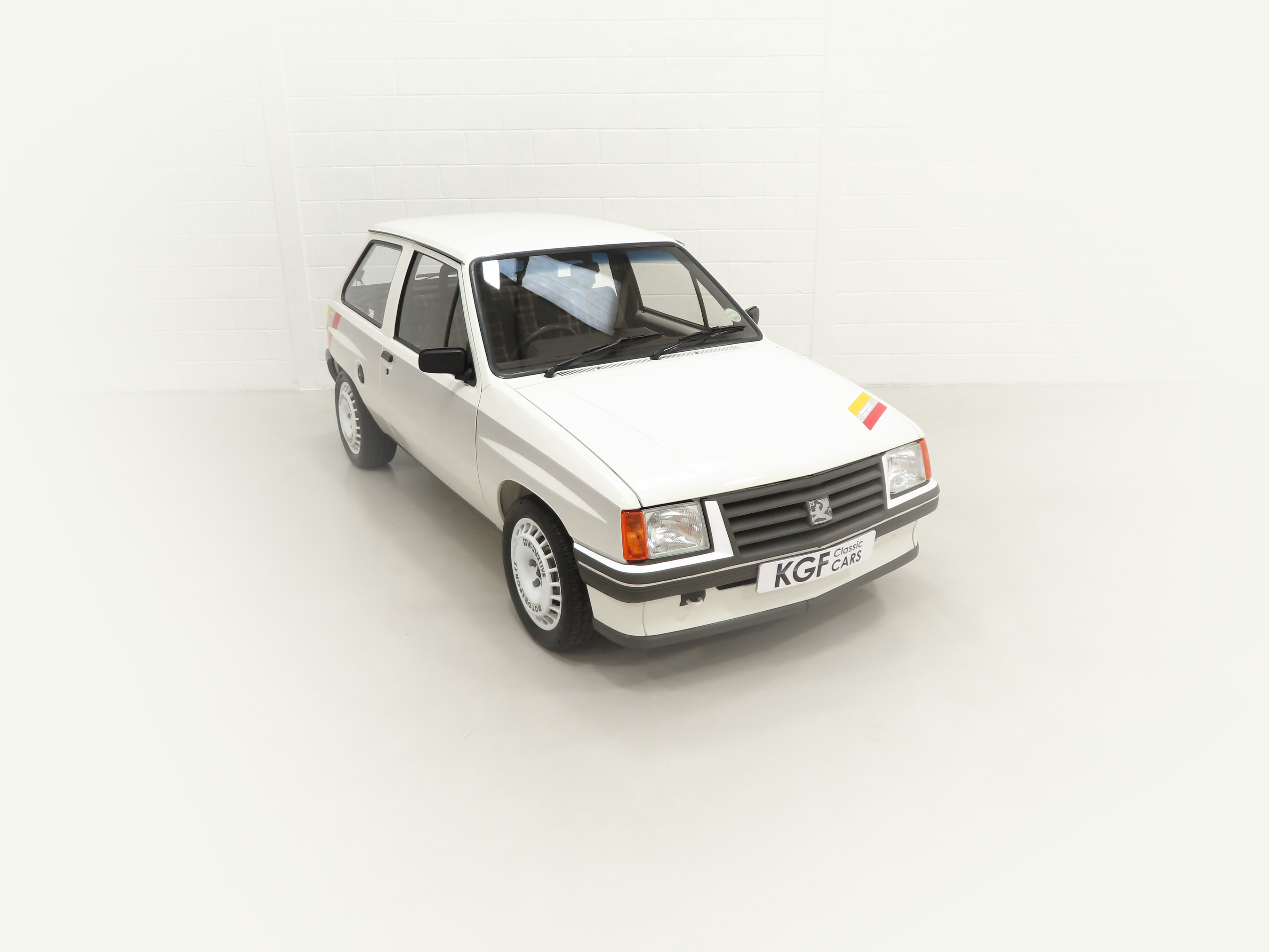 A rather special Nova quickly distinguished from the exclusive, striking, carefully co-ordinated ‘Sports’ livery and standard red performance Ashley exhaust silencer. All 500 homologation specials were finished in Polar White, (Code E452), and this authenticated example is exemplary in all exterior attributes. From the unmarked glossy rich paint, correct trim and detailed underside, this is not just a show winner on Group A rally stages! The early round lock rear tailgate, correct bumpers, gutter trim and even unobtainable sill decals are fitted, all documented in a photographic laminated restoration album. Supplying dealer number plates, rear screen sticker and even tax disc holder are fitted. This stonking example is fit for the finest of iconic car collections.