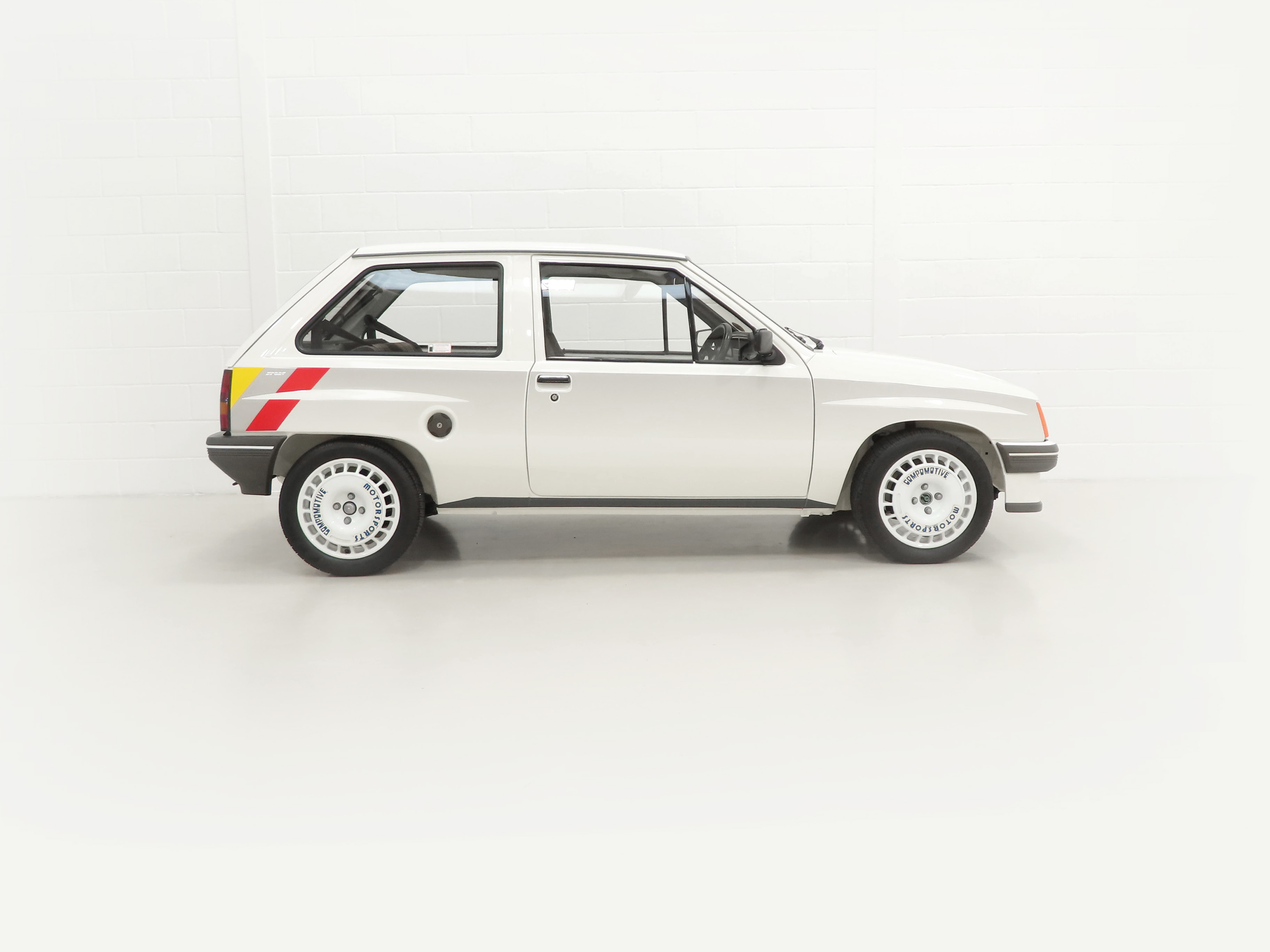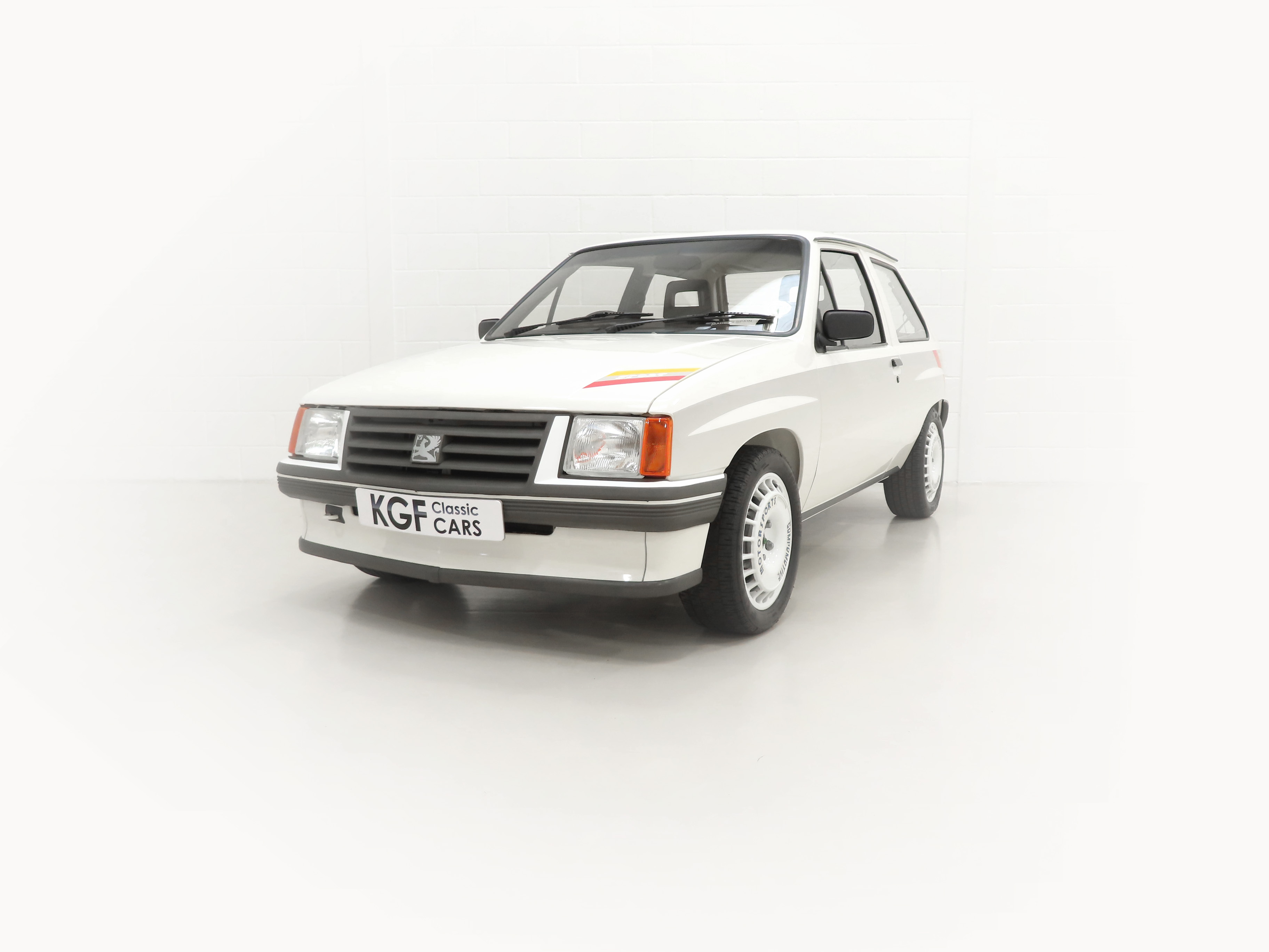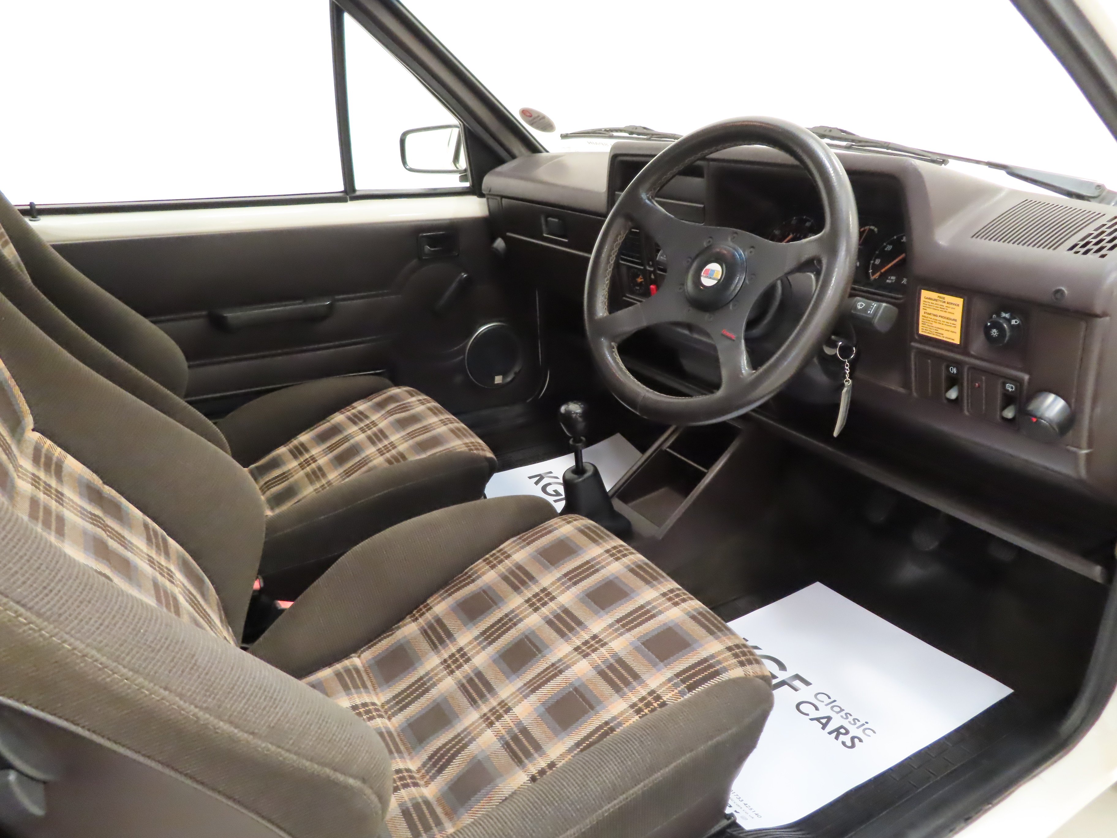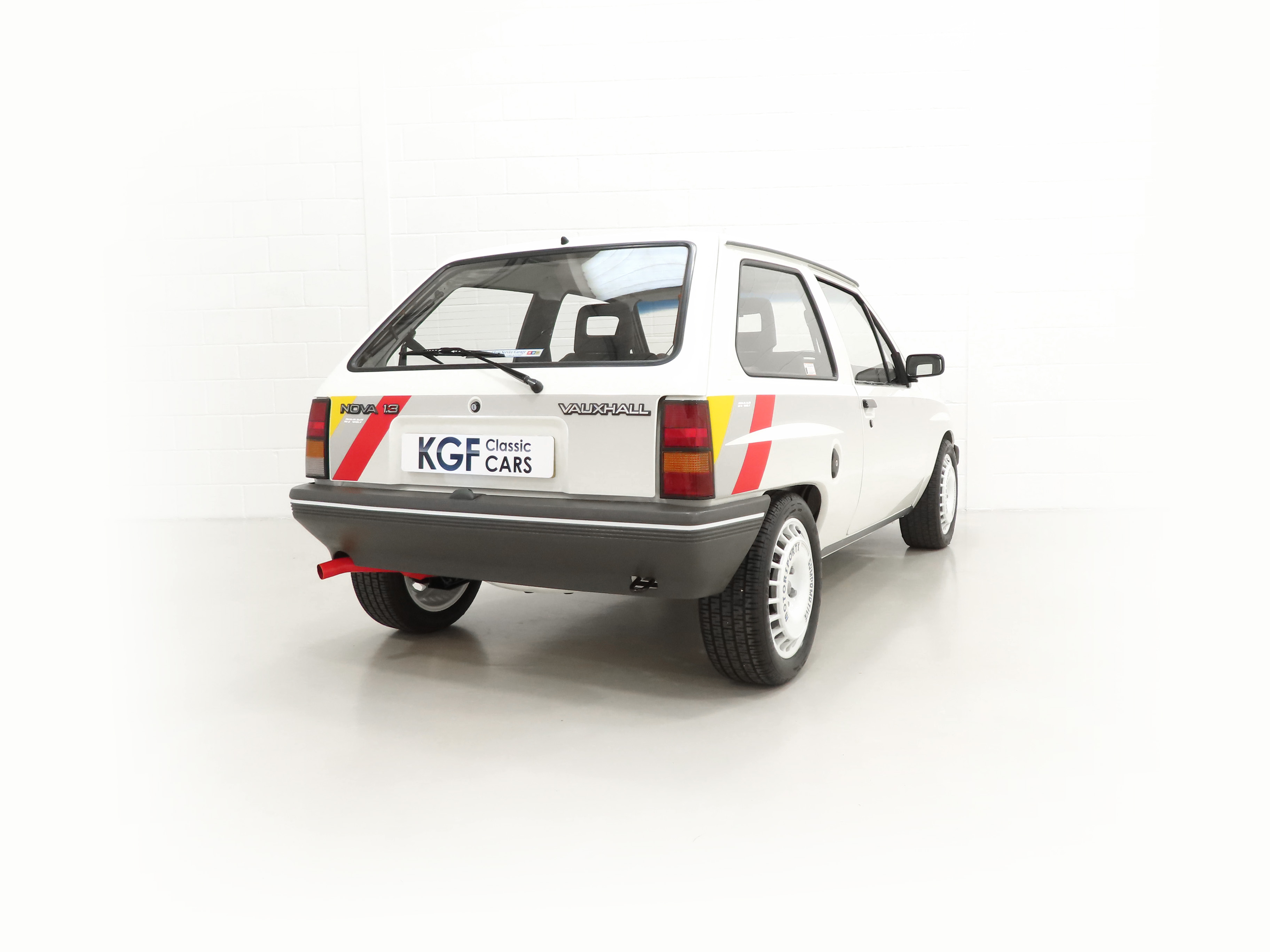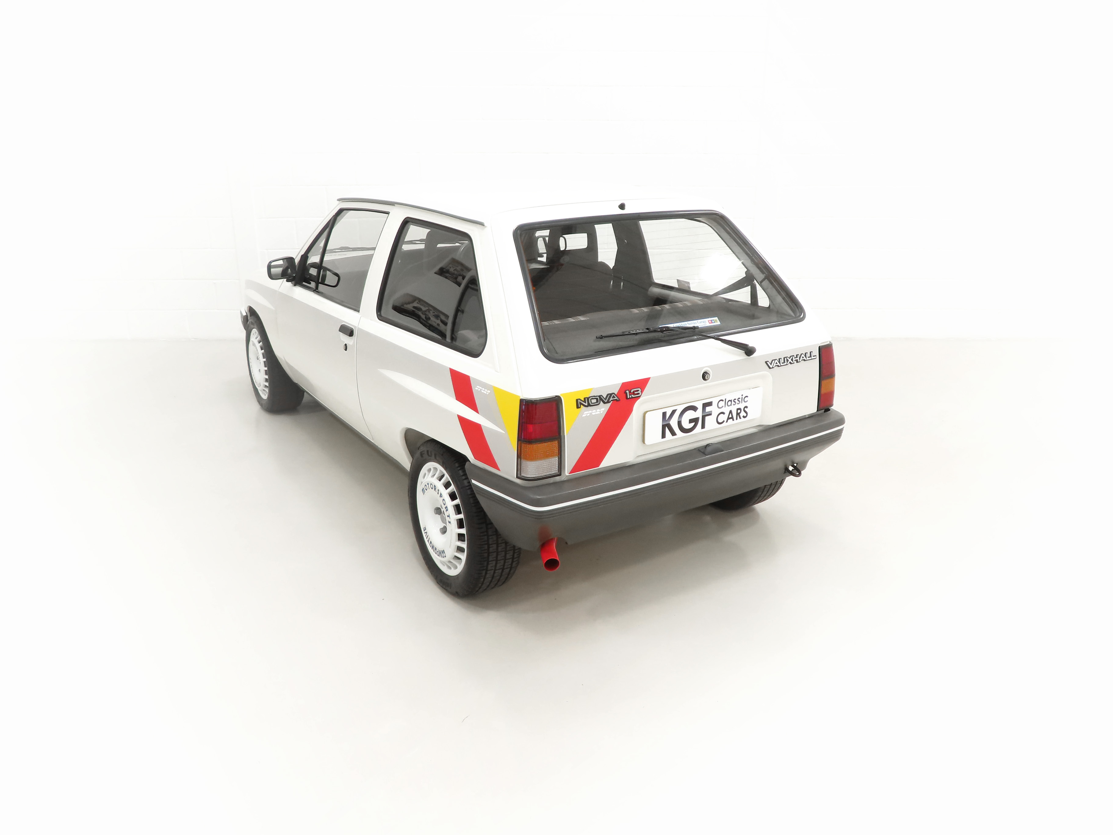 A rather special Nova quickly distinguished from the exclusive, striking, carefully co-ordinated ‘Sports’ livery and standard red performance Ashley exhaust silencer. All 500 homologation specials were finished in Polar White, (Code E452), and this authenticated example is exemplary in all exterior attributes. From the unmarked glossy rich paint, correct trim and detailed underside, this is not just a show winner on Group A rally stages! The early round lock rear tailgate, correct bumpers, gutter trim and even unobtainable sill decals are fitted, all documented in a photographic laminated restoration album. Supplying dealer number plates, rear screen sticker and even tax disc holder are fitted. This stonking example is fit for the finest of iconic car collections.