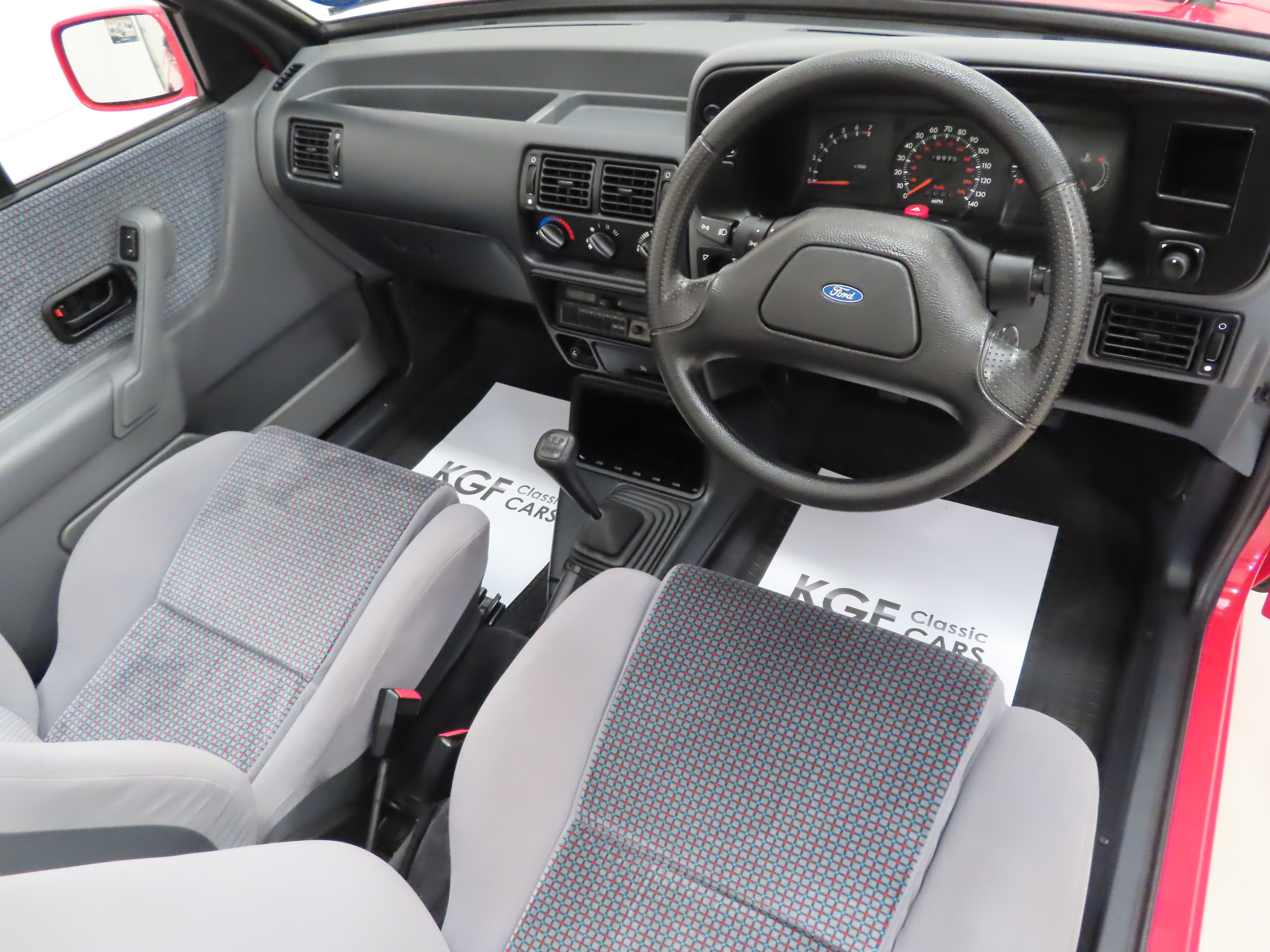 With seating for up to five people, this model remains both a fun and practical option of open-top classic motoring. The supportive sports seats trimmed with Zolda fabric in Shadow colour scheme, (Code LU), are in outstanding condition and the colour keyed shark grey cut pile carpet has been protected from new by genuine Ford tailored ‘waffle’ rubber mats. Several spare supplying dealer A.W.&.D. Hammond branded paper floor mats have been reproduced for show purposes and the boot carpet has a clear film protective cover. The door cards show no notable wear to the handles or shrinkage to the armrest sections that is commonly associated with the model. The dashboard and switchgear are in superb order and all functions and controls operate including the standard Ford ESRT 32 PS radio/cassette with electric aerial and the roof mounted digital clock. The sports two-spoke steering wheel and gear knob still have natural veins visible thanks to the low miles. 1980’s Ford interior perfection!