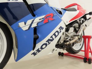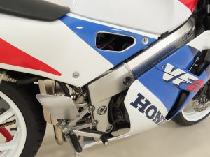 The VFR400R’s compact liquid cooled V4 engine has smooth power with full torque to produce exhilarating performance. Being a matching numbers UK example, it is a full power unrestricted model with 63bhp and standard in all respects. Recent and expensive works by renown NC30 specialists, JTR Technica Ltd confirm UK standard E3FA carburettor, needles and jets and optimal running. Advanced features such as two-part radiator to assist cooling, oil cooler and 360° firing order producing a wonderful exhaust note, all add to the thrill on a bike only weighing 176kg. The Race-inspired close-ratio six-speed gearbox utilises every ounce of power.