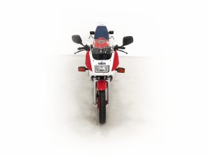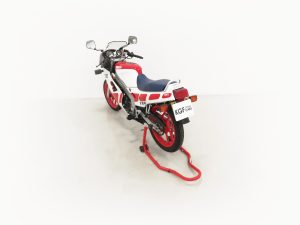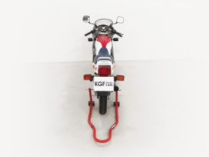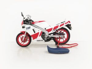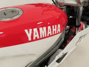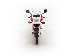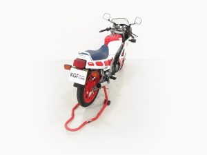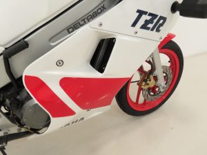 Following on from the traditions of Yamaha’s famous RD models but taking on groundbreaking technology, the TZR125 was yet another world-beating supersports lightweight machine. This exceptional specimen is finished in the red and white colour scheme that the bike and the optional full fairing was made with. Many components of this example are unrestored with the exception of the stunning paintwork to the tank and fairings that was entrusted to renowned Pauls Custom Paintwork of West Kingsdown who specialises in ‘all paint no stickers’ finishing. The white is done in Pearl finish so, at a glance, it appears standard but in sunlight it looks amazing with a pearl fleck. Originality is seen extensively with the original olive drab green finish to fittings as well as factory switchgear, hand grips and foot peg rubbers. The windscreen shows some faint stress crazing to the top section. Light patina to the unrestored components is fully acceptable and the bike showcases the perfect mix of pleasing originality and flawless paintwork. The seat is professionally retrimmed in the correct blue covering, underneath which is the original Yamaha toolkit. This is a very special bike.