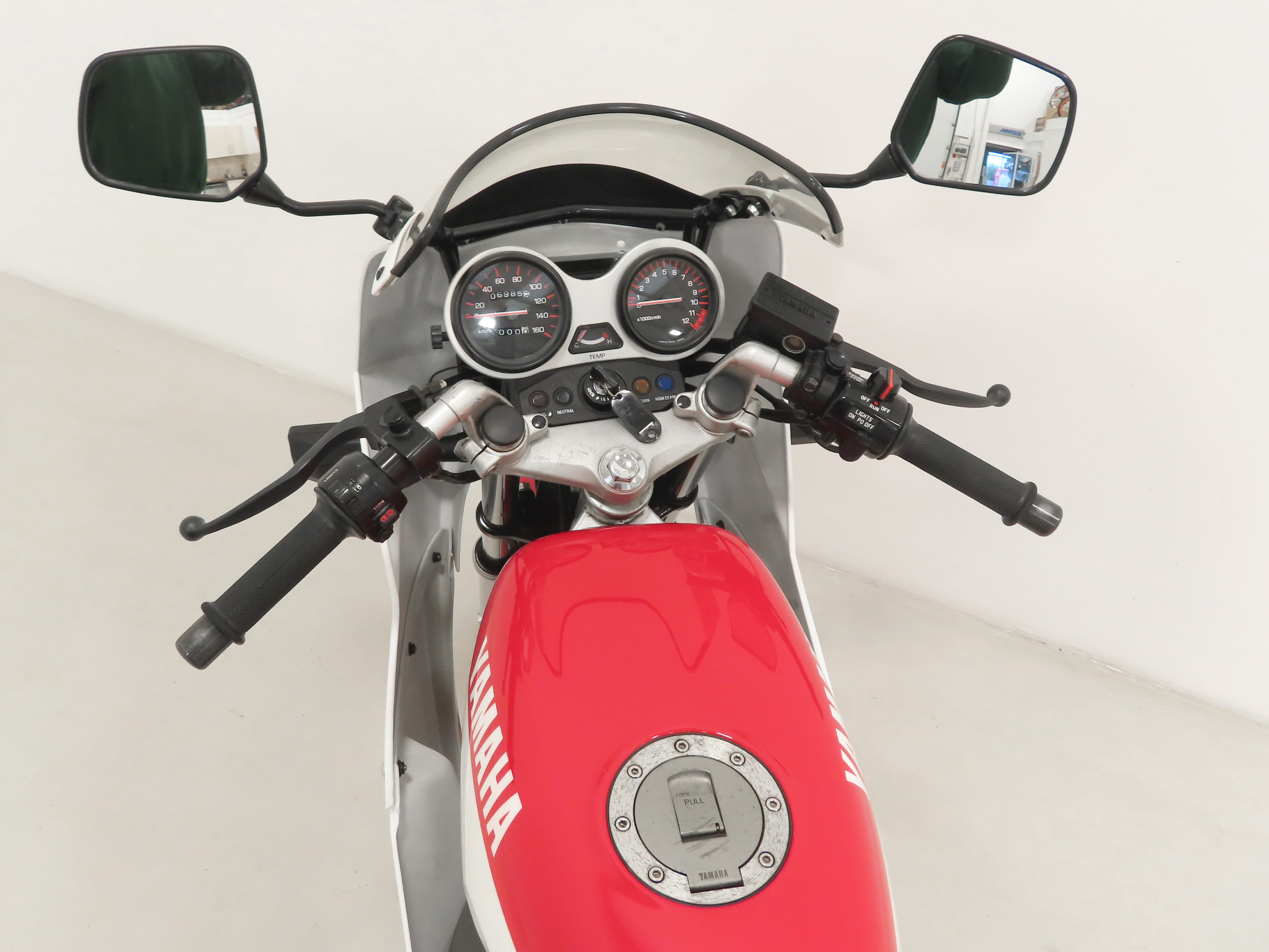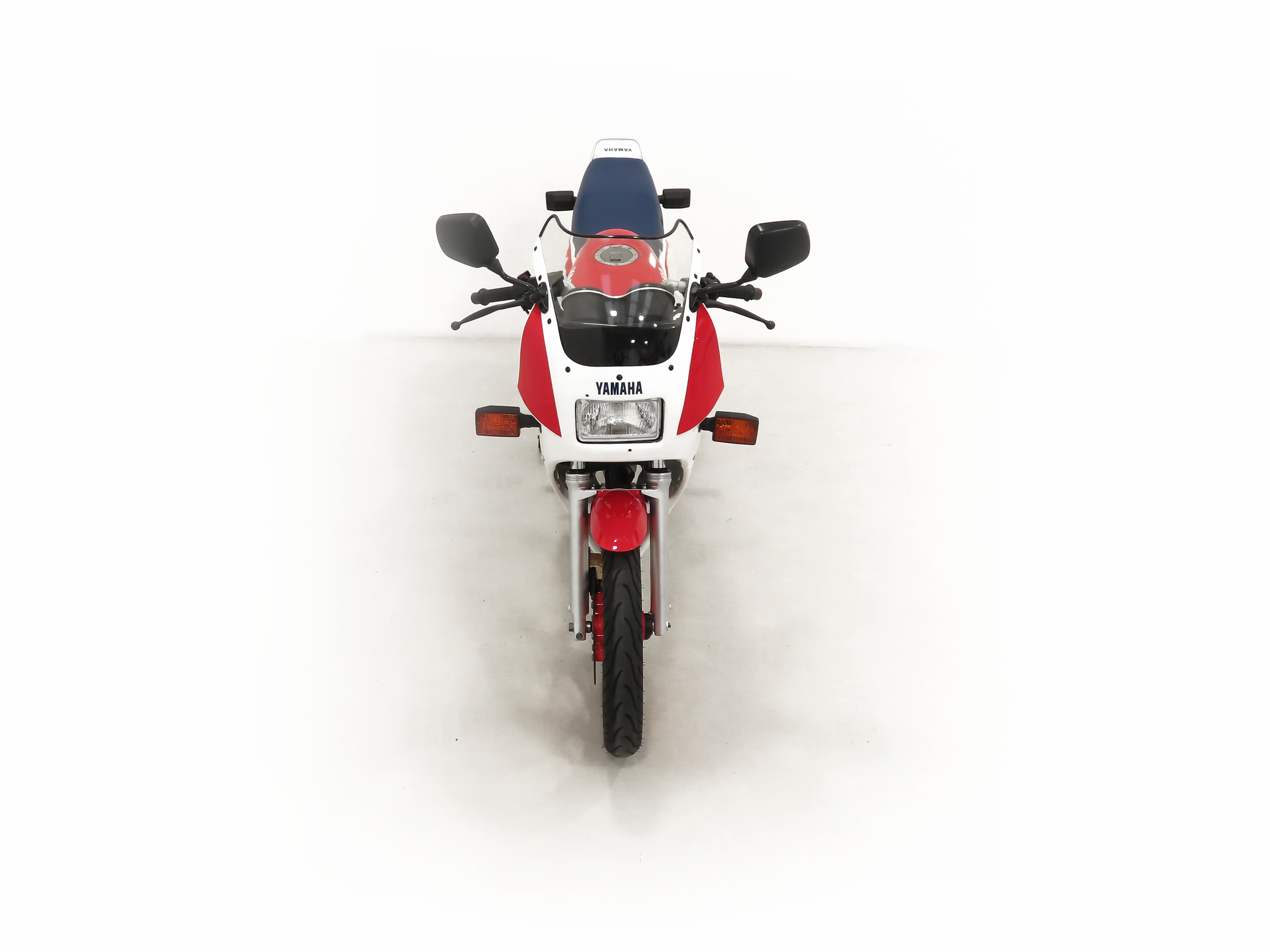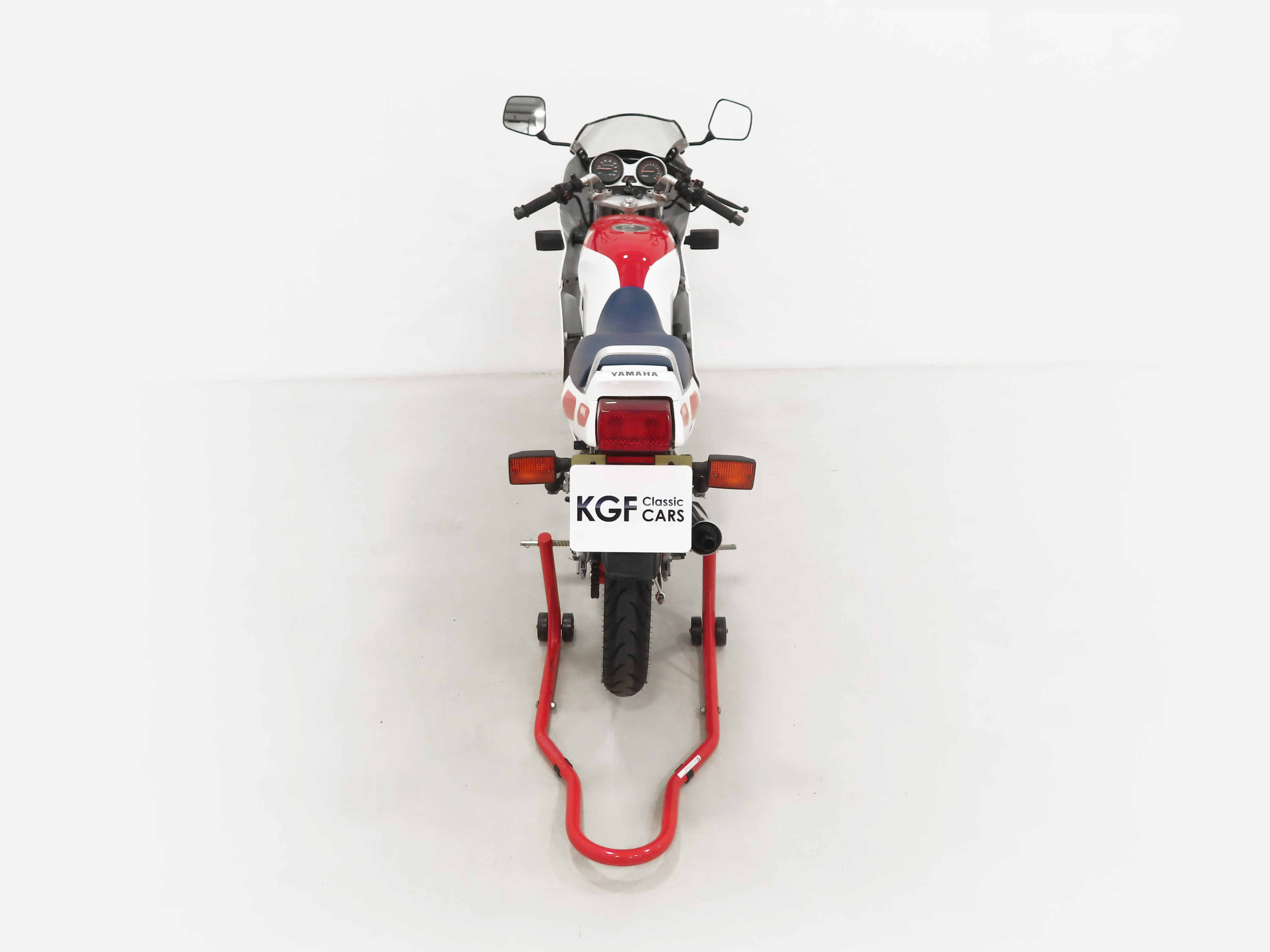 DELTABOX frame fabricated from high-quality steel pressings, Monocross suspension with box-section high-tensile steel swinging arm, De Carbon-type shock absorber, racer-style clip-on handlebars, rectangular headlight, windscreen, twin rear view mirrors, 12 litre fuel tank with flush-fitting aircraft-type cap, square tube passenger grab rail, cast alloy triple-spoke wheels, YEIS (Yamaha Energy Induction System) boost chamber, YPVS (Yamaha Power Valve System), liquid cooling, speedometer, tachometer, water temperature gauge, ignition switch incorporating park light, turn signal switch, headlight switch, neutral indicator, horn, steering lock, rear footrests, locking helmet holder. Factory Options: Full fairing kit.