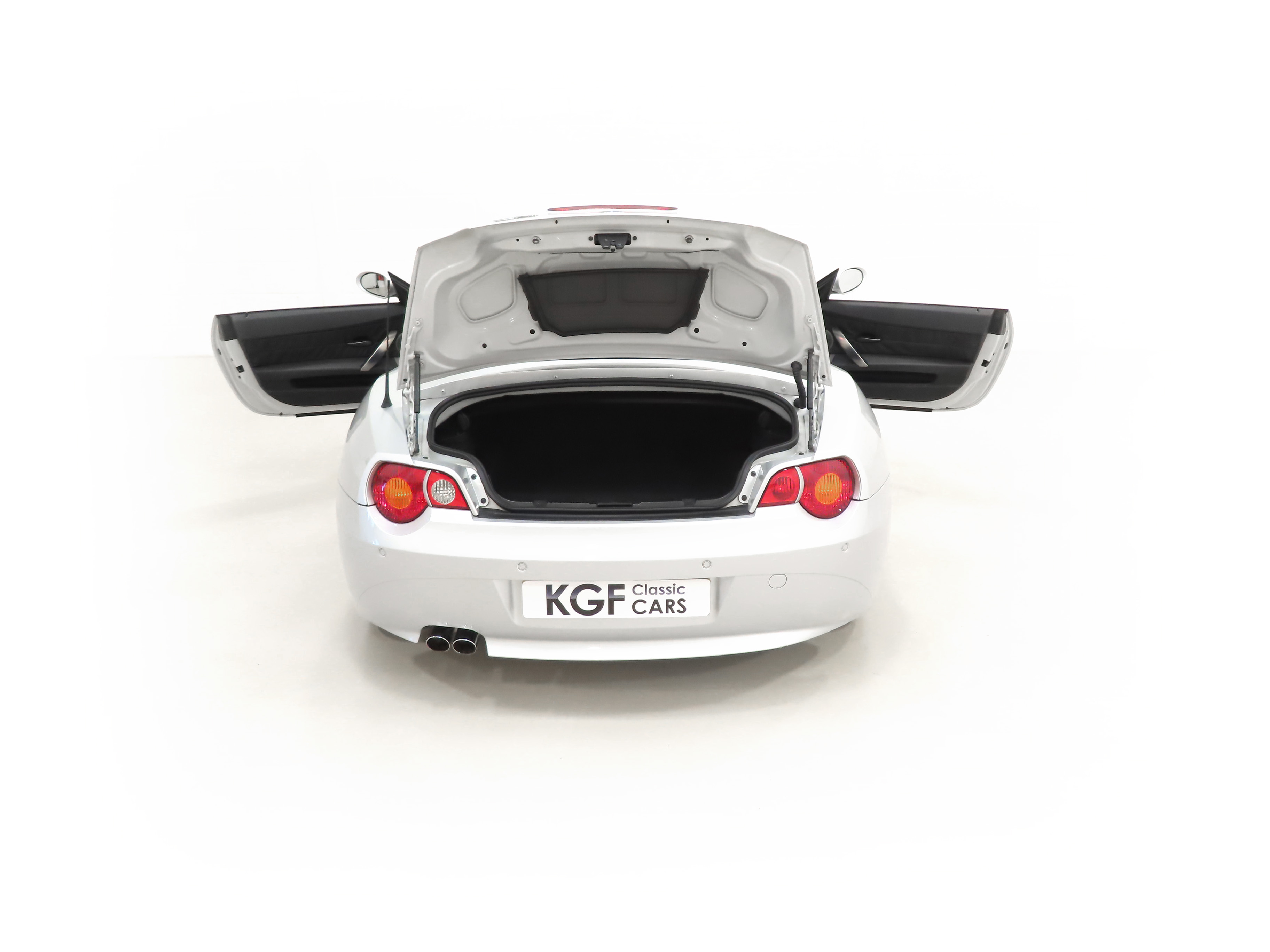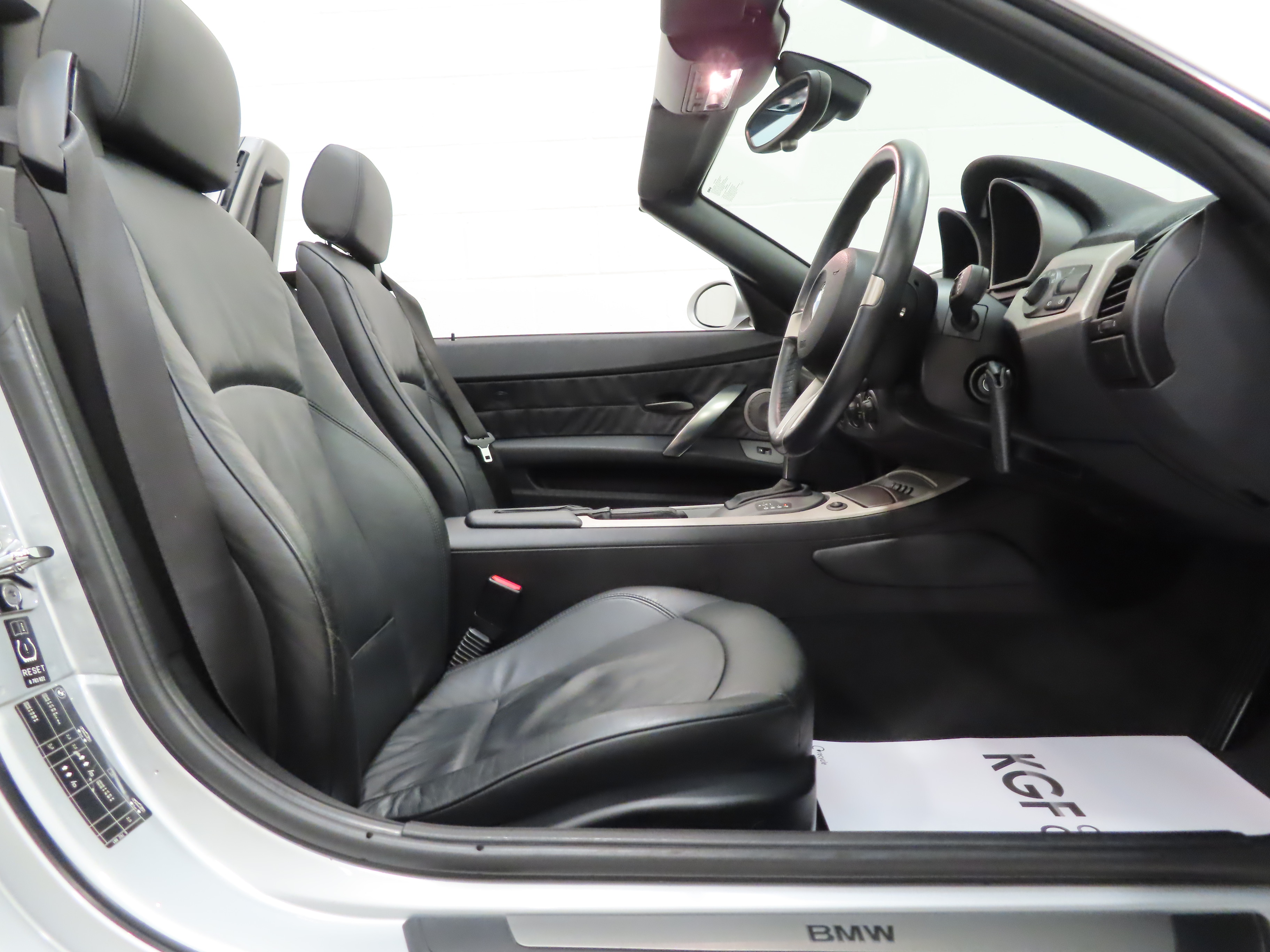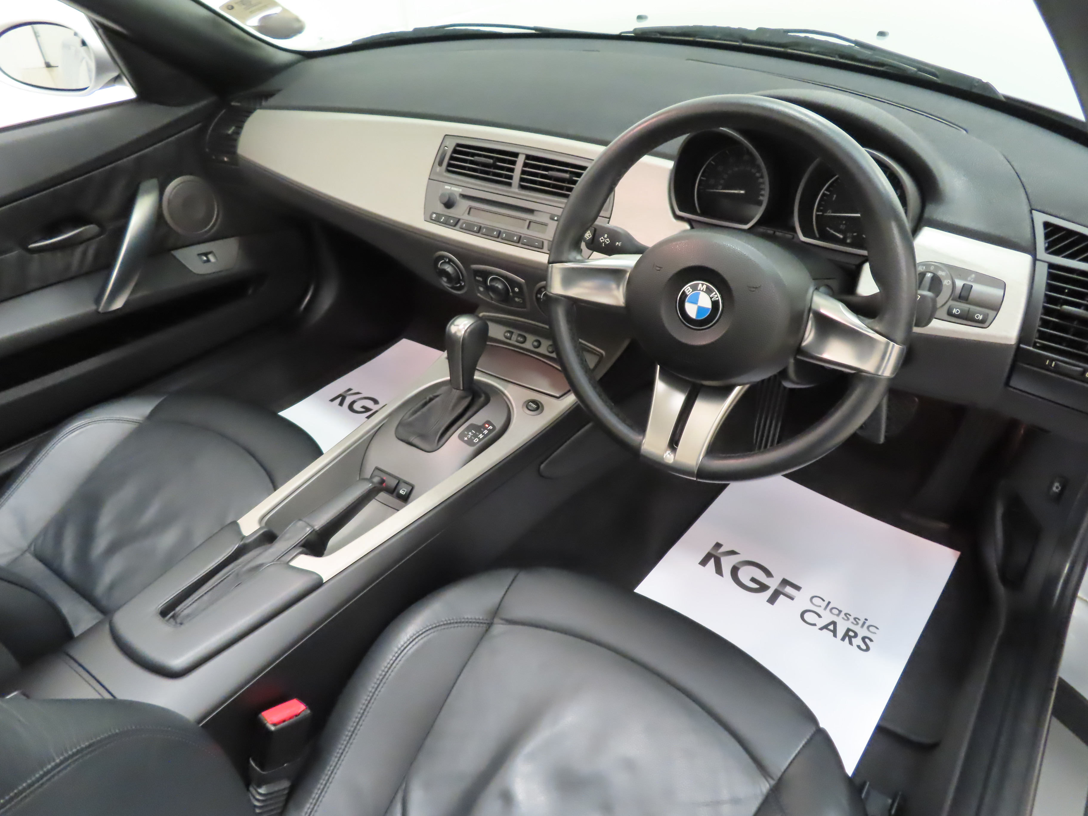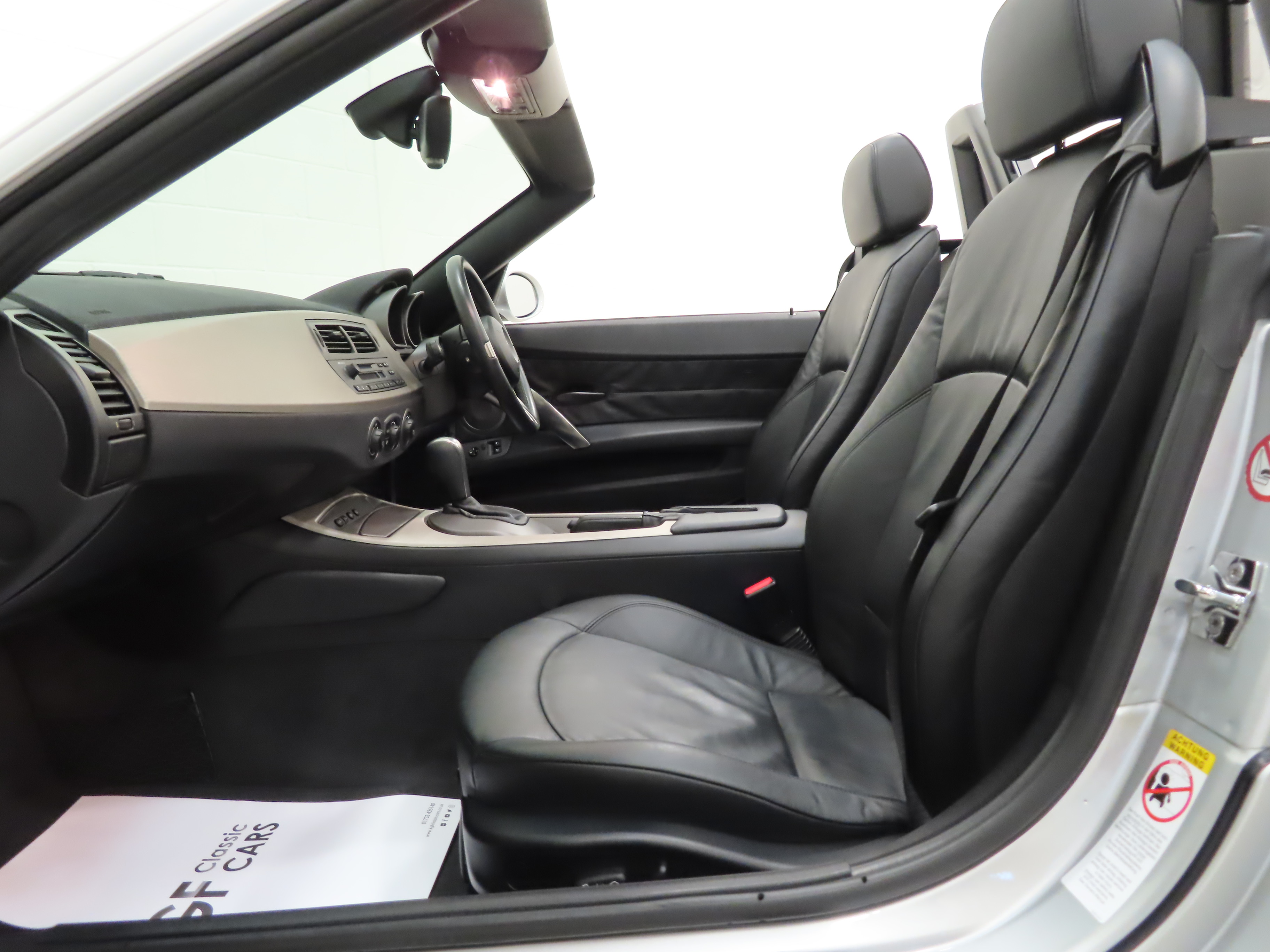With its extended aluminium lightweight bonnet, long wheelbase, short overhangs and low-slung stance, this range topping Z4 3.0i Roadster looks stunning finished in flawless Titanium Silver Metallic, (Code 354). A Black contrasting electric hood is spotless and with a touch of a button, open and closes in only 10 seconds! All trim sections and crystal-clear factory optional Xenon lights are as new and being the 3.0i, the kidney slats come in matt graphite and headlight surrounds in matt chrome. Supplying BMW main dealer number plates and front screen tax disc holder remain fitted. The underside and all wheel arch apertures are incredibly clean. An early and beautifully preserved example of this Anders Warming design classic and indeed, a modern classic already established.